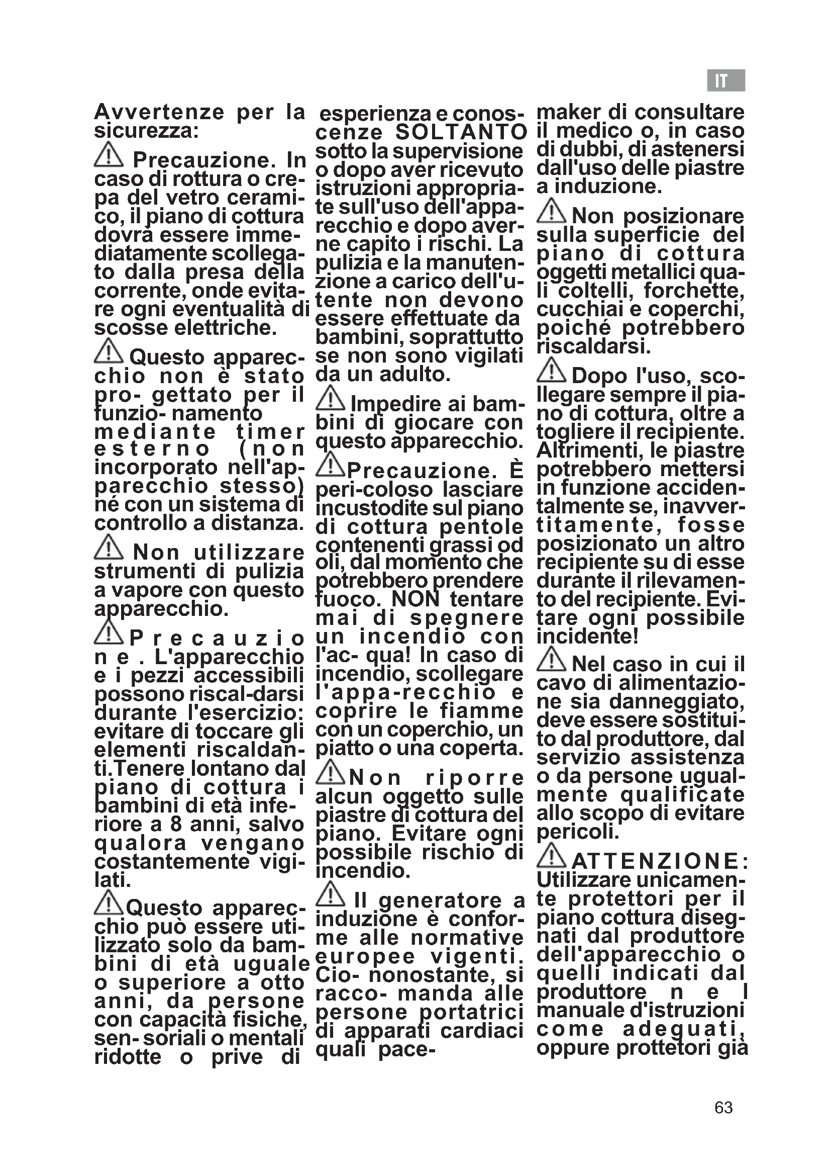 Avvertenze per la sicurezza: Precauzione. In caso di rottura o cre- pa del vetro cerami- co, il piano di cottura dovrà essere imme- diatamente scollega- to dalla presa della corrente, onde evita- re ogni eventualità di scosse elettriche. Questo apparec- chio non è stato pro- gettato per il funzio- namento mediante timer esterno (non incorporato nell'ap- parecchio stesso) né con un sistema di controllo a distanza. Non utilizzare strumenti di pulizia a vapore con questo apparecchio. P r e c a u z i o n e . L'apparecchio e i pezzi accessibili possono riscal-darsi durante l'esercizio: evitare di toccare gli elementi riscaldan- ti.Tenere lontano dal piano di cottura i bambini di età infe- riore a 8 anni, salvo qualora vengano costantemente vigi- lati. Questo apparec- chio può essere uti- lizzato solo da bam- bini di età uguale o superiore a otto anni, da persone con capacità siche, sen- soriali o mentali ridotte o prive di esperienza e conos- cenze SOLTANTO sotto la supervisione o dopo aver ricevuto istruzioni appropria- te sull'uso dell'appa- recchio e dopo aver- ne capito i rischi. La pulizia e la manuten- zione a carico dell'u- tente non devono essere eettuate da bambini, soprattutto se non sono vigilati da un adulto. Impedire ai bam- bini di giocare con questo apparecchio. Precauzione. È peri-coloso lasciare incustodite sul piano di cottura pentole contenenti grassi od oli, dal momento che potrebbero prendere fuoco. NON tentare mai di spegnere un incendio con l'ac- qua! In caso di incendio, scollegare l'appa-recchio e coprire le fiamme con un coperchio, un piatto o una coperta. Non riporre alcun oggetto sulle piastre di cottura del piano. Evitare ogni possibile rischio di incendio. Il generatore a induzione è confor- me alle normative europee vigenti. Cio- nonostante, si racco- manda alle persone portatrici di apparati cardiaci quali pace- maker di consultare il medico o, in caso di dubbi, di astenersi dall'uso delle piastre a induzione. Non posizionare sulla supercie del piano di cottura oggetti metallici qua- li coltelli, forchette, cucchiai e coperchi, poiché potrebbero riscaldarsi. Dopo l'uso, sco- llegare sempre il pia- no di cottura, oltre a togliere il recipiente. Altrimenti, le piastre potrebbero mettersi in funzione acciden- talmente se, inavver- titamente, fosse posizionato un altro recipiente su di esse durante il rilevamen- to del recipiente. Evi- tare ogni possibile incidente! Nel caso in cui il cavo di alimentazio- ne sia danneggiato, deve essere sostitui- to dal produttore, dal servizio assistenza o da persone ugual- mente qualificate allo scopo di evitare pericoli. AT T E N Z I O N E : Utilizzare unicamen- te protettori per il piano cottura diseg- nati dal produttore dell'apparecchio o quelli indicati dal produttore n e l manuale d'istruzioni come adeguati, oppure prottetori giàIT