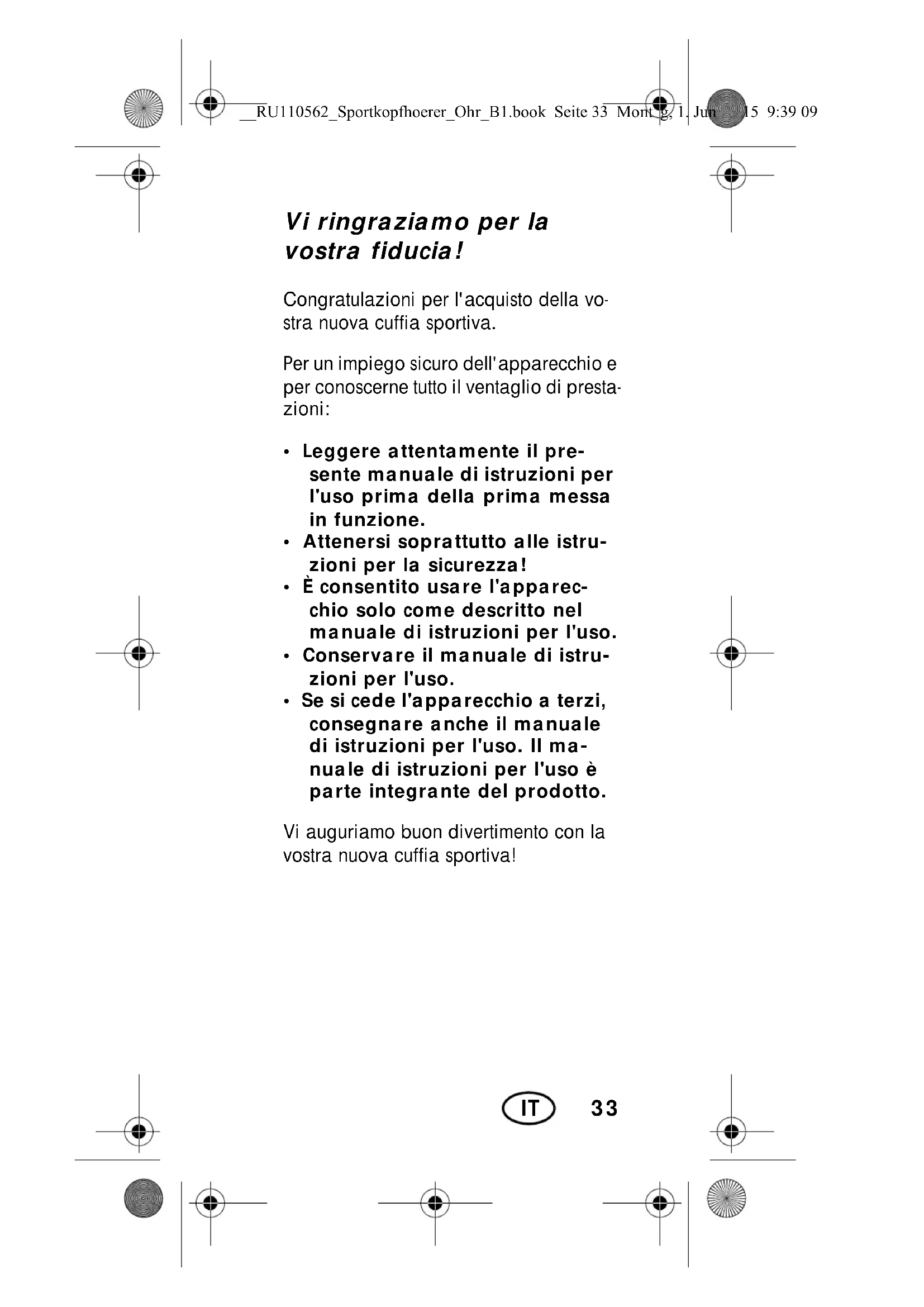 Vi ringraziamo per la vostra fiducia! Congratulazioni per l'acquisto della vo- stra nuova cuffia sportiva. Per un impiego sicuro dell'apparecchio e per conoscerne tutto il ventaglio di presta- zioni: