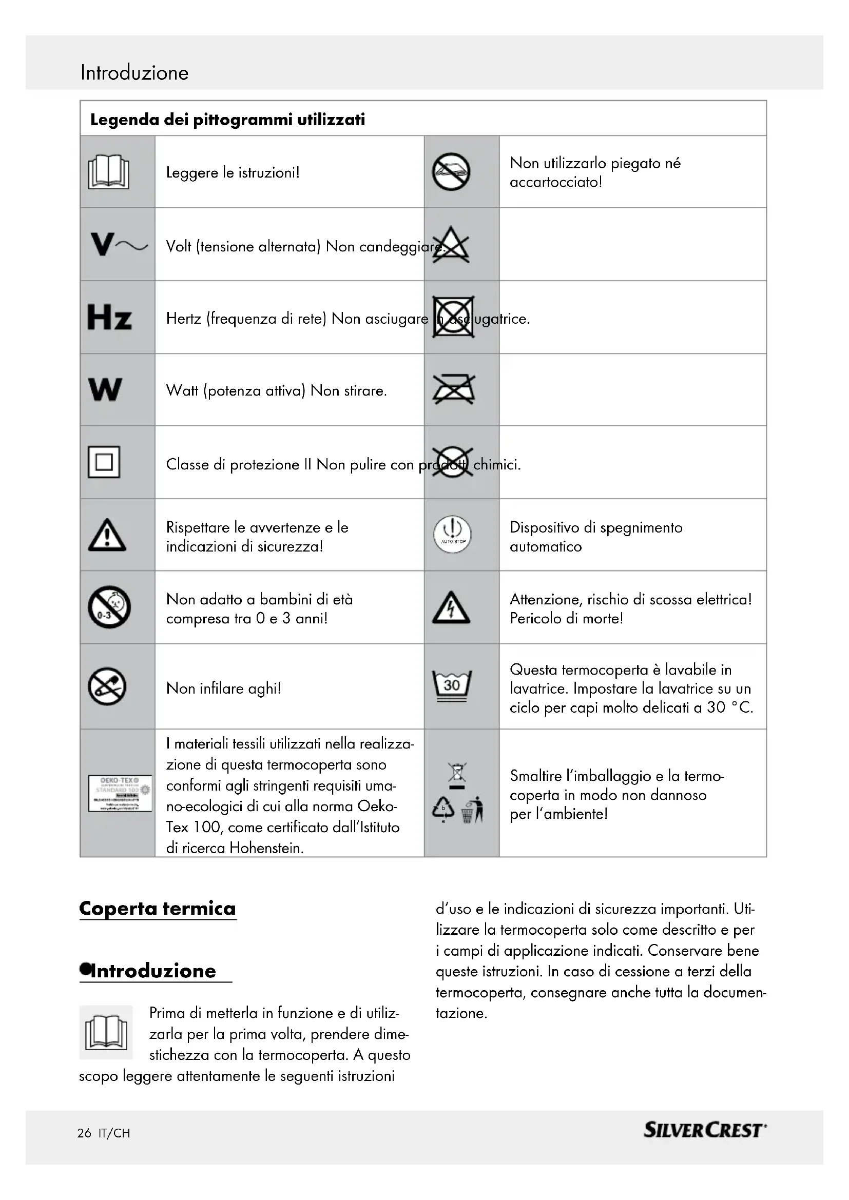 Smaltire l’imballaggio e la termo- coperta in modo non dannoso per l‘ambiente! Coperta termica Introduzione Prima di metterla in funzione e di utiliz- zarla per la prima volta, prendere dime- stichezza con la termocoperta. A questo scopo leggere attentamente le seguenti istruzioni d‘uso e le indicazioni di sicurezza importanti. Uti- lizzare la termocoperta solo come descritto e per i campi di applicazione indicati. Conservare bene queste istruzioni. In caso di cessione a terzi della termocoperta, consegnare anche tutta la documen- tazione.27 IT/CH Introduzione / Importanti indicazioni di sicurezzaIntroduzione Utilizzo conforme Questa termocoperta è destinata al riscaldamento del corpo umano. Essa deve essere utilizzata sola- mente per coprire, non per sdraiarvisi sopra. Questa termocoperta non è destinata all’utilizzo in ospe- dali o per utilizzi di carattere commerciale. In parti- colare è vietato riscaldare neonati, bambini piccoli, persone insensibili al calore o non autosufficienti nonché animali. Un utilizzo diverso da quello pre- cedentemente descritto o una modifica della termo- coperta non sono ammessi e possono provocare lesioni a persone e / o danneggiamenti della termo- coperta stessa. Il produttore non si assume alcuna responsabilità per eventuali danni determinati da un utilizzo non conforme alle indicazioni fornite. Descrizione dei componenti