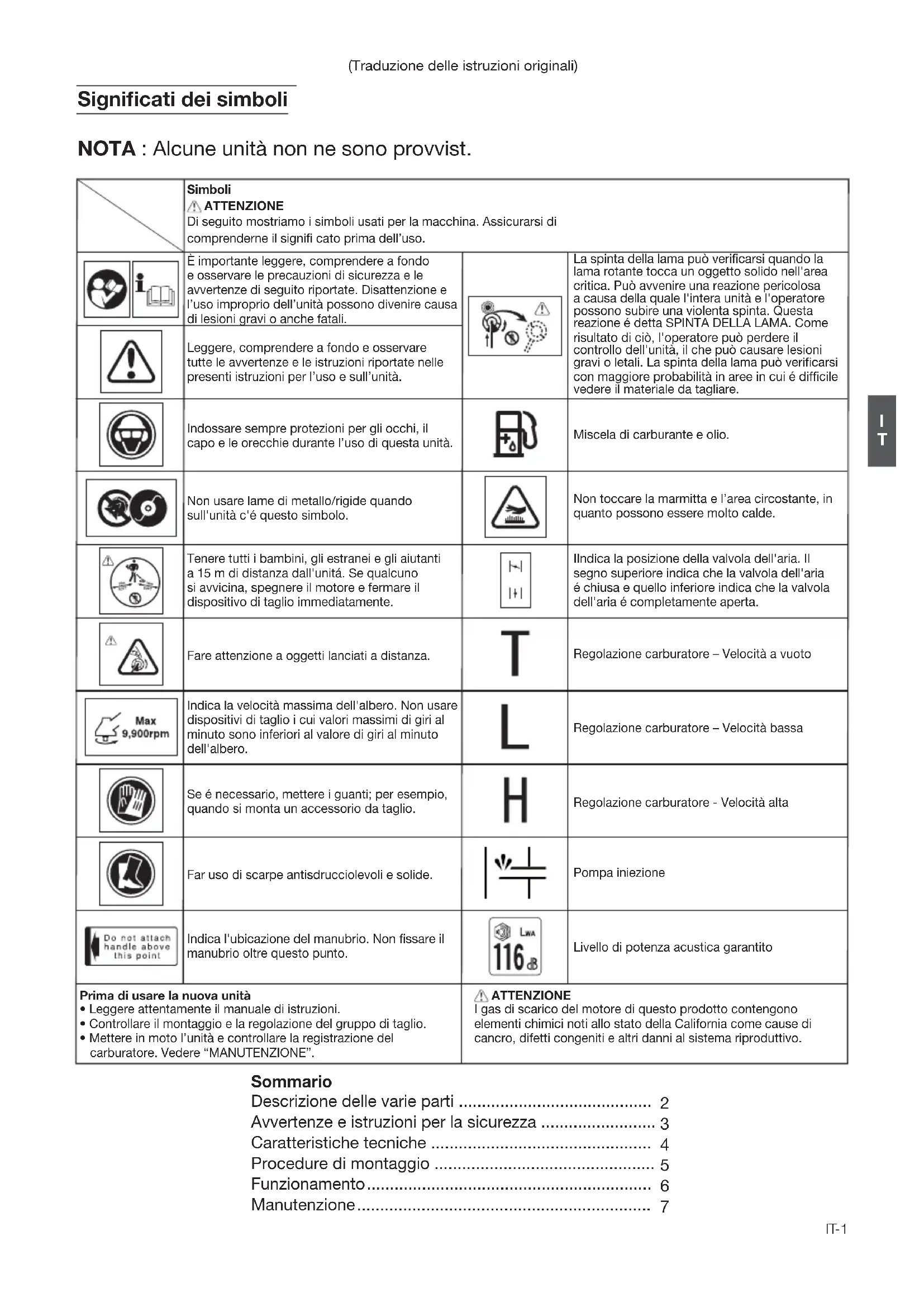 - Mettere in moto l’unità e controllare la registrazione del carburatore. Vedere “MANUTENZIONE”. ATTENZIONE I gas di scarico del motore di questo prodotto contengono elementi chimici noti allo stato della California come cause di cancro, difetti congeniti e altri danni al sistema riproduttivo. Sommario Descrizione delle varie parti .......................................... Avvertenze e istruzioni per la sicurezza ......................... Caratteristiche tecniche ................................................ Procedure di montaggio ................................................ Funzionamento .............................................................. Manutenzione ................................................................