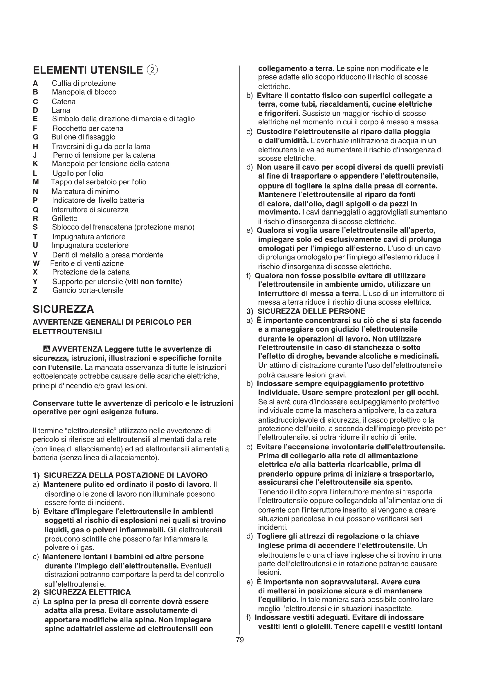 A Cua di protezione B Manopola di blocco C Catena D Lama E Simbolo della direzione di marcia e di taglio F Rocchetto per catena G Bullone di ssaggio H Traversini di guida per la lama J Perno di tensione per la catena K Manopola per tensione della catena L Ugello per l’olio M Tappo del serbatoio per l’olio N Marcatura di minimo P Indicatore del livello batteria Q Interruttore di sicurezza R Grilletto S Sblocco del frenacatena (protezione mano) T Impugnatura anteriore U Impugnatura posteriore V Denti di metallo a presa mordente W Feritoie di ventilazione X Protezione della catena Y Supporto per utensile (viti non fornite) Z Gancio porta-utensile SICUREZZA