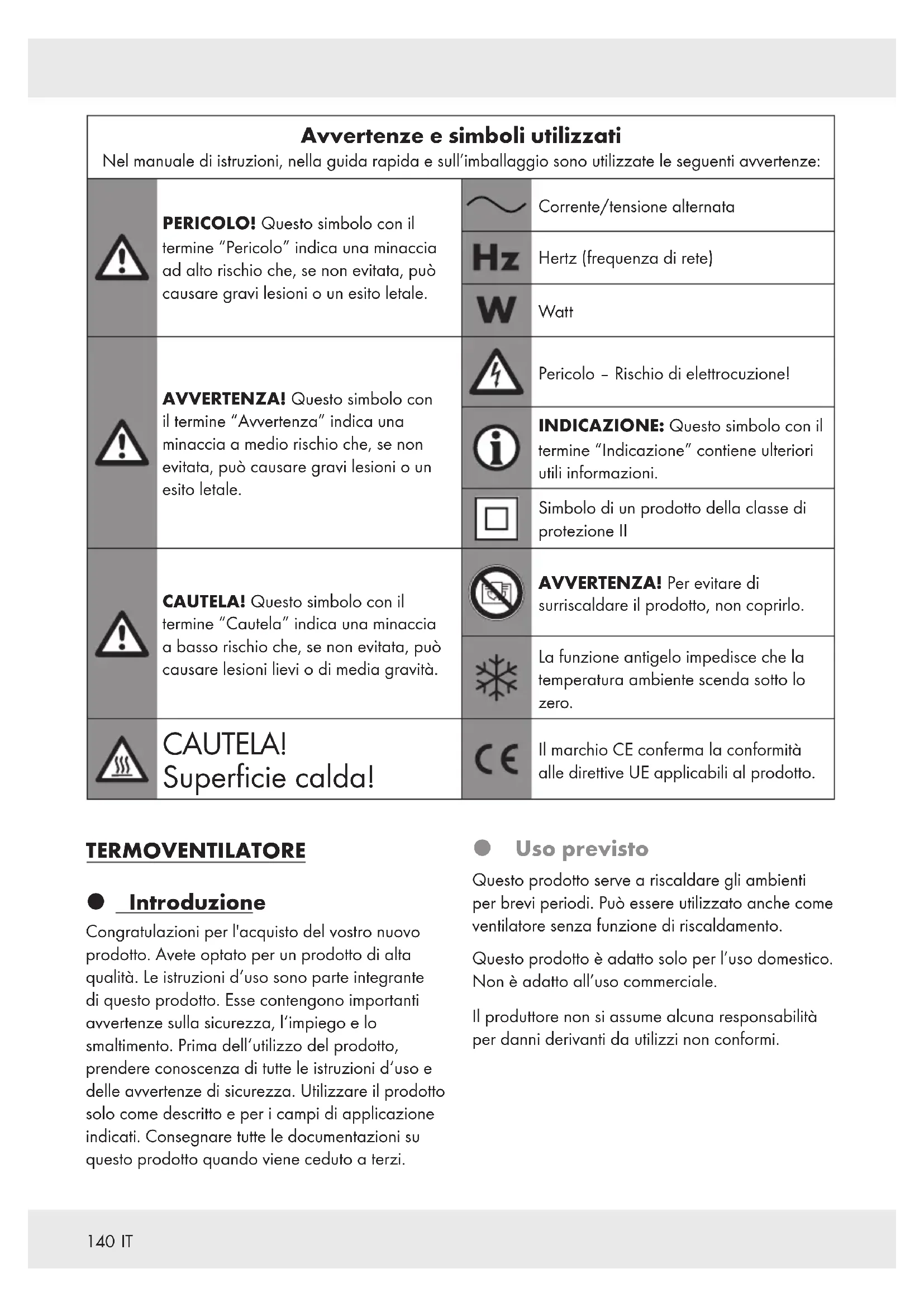 Avvertenze e simboli utilizzati Nel manuale di istruzioni, nella guida rapida e sull’imballaggio sono utilizzate le seguenti avvertenze: PERICOLO! Questo simbolo con il termine “Pericolo” indica una minaccia ad alto rischio che, se non evitata, può causare gravi lesioni o un esito letale. Corrente/tensione alternata Hertz (frequenza di rete) Watt AVVERTENZA! Questo simbolo con il termine “Avvertenza” indica una minaccia a medio rischio che, se non evitata, può causare gravi lesioni o un esito letale. Pericolo– Rischio di elettrocuzione! INDICAZIONE: Questo simbolo con il termine “Indicazione” contiene ulteriori utili informazioni. Simbolo di un prodotto della classe di protezione II CAUTELA! Questo simbolo con il termine “Cautela” indica una minaccia a basso rischio che, se non evitata, può causare lesioni lievi o di media gravità. AVVERTENZA! Per evitare di surriscaldare il prodotto, non coprirlo. La funzione antigelo impedisce che la temperatura ambiente scenda sotto lo zero. CAUTELA! Superficie calda! Il marchio CE conferma la conformità alle direttive UE applicabili al prodotto. TERMOVENTILATORE Introduzione Congratulazioni per l'acquisto del vostro nuovo prodotto. Avete optato per un prodotto di alta qualità. Le istruzioni d‘uso sono parte integrante di questo prodotto. Esse contengono importanti avvertenze sulla sicurezza, l‘impiego e lo smaltimento. Prima dell‘utilizzo del prodotto, prendere conoscenza di tutte le istruzioni d‘uso e delle avvertenze di sicurezza. Utilizzare il prodotto solo come descritto e per i campi di applicazione indicati. Consegnare tutte le documentazioni su questo prodotto quando viene ceduto a terzi. Uso previsto Questo prodotto serve a riscaldare gli ambienti per brevi periodi. Può essere utilizzato anche come ventilatore senza funzione di riscaldamento. Questo prodotto è adatto solo per l’uso domestico. Non è adatto all’uso commerciale. Il produttore non si assume alcuna responsabilità per danni derivanti da utilizzi non conformi.141