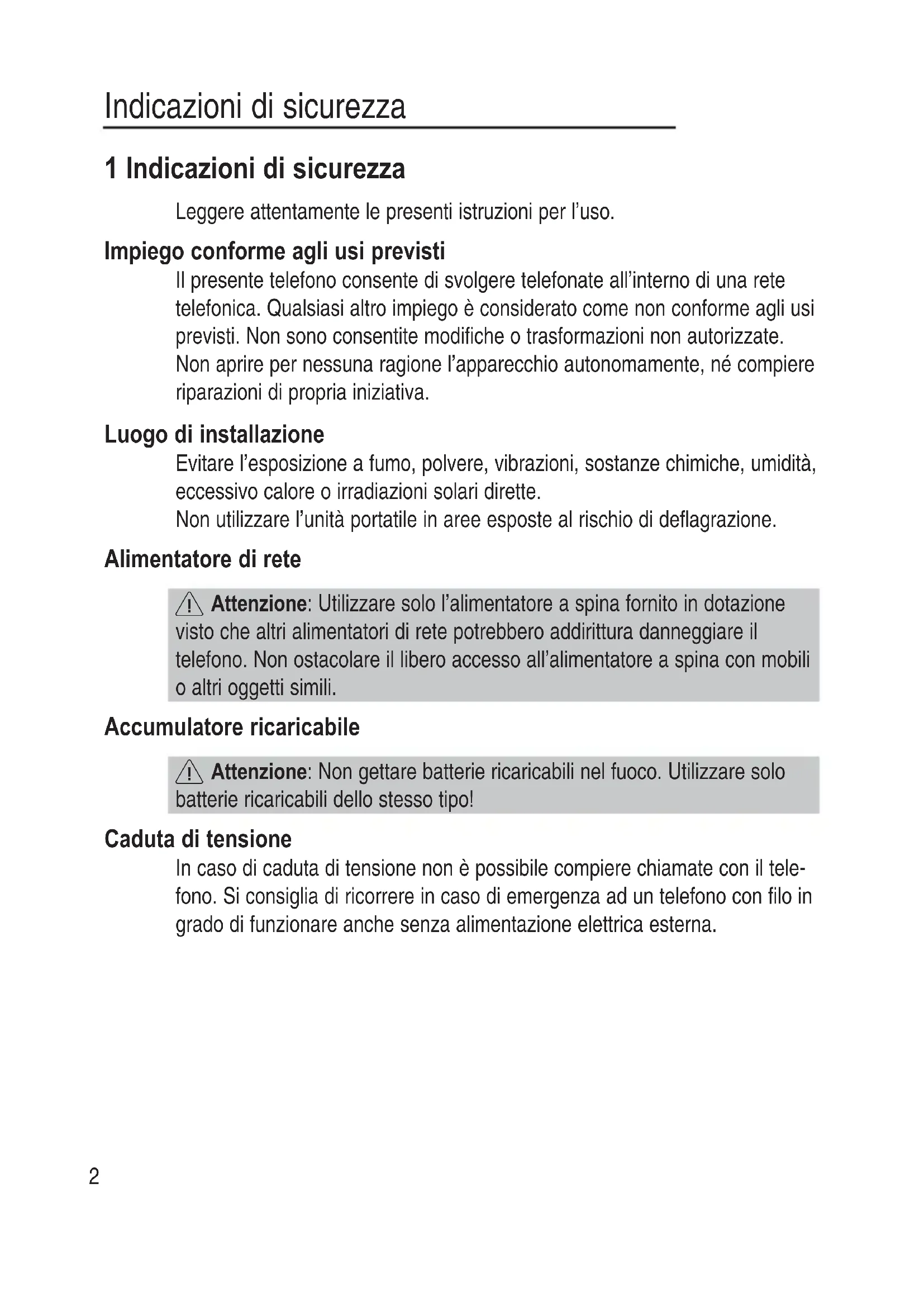 Il presente Telefono consente di svolgere Telefonate all'interno di una rete Telefonica. Qualsiasi altro impiego è considerato come non conforme agli usi previsti. Non sono consentite modifiche o trasformazioni non autorizzate. Non aprire per nessuna ragione l'apparecchio autonomamente, né compiere riparazioni di propria iniziativa.