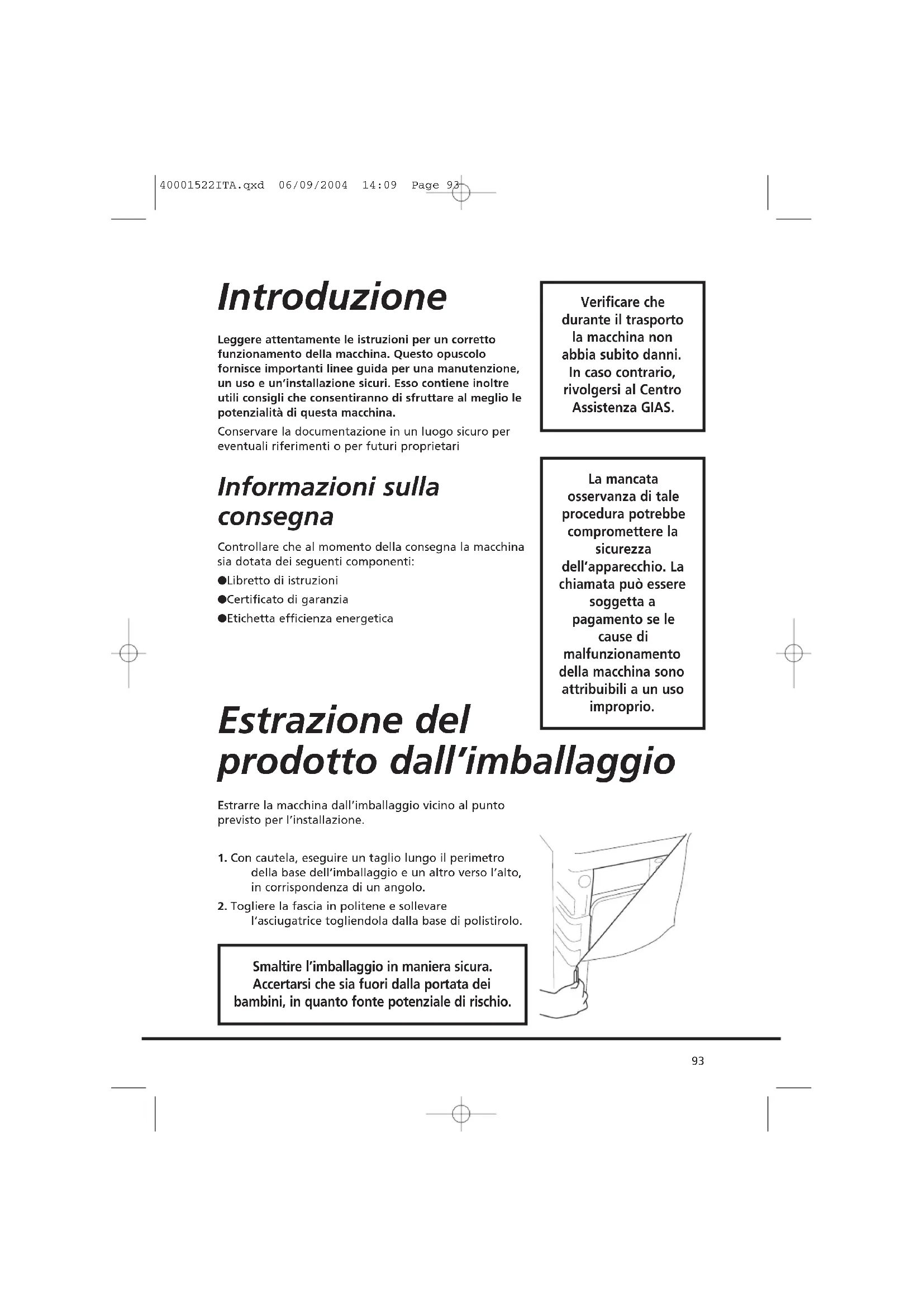 Leggere attendamente le istruzioni per un corretto funzionamento della macchina. Questo opuscolo fornisce importanti linee guida per una manutenzione, un uso e un'installazione sicuri. Esso contiene inoltre utili consigli che consentiranno di sfruttare al meglio le potenzialità di quella macchina.
