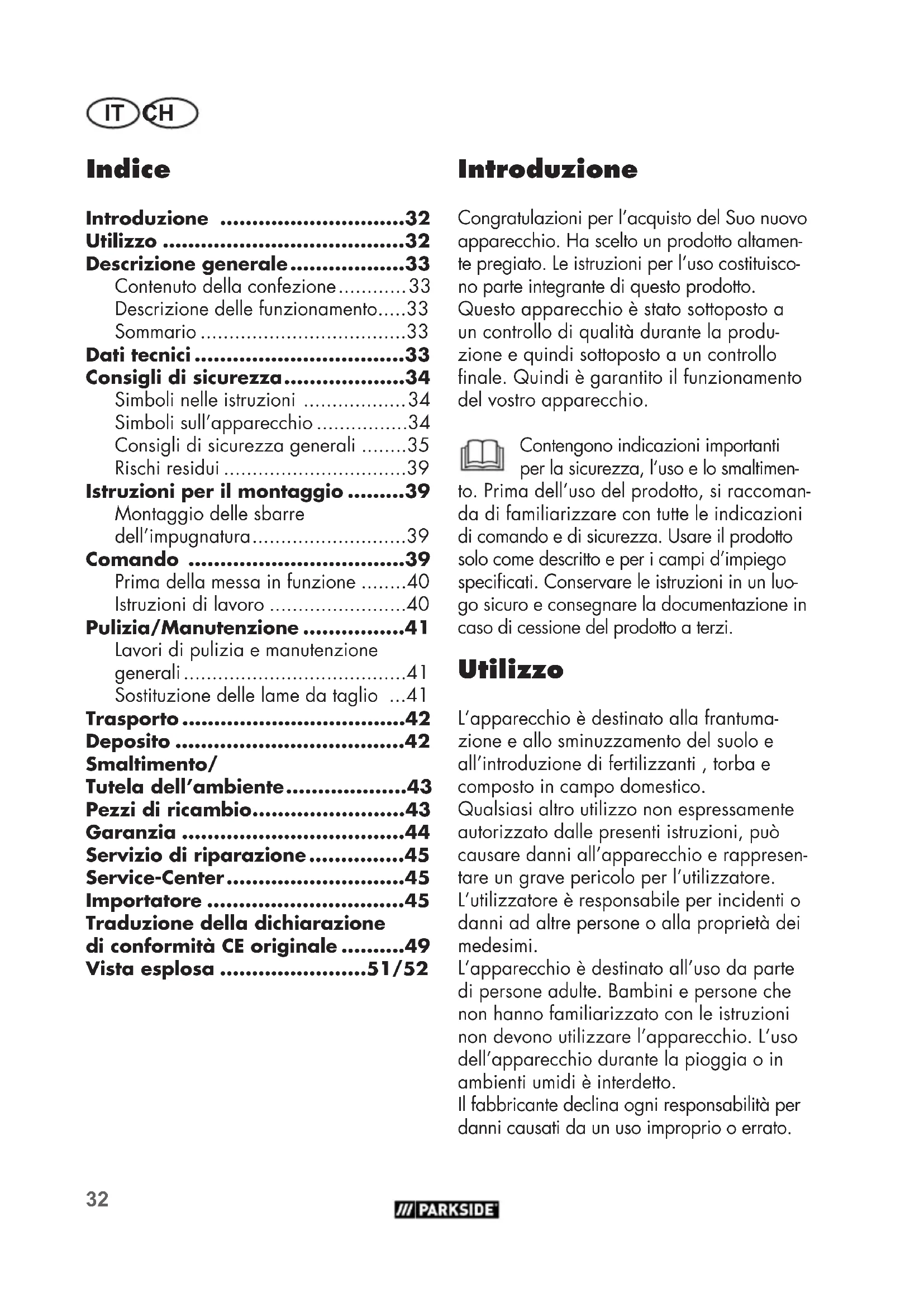 - Service Suisse Tel.: 0842 665566 (0,08 CHF/Min., mobile max. 0,40 CHF/Min.) E-Mail: grizzly@lidl.ch IAN 356305_2004 Importeur Veuillez noter que l’adresse suivante n’est pas une adresse de service après-vente. Contactez d’abord le service après-vente cité plus haut. Grizzly Tools GmbH & Co. KG Stockstädter Straße 20 63762 Großostheim Allemagne www.grizzly-service.eu32 IT CH Introduzione Congratulazioni per l’acquisto del Suo nuovo apparecchio. Ha scelto un prodotto altamen- te pregiato. Le istruzioni per l’uso costituisco- no parte integrante di questo prodotto. Questo apparecchio è stato sottoposto a un controllo di qualità durante la produ- zione e quindi sottoposto a un controllo nale. Quindi è garantito il funzionamento del vostro apparecchio. Contengono indicazioni importanti per la sicurezza, l’uso e lo smaltimen- to. Prima dell’uso del prodotto, si raccoman- da di familiarizzare con tutte le indicazioni di comando e di sicurezza. Usare il prodotto solo come descritto e per i campi d’impiego specicati. Conservare le istruzioni in un luo- go sicuro e consegnare la documentazione in caso di cessione del prodotto a terzi. Utilizzo L’apparecchio è destinato alla frantuma- zione e allo sminuzzamento del suolo e all’introduzione di fertilizzanti , torba e composto in campo domestico. Qualsiasi altro utilizzo non espressamente autorizzato dalle presenti istruzioni, può causare danni all’apparecchio e rappresen- tare un grave pericolo per l’utilizzatore. L’utilizzatore è responsabile per incidenti o danni ad altre persone o alla proprietà dei medesimi. L’apparecchio è destinato all’uso da parte di persone adulte. Bambini e persone che non hanno familiarizzato con le istruzioni non devono utilizzare l’apparecchio. L’uso dell’apparecchio durante la pioggia o in ambienti umidi è interdetto. Il fabbricante declina ogni responsabilità per danni causati da un uso improprio o errato. Indice Introduzione p. 32