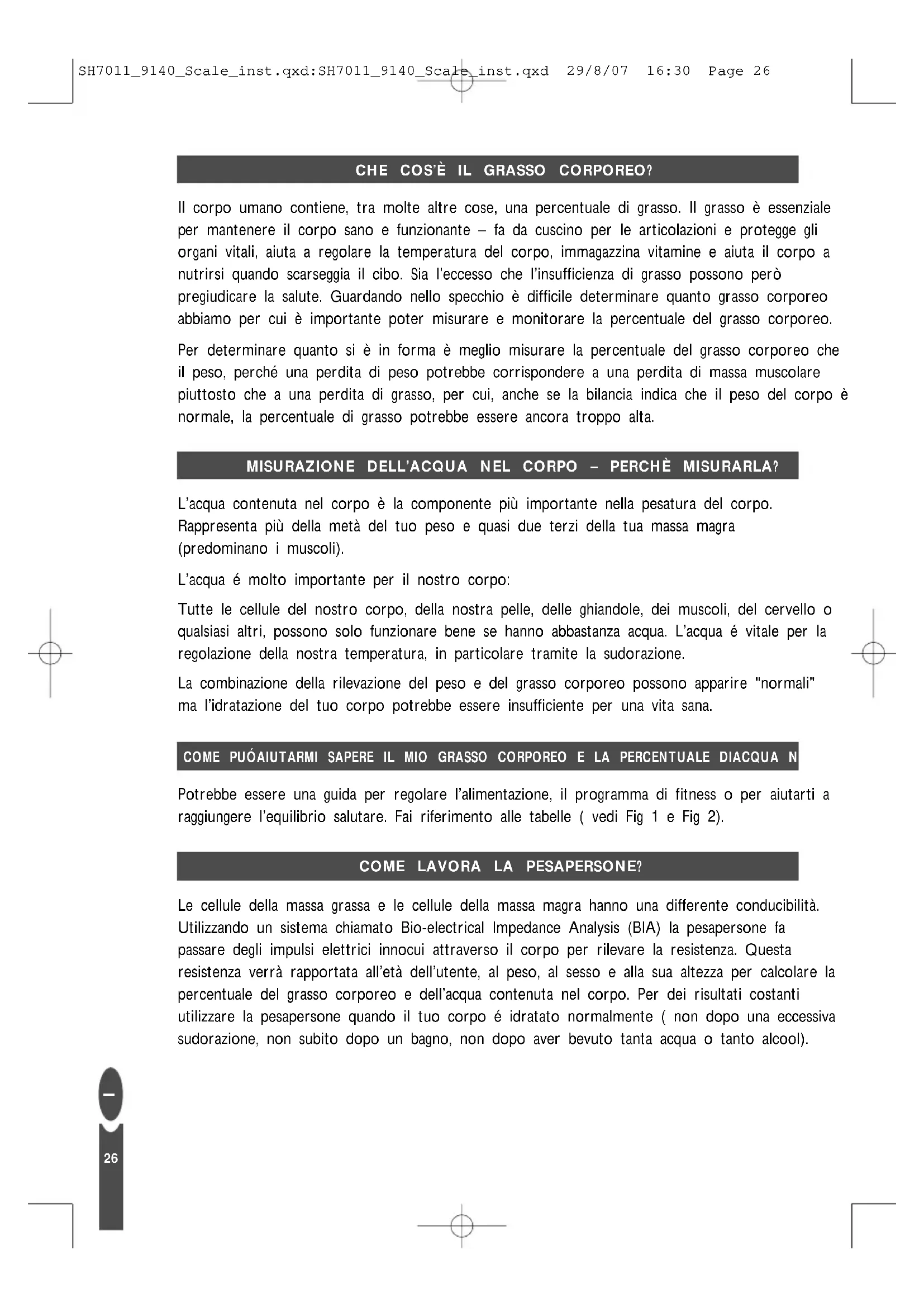 er mantenere il corpo sano e funzionante – fa da cuscino per le articolazioni e protegge gli organi vitali, aiuta a regolare la temperatura del corpo, immagazzina vitamine e aiuta il corpo a nutrirsi quando scarseggia il cibo. Sia l’eccesso che l’insufficienza di grasso possono però pregiudicare la salute. Guardando nello specchio è difficile determinare quanto grasso corporeo abbiamo per cui è importante poter misurare e monitorare la percentuale del grasso corporeo. Per determinare quanto si è in forma è meglio misurare la percentuale del grasso corporeo che il peso, perché una perdita di peso potrebbe corrispondere a una perdita di massa muscolare piuttosto che a una perdita di grasso, per cui, anche se la bilancia indica che il peso del corpo è normale, la percentuale di grasso potrebbe essere ancora troppo alta. CHE COS’È IL GRASSO CORPOREO? L’acqua contenuta nel corpo è la componente più importante nella pesatura del corpo. Rappresenta più della metà del tuo peso e quasi due terzi della tua massa magra (predominano i muscoli). L’acqua é molto importante per il nostro corpo: Tutte le cellule del nostro corpo, della nostra pelle, delle ghiandole, dei muscoli, del cervello o qualsiasi altri, possono solo funzionare bene se hanno abbastanza acqua. L’acqua é vitale per la regolazione della nostra temperatura, in particolare tramite la sudorazione. La combinazione della rilevazione del peso e del grasso corporeo possono apparire "normali" ma l’idratazione del tuo corpo potrebbe essere insufficiente per una vita sana. MISURAZIONE DELL’ACQUA NEL CORPO – PERCHÈ MISURARLA? Potrebbe essere una guida per regolare l’alimentazione, il programma di fitness o per aiutarti a raggiungere l’equilibrio salutare. Fai riferimento alle tabelle ( vedi Fig 1 e Fig 2). COME PUÓAIUTARMI SAPERE IL MIO GRASSO CORPOREO E LA PERCENTUALE DIACQUA NEL MIO CORPO? Le cellule della massa grassa e le cellule della massa magra hanno una differente conducibilità. Utilizzando un sistema chiamato Bio-electrical Impedance Analysis (BIA) la pesapersone fa passare degli impulsi elettrici innocui attraverso il corpo per rilevare la resistenza. Questa resistenza verrà rapportata all’età dell’utente, al peso, al sesso e alla sua altezza per calcolare la percentuale del grasso corporeo e dell’acqua contenuta nel corpo. Per dei risultati costanti utilizzare la pesapersone quando il tuo corpo é idratato normalmente ( non dopo una eccessiva sudorazione, non subito dopo un bagno, non dopo aver bevuto tanta acqua o tanto alcool). COME LAVORA LA PESAPERSONE? SH7011_9140_Scale_inst.qxd:SH7011_9140_Scale_inst.qxd 29/8/07 16:30 Page 26I