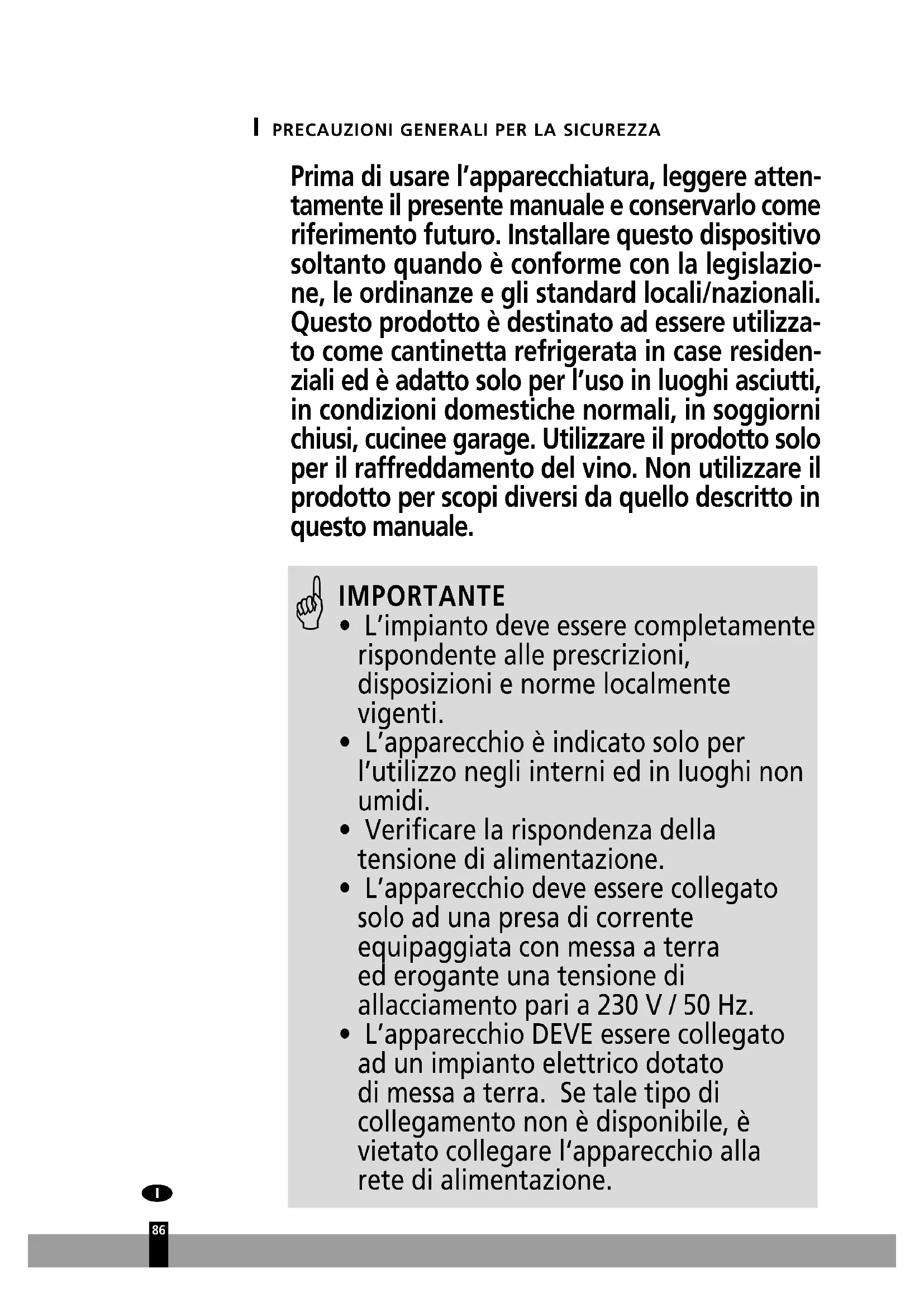 Prima di usare l’apparecchiatura, leggere atten- tamente il presente manuale e conservarlo come riferimento futuro. Installare questo dispositivo soltanto quando è conforme con la legislazio- ne, le ordinanze e gli standard locali/nazionali. Questo prodotto è destinato ad essere utilizza- to come cantinetta refrigerata in case residen- ziali ed è adatto solo per l’uso in luoghi asciutti, in condizioni domestiche normali, in soggiorni chiusi, cucinee garage. Utilizzare il prodotto solo per il raffreddamento del vino. Non utilizzare il prodotto per scopi diversi da quello descritto in questo manuale.