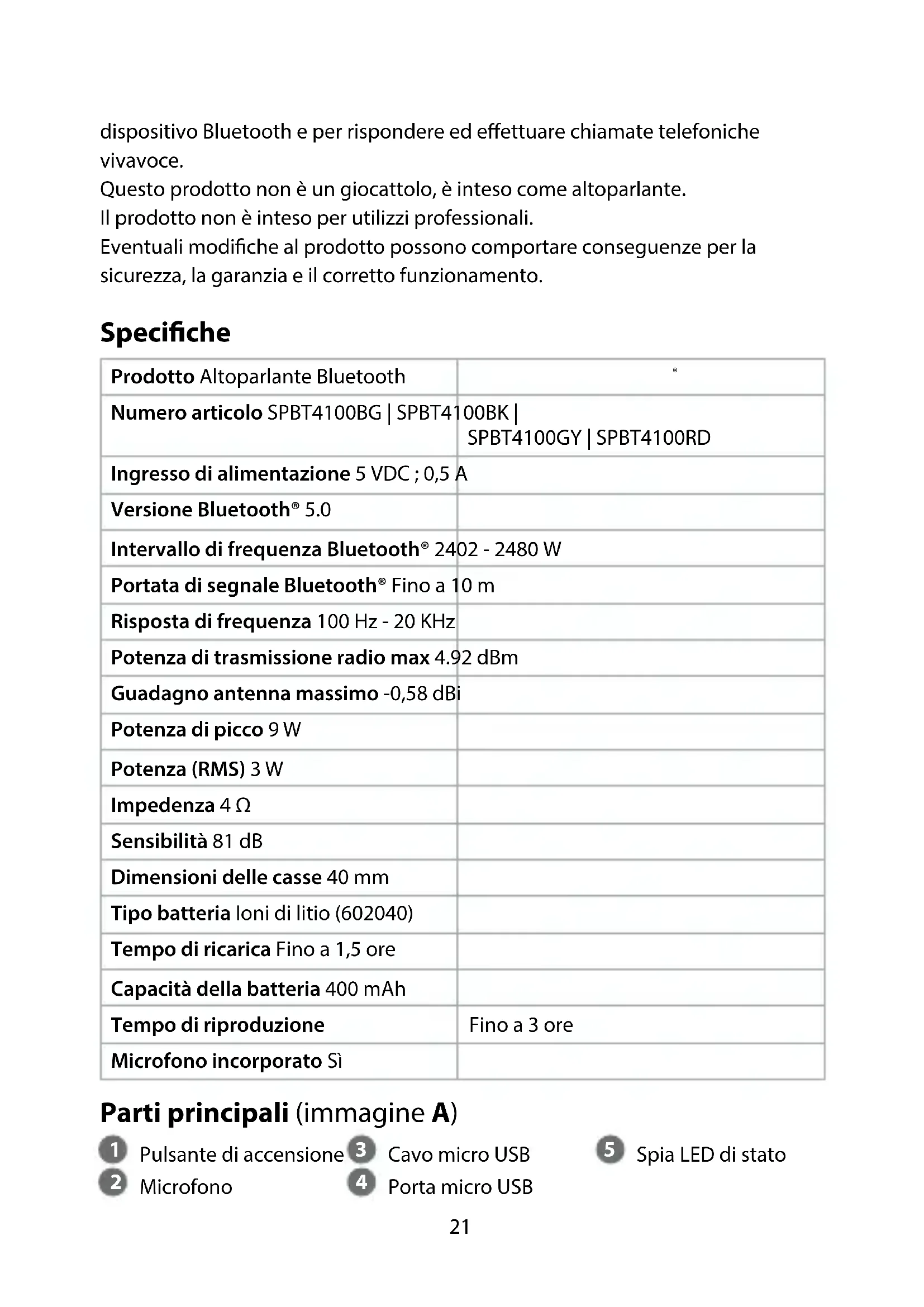 Ingresso di alimentazione 5 VDC ; 0,5 A Versione Bluetooth® 5.0 Intervallo di frequenza Bluetooth® 2402 - 2480 W Portata di segnale Bluetooth® Fino a 10 m Risposta di frequenza 100 Hz - 20 KHz Potenza di trasmissione radio max 4.92 dBm Guadagno antenna massimo -0,58 dBi Potenza di picco 9 W Potenza (RMS) 3 W Impedenza 4 Ω Sensibilità 81 dB Dimensioni delle casse 40 mm Tipo batteria Ioni di litio (602040) Tempo di ricarica Fino a 1,5 ore Capacità della batteria 400 mAh Tempo di riproduzione Fino a 3 ore Microfono incorporato Sì Parti principali (immagine A)