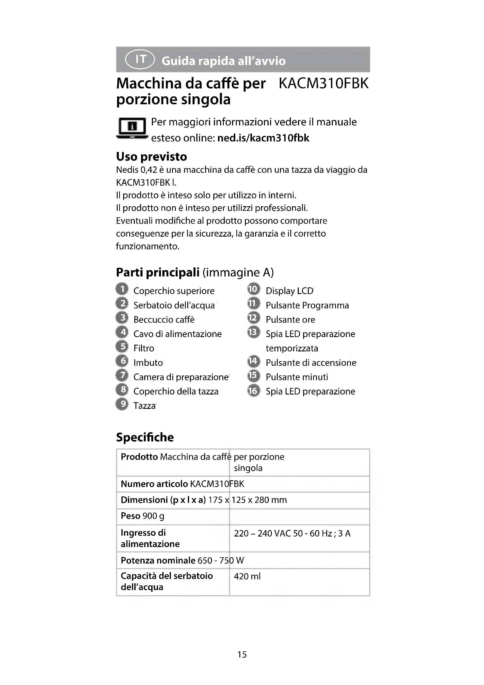 Guida rapida all’avvio Macchina da caè per porzione singola KACM310FBK Per maggiori informazioni vedere il manuale esteso online: ned.is/kacm310fbk Uso previsto Nedis 0,42 è una macchina da caè con una tazza da viaggio da KACM310FBK l. Il prodotto è inteso solo per utilizzo in interni. Il prodotto non è inteso per utilizzi professionali. Eventuali modiche al prodotto possono comportare conseguenze per la sicurezza, la garanzia e il corretto funzionamento. Parti principali (immagine A)