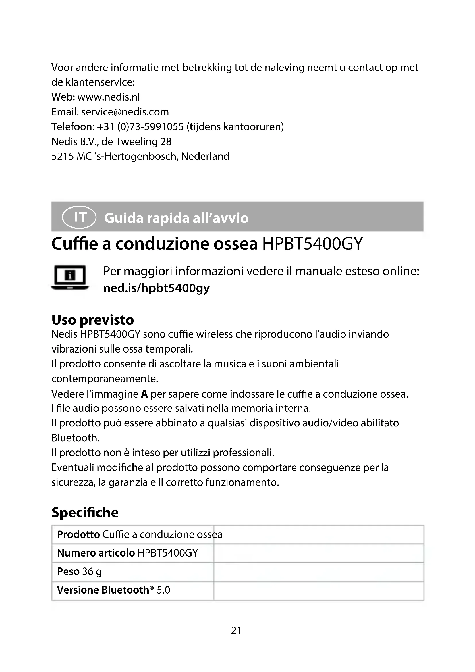 Guida rapida all’avvio Cue a conduzione ossea HPBT5400GY Per maggiori informazioni vedere il manuale esteso online: ned.is/hpbt5400gy Uso previsto Nedis HPBT5400GY sono cue wireless che riproducono l’audio inviando vibrazioni sulle ossa temporali. Il prodotto consente di ascoltare la musica e i suoni ambientali contemporaneamente. Vedere l’immagine A per sapere come indossare le cue a conduzione ossea. I le audio possono essere salvati nella memoria interna. Il prodotto può essere abbinato a qualsiasi dispositivo audio/video abilitato Bluetooth. Il prodotto non è inteso per utilizzi professionali. Eventuali modiche al prodotto possono comportare conseguenze per la sicurezza, la garanzia e il corretto funzionamento. Speciche Prodotto Cue a conduzione ossea Numero articolo HPBT5400GY Peso 36 g Versione Bluetooth® 5.022 Intervallo di frequenza Bluetooth® 2403 - 2480 MHz Potenza di trasmissione radio max 2 dBm Distanza di trasmissione Fino a 10 m (senza barriere) Risposta di frequenza 20 - 20000 Hz Impedenza 8 Ω Tipo batteria Ioni di litio Capacità della batteria 180 mAh Ricaricabile Sì Tempo di ricarica Fino a 2 ore Tempo di riproduzione Fino a 4.5 ore Capacità di memoria 8 GB Ingresso di alimentazione 5 VDC ; 1 A Parti principali (immagine A)