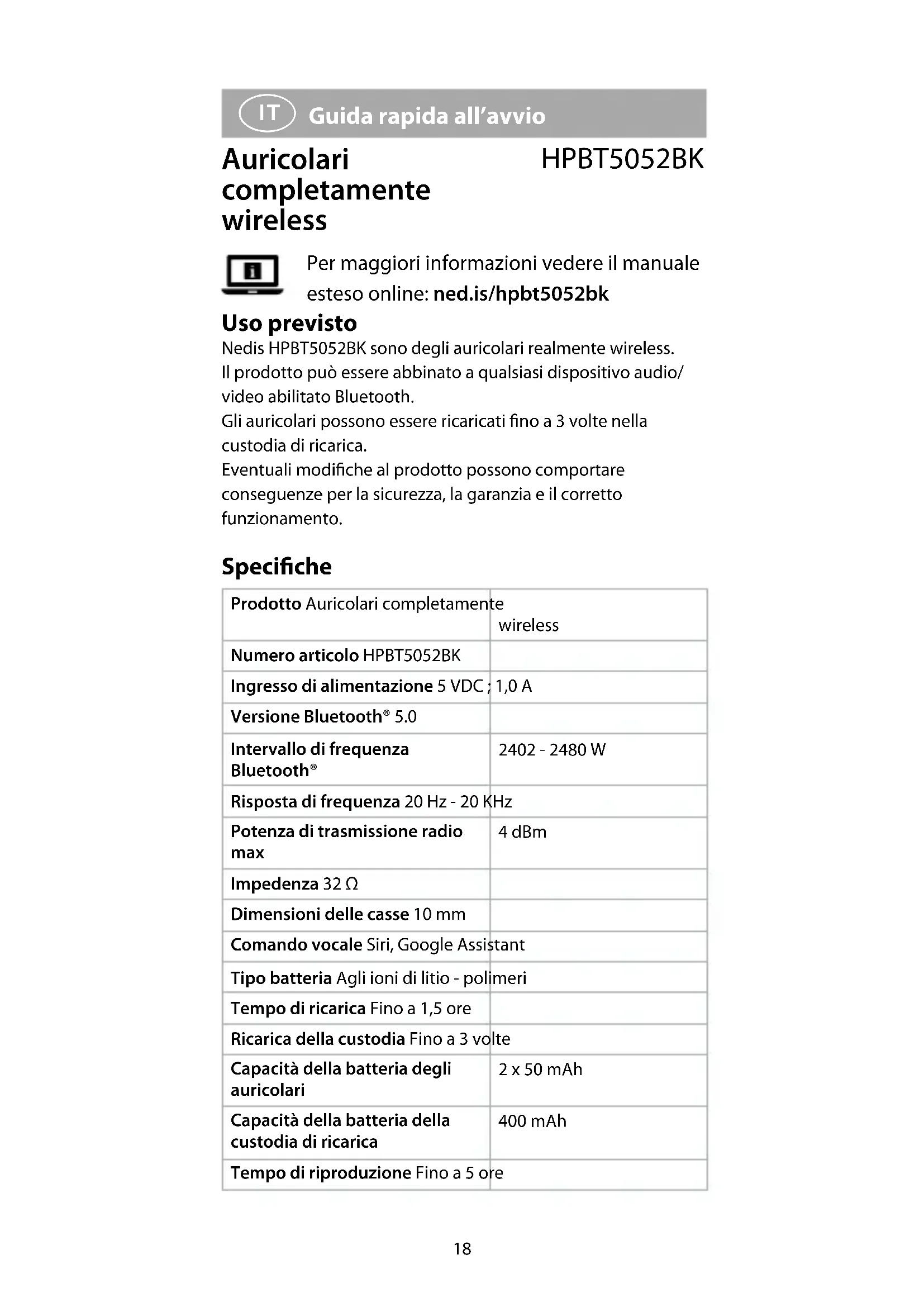 Guida rapida all’avvio Auricolari completamente wireless HPBT5052BK Per maggiori informazioni vedere il manuale esteso online: ned.is/hpbt5052bk Uso previsto Nedis HPBT5052BK sono degli auricolari realmente wireless. Il prodotto può essere abbinato a qualsiasi dispositivo audio/ video abilitato Bluetooth. Gli auricolari possono essere ricaricati no a 3 volte nella custodia di ricarica. Eventuali modiche al prodotto possono comportare conseguenze per la sicurezza, la garanzia e il corretto funzionamento. Speciche Prodotto Auricolari completamente wireless Numero articolo HPBT5052BK Ingresso di alimentazione 5 VDC ; 1,0 A Versione Bluetooth® 5.0 Intervallo di frequenza Bluetooth® 2402 - 2480 W Risposta di frequenza 20 Hz - 20 KHz Potenza di trasmissione radio max 4 dBm Impedenza 32 Ω Dimensioni delle casse 10 mm Comando vocale Siri, Google Assistant Tipo batteria Agli ioni di litio - polimeri Tempo di ricarica Fino a 1,5 ore Ricarica della custodia Fino a 3 volte Capacità della batteria degli auricolari 2 x 50 mAh Capacità della batteria della custodia di ricarica 400 mAh Tempo di riproduzione Fino a 5 ore19 Impermeabile No Parti principali (immagine A)