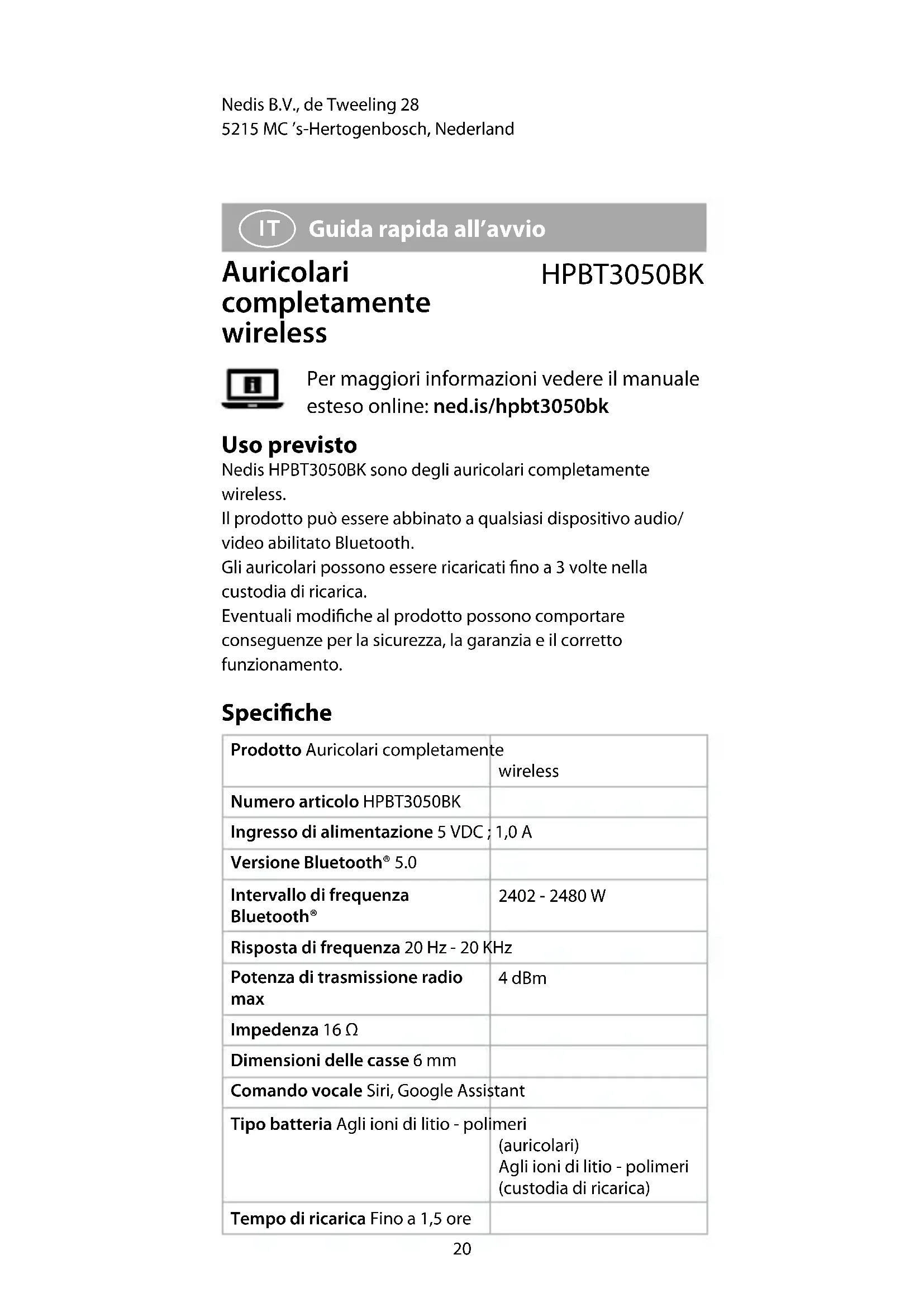 HPBT3050BK - Auricolare NEDIS - Manuale utente e istruzioni gratuiti