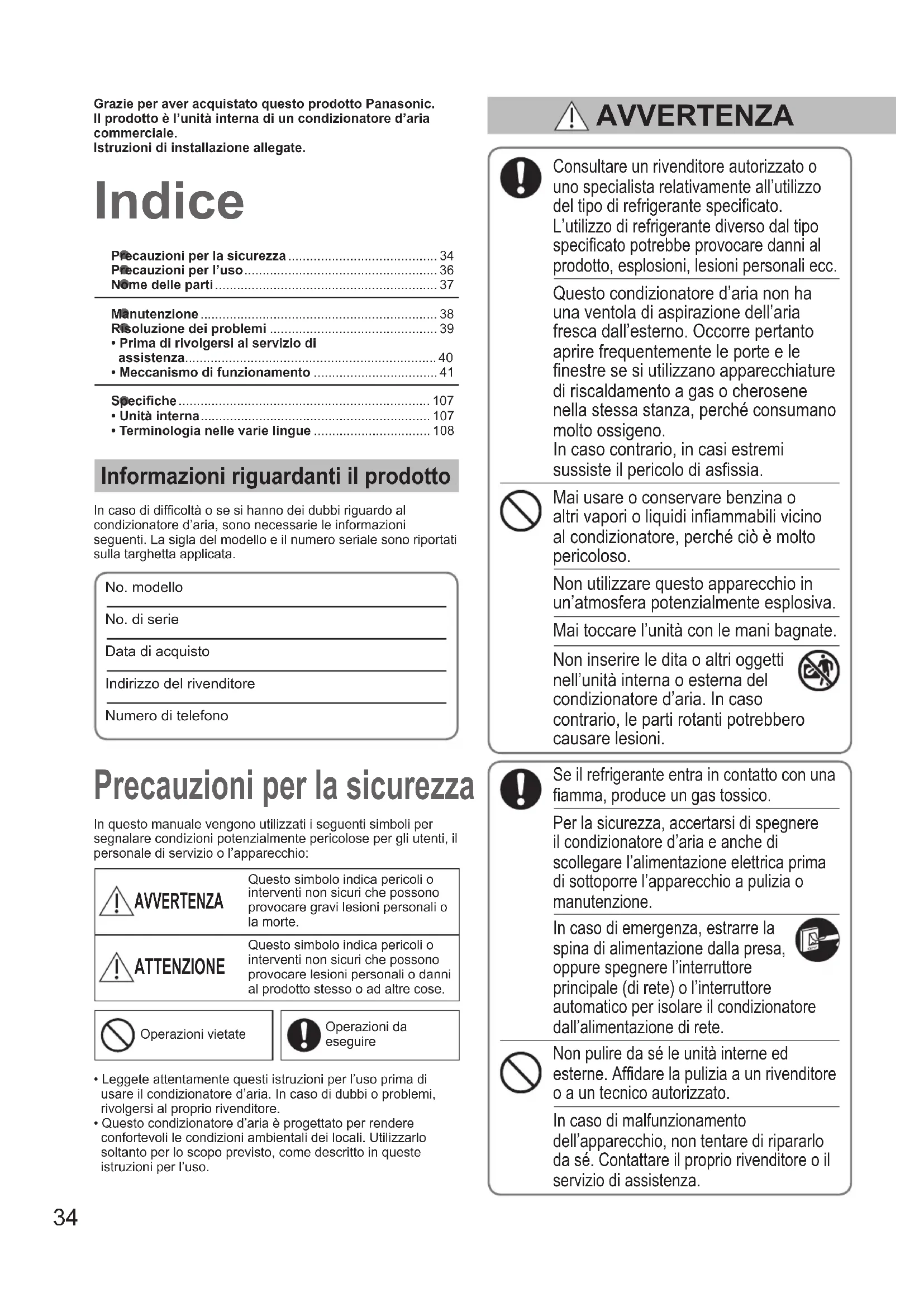- Terminologia nelle varie lingue ................................ 108 Indice Precauzioni per la sicurezza Informazioni riguardanti il prodotto In caso di difcoltà o se si hanno dei dubbi riguardo al condizionatore d’aria, sono necessarie le informazioni seguenti. La sigla del modello e il numero seriale sono riportati sulla targhetta applicata.No. modello No. di serie Data di acquistoIndirizzo del rivenditoreNumero di telefono Consultare un rivenditore autorizzato o uno specialista relativamente all’utilizzo del tipo di refrigerante specicato. L’utilizzo di refrigerante diverso dal tipo specicato potrebbe provocare danni al prodotto, esplosioni, lesioni personali ecc.Questo condizionatore d’aria non ha una ventola di aspirazione dell’aria fresca dall’esterno. Occorre pertanto aprire frequentemente le porte e le nestre se si utilizzano apparecchiature di riscaldamento a gas o cherosene nella stessa stanza, perché consumano molto ossigeno. In caso contrario, in casi estremi sussiste il pericolo di asssia.Mai usare o conservare benzina o altri vapori o liquidi inammabili vicino al condizionatore, perché ciò è molto pericoloso.Non utilizzare questo apparecchio in un’atmosfera potenzialmente esplosiva.Mai toccare l’unità con le mani bagnate.Non inserire le dita o altri oggetti nell’unità interna o esterna del condizionatore d’aria. In caso contrario, le parti rotanti potrebbero causare lesioni.Se il refrigerante entra in contatto con una amma, produce un gas tossico.Per la sicurezza, accertarsi di spegnere il condizionatore d’aria e anche di scollegare l’alimentazione elettrica prima di sottoporre l’apparecchio a pulizia o manutenzione.In caso di emergenza, estrarre la spina di alimentazione dalla presa, oppure spegnere l’interruttore principale (di rete) o l’interruttore automatico per isolare il condizionatore dall’alimentazione di rete.Non pulire da sé le unità interne ed esterne. Afdare la pulizia a un rivenditore o a un tecnico autorizzato.In caso di malfunzionamento dell’apparecchio, non tentare di ripararlo da sé. Contattare il proprio rivenditore o il servizio di assistenza.In questo manuale vengono utilizzati i seguenti simboli per segnalare condizioni potenzialmente pericolose per gli utenti, il personale di servizio o l’apparecchio: AVVERTENZA Questo simbolo indica pericoli o interventi non sicuri che possono provocare gravi lesioni personali o la morte. ATTENZIONE Questo simbolo indica pericoli o interventi non sicuri che possono provocare lesioni personali o danni al prodotto stesso o ad altre cose.Operazioni vietateOperazioni da eseguire• Leggete attentamente questi istruzioni per l’uso prima di usare il condizionatore d’aria. In caso di dubbi o problemi, rivolgersi al proprio rivenditore.• Questo condizionatore d’aria è progettato per rendere confortevoli le condizioni ambientali dei locali. Utilizzarlo soltanto per lo scopo previsto, come descritto in queste istruzioni per l’uso.Grazie per aver acquistato questo prodotto Panasonic.Il prodotto è l’unità interna di un condizionatore d’aria commerciale.Istruzioni di installazione allegate. AVVERTENZA OI_00_291492_EU.indb 34 2017/6/20 10:47:1935 ITALIANO Questo apparecchio è destinato all’utilizzo da parte di utenti esperti o preparati nei negozi, nell’industria leggera e nelle fattorie, oppure per l’utilizzo commerciale da parte di non addetti ai lavori. Questo apparecchio può essere utilizzato dai minori a partire dagli 8 anni di età e da persone con capacità siche, sensoriali o mentali ridotte o da persone inesperte, a condizione che siano adeguatamente supervisionate o preventivamente istruite sull’utilizzo in sicurezza e informate sui pericoli presenti. I bambini non devono giocare con l’apparecchio. La pulizia e la manutenzione da parte dell’utente non devono essere effettuate da bambini senza supervisione. Posizionare l’allarme antincendio e l’uscita dell’aria a una distanza di almeno 1,5 m dall’unità. Non raffreddare o riscaldare eccessivamente la stanza in presenza di bambini molto piccoli o persone malate. Non accendere e spegnere il condizionatore d’aria mediante l’interruttore principale (di rete). Usare sempre il pulsante di accensione/ spegnimento (ON/OFF). Non inserire alcun oggetto nell’uscita d’aria dell’unità esterna. Ciò è molto pericoloso perché la ventola ruota ad alta velocità. Non toccare la presa d’aria o le alette di alluminio aflate dell’unità esterna. C’è il pericolo di ferirsi. Non attaccare alcun oggetto sulla SUPERFICIE ESTERNA DELLA VENTOLA. C’è il pericolo di ferirsi e di danneggiare l’unità. Collegare ciascuna unità a una presa di corrente dedicata e nella linea esclusiva installare un sezionatore, un interruttore differenziale contro le perdite a terra (ELCB) o un interruttore differenziale (RCD) per la protezione da sovracorrente. Collegare ciascuna unità a una presa di corrente dedicata, e incorporare nel cablaggio sso un sistema di scollegamento completo, che offra una separazione dei contatti su tutti i poli, in ottemperanza alle normative sui cablaggi. Per evitare possibili pericoli dovuti a interruzione dell’isolamento elettrico, l’unità deve essere provvista di messa a terra. Non utilizzare un cavo modicato o giuntato, una prolunga o un cavo diverso da quello specicato per evitare surriscaldamenti e incendi. Al vericarsi di anomalie/guasti, interrompere l’uso del prodotto e scollegare la spina dalla presa di alimentazione, oppure spegnere l’interruttore di alimentazione e l’interruttore automatico. (rischio di fumo/incendio/scosse elettriche) Esempi di anomalia/guasto: