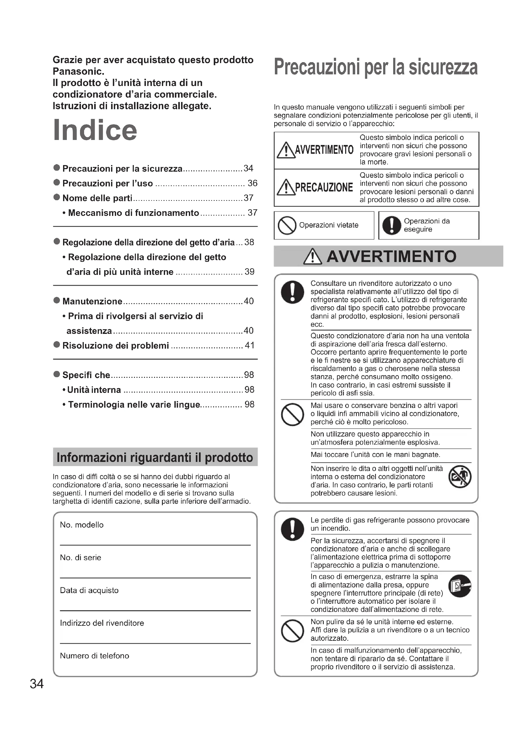 - • Terminologia nelle varie lingue Indice Precauzioni per la sicurezza Informazioni riguardanti il prodotto In caso di diffi coltà o se si hanno dei dubbi riguardo al condizionatore d’aria, sono necessarie le informazioni seguenti. I numeri del modello e di serie si trovano sulla targhetta di identifi cazione, sulla parte inferiore dell’armadio.No. modello No. di serie Data di acquistoIndirizzo del rivenditoreNumero di telefonoConsultare un rivenditore autorizzato o uno specialista relativamente all’utilizzo del tipo di refrigerante specifi cato. L’utilizzo di refrigerante diverso dal tipo specifi cato potrebbe provocare danni al prodotto, esplosioni, lesioni personali ecc. Questo condizionatore d’aria non ha una ventola di aspirazione dell’aria fresca dall’esterno. Occorre pertanto aprire frequentemente le porte e le fi nestre se si utilizzano apparecchiature di riscaldamento a gas o cherosene nella stessa stanza, perché consumano molto ossigeno. In caso contrario, in casi estremi sussiste il pericolo di asfi ssia.Mai usare o conservare benzina o altri vapori o liquidi infi ammabili vicino al condizionatore, perché ciò è molto pericoloso.Non utilizzare questo apparecchio in un’atmosfera potenzialmente esplosiva.Mai toccare l’unità con le mani bagnate.Non inserire le dita o altri oggetti nell’unità interna o esterna del condizionatore d’aria. In caso contrario, le parti rotanti potrebbero causare lesioni.Le perdite di gas refrigerante possono provocare un incendio.Per la sicurezza, accertarsi di spegnere il condizionatore d’aria e anche di scollegare l’alimentazione elettrica prima di sottoporre l’apparecchio a pulizia o manutenzione.In caso di emergenza, estrarre la spina di alimentazione dalla presa, oppure spegnere l’interruttore principale (di rete) o l’interruttore automatico per isolare il condizionatore dall’alimentazione di rete.Non pulire da sé le unità interne ed esterne. Affi dare la pulizia a un rivenditore o a un tecnico autorizzato.In caso di malfunzionamento dell’apparecchio, non tentare di ripararlo da sé. Contattare il proprio rivenditore o il servizio di assistenza.In questo manuale vengono utilizzati i seguenti simboli per segnalare condizioni potenzialmente pericolose per gli utenti, il personale di servizio o l’apparecchio: AVVERTIMENTO Questo simbolo indica pericoli o interventi non sicuri che possono provocare gravi lesioni personali o la morte. PRECAUZIONE Questo simbolo indica pericoli o interventi non sicuri che possono provocare lesioni personali o danni al prodotto stesso o ad altre cose.Operazioni vietateOperazioni da eseguire AVVERTIMENTO Grazie per aver acquistato questo prodotto Panasonic.Il prodotto è l’unità interna di un condizionatore d’aria commerciale.Istruzioni di installazione allegate. OI00284010EUall.indb34OI00284010EUall.indb34 2013/11/2914:35:532013/11/2914:35:5335 ITALIANO Questo apparecchio è destinato all’utilizzo da parte di utenti esperti o preparati nei negozi, nell’industria leggera e nelle fattorie, oppure per l’utilizzo commerciale da parte di non addetti ai lavori. Questo apparecchio può essere utilizzato dai minori a partire dagli 8 anni di età e da persone con capacità fi siche, sensoriali o mentali ridotte o da persone inesperte, a condizione che siano adeguatamente supervisionate o preventivamente istruite sull’utilizzo in sicurezza e informate sui pericoli presenti. Posizionare l’allarme antincendio e l’uscita dell’aria a una distanza di almeno 1,5 m dall’unità. Non raffreddare o riscaldare eccessivamente la stanza in presenza di bambini molto piccoli o persone malate. Non accendere e spegnere il condizionatore d’aria mediante l’interruttore principale (di rete). Usare sempre il pulsante di accensione/spegnimento (ON/ OFF). Non inserire alcun oggetto nell’uscita d’aria dell’unità esterna. Ciò è molto pericoloso perché la ventola ruota ad alta velocità. Non toccare la presa d’aria o le alette di alluminio affi late dell’unità esterna. C’è il pericolo di ferirsi. Non attaccare alcun oggetto sulla p. 98