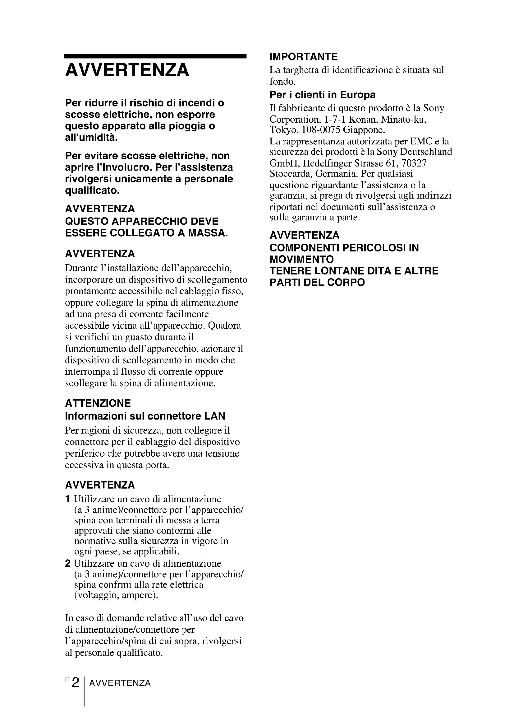 ESSERE COLLEGATO A MASSA. AVVERTENZA Durante l’installazione dell’apparecchio, incorporare un dispositivo di scollegamento prontamente accessibile nel cablaggio fisso, oppure collegare la spina di alimentazione ad una presa di corrente facilmente accessibile vicina all’apparecchio. Qualora si verifichi un guasto durante il funzionamento dell’apparecchio, azionare il dispositivo di scollegamento in modo che interrompa il flusso di corrente oppure scollegare la spina di alimentazione. ATTENZIONE Informazioni sul connettore LAN Per ragioni di sicurezza, non collegare il connettore per il cablaggio del dispositivo periferico che potrebbe avere una tensione eccessiva in questa porta. AVVERTENZA 1 Utilizzare un cavo di alimentazione (a 3 anime)/connettore per l’apparecchio/ spina con terminali di messa a terra approvati che siano conformi alle normative sulla sicurezza in vigore in ogni paese, se applicabili. 2 Utilizzare un cavo di alimentazione (a 3 anime)/connettore per l’apparecchio/ spina confrmi alla rete elettrica (voltaggio, ampere). In caso di domande relative all’uso del cavo di alimentazione/connettore per l’apparecchio/spina di cui sopra, rivolgersi al personale qualificato. IMPORTANTE La targhetta di identificazione è situata sul fondo. Per i clienti in Europa Il fabbricante di questo prodotto è la Sony Corporation, 1-7-1 Konan, Minato-ku, Tokyo, 108-0075 Giappone. La rappresentanza autorizzata per EMC e la sicurezza dei prodotti è la Sony Deutschland GmbH, Hedelfinger Strasse 61, 70327 Stoccarda, Germania. Per qualsiasi questione riguardante l’assistenza o la garanzia, si prega di rivolgersi agli indirizzi riportati nei documenti sull’assistenza o sulla garanzia a parte. AVVERTENZA