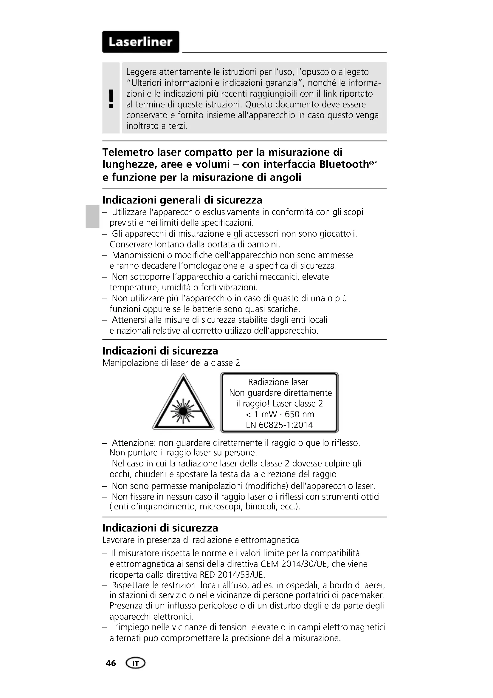 Indicazioni generali di sicurezza – Utilizzare l‘apparecchio esclusivamente in conformità con gli scopi previsti e nei limiti delle specicazioni. – Gli apparecchi di misurazione e gli accessori non sono giocattoli. Conservare lontano dalla portata di bambini. – Manomissioni o modiche dell‘apparecchio non sono ammesse e fanno decadere l‘omologazione e la specica di sicurezza. – Non sottoporre l‘apparecchio a carichi meccanici, elevate temperature, umidità o forti vibrazioni. – Non utilizzare più l‘apparecchio in caso di guasto di una o più funzioni oppure se le batterie sono quasi scariche. – Attenersi alle misure di sicurezza stabilite dagli enti locali e nazionali relative al corretto utilizzo dell‘apparecchio. – Attenzione: non guardare direttamente il raggio o quello riesso. – Non puntare il raggio laser su persone. – Nel caso in cui la radiazione laser della classe 2 dovesse colpire gli occhi, chiuderli e spostare la testa dalla direzione del raggio. – Non sono permesse manipolazioni (modiche) dell‘apparecchio laser. – Non ssare in nessun caso il raggio laser o i riessi con strumenti ottici (lenti d‘ingrandimento, microscopi, binocoli, ecc.). Indicazioni di sicurezza Manipolazione di laser della classe 2 Radiazione laser! Non guardare direttamente il raggio! Laser classe 2 < 1 mW · 650 nm EN 60825-1:2014 Indicazioni di sicurezza Lavorare in presenza di radiazione elettromagnetica – Il misuratore rispetta le norme e i valori limite per la compatibilità elettromagnetica ai sensi della direttiva CEM 2014/30/UE, che viene ricoperta dalla direttiva RED 2014/53/UE. – Rispettare le restrizioni locali all’uso, ad es. in ospedali, a bordo di aerei, in stazioni di servizio o nelle vicinanze di persone portatrici di pacemaker. Presenza di un inusso pericoloso o di un disturbo degli e da parte degli apparecchi elettronici. – L’impiego nelle vicinanze di tensioni elevate o in campi elettromagnetici alternati può compromettere la precisione della misurazione.LaserRange-Master T4 Pro