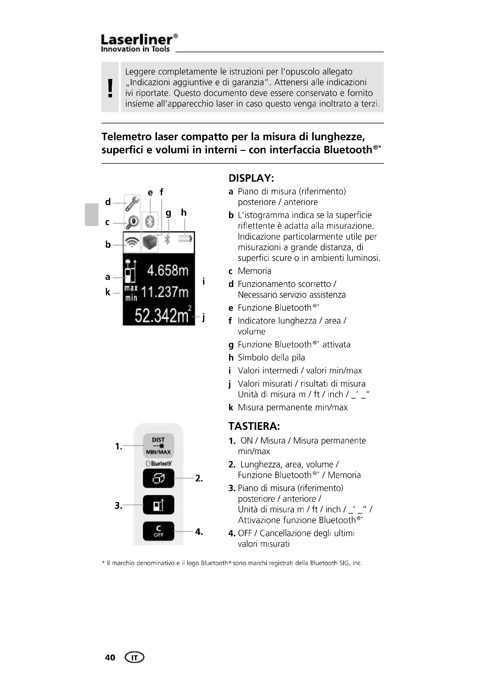 Leggere completamente le istruzioni per l‘opuscolo allegato „Indicazioni aggiuntive e di garanzia“. Attenersi alle indicazioni ivi riportate. Questo documento deve essere conservato e fornito insieme all‘apparecchio laser in caso questo venga inoltrato a terzi.