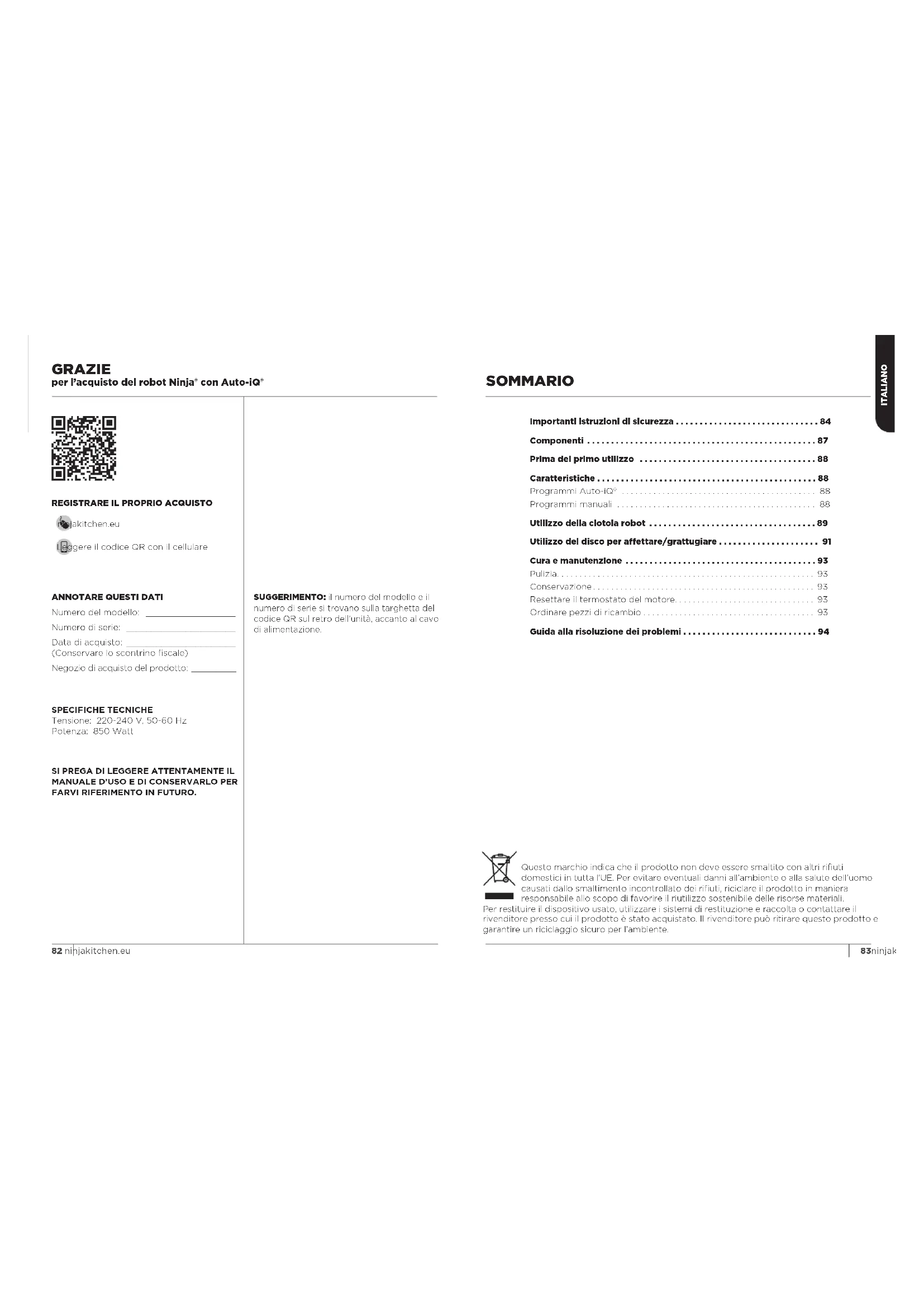 ninjakitchen.eu Leggere il codice QR con il cellulare Questo marchio indica che il prodotto non deve essere smaltito con altri rifiuti domestici in tutta l’UE. Per evitare eventuali danni all’ambiente o alla salute dell’uomo causati dallo smaltimento incontrollato dei rifiuti, riciclare il prodotto in maniera responsabile allo scopo di favorire il riutilizzo sostenibile delle risorse materiali. Per restituire il dispositivo usato, utilizzare i sistemi di restituzione e raccolta o contattare il rivenditore presso cui il prodotto è stato acquistato. Il rivenditore può ritirare questo prodotto e garantire un riciclaggio sicuro per l’ambiente.85ninjakitchen.eu 84 ninjakitchen.eu
