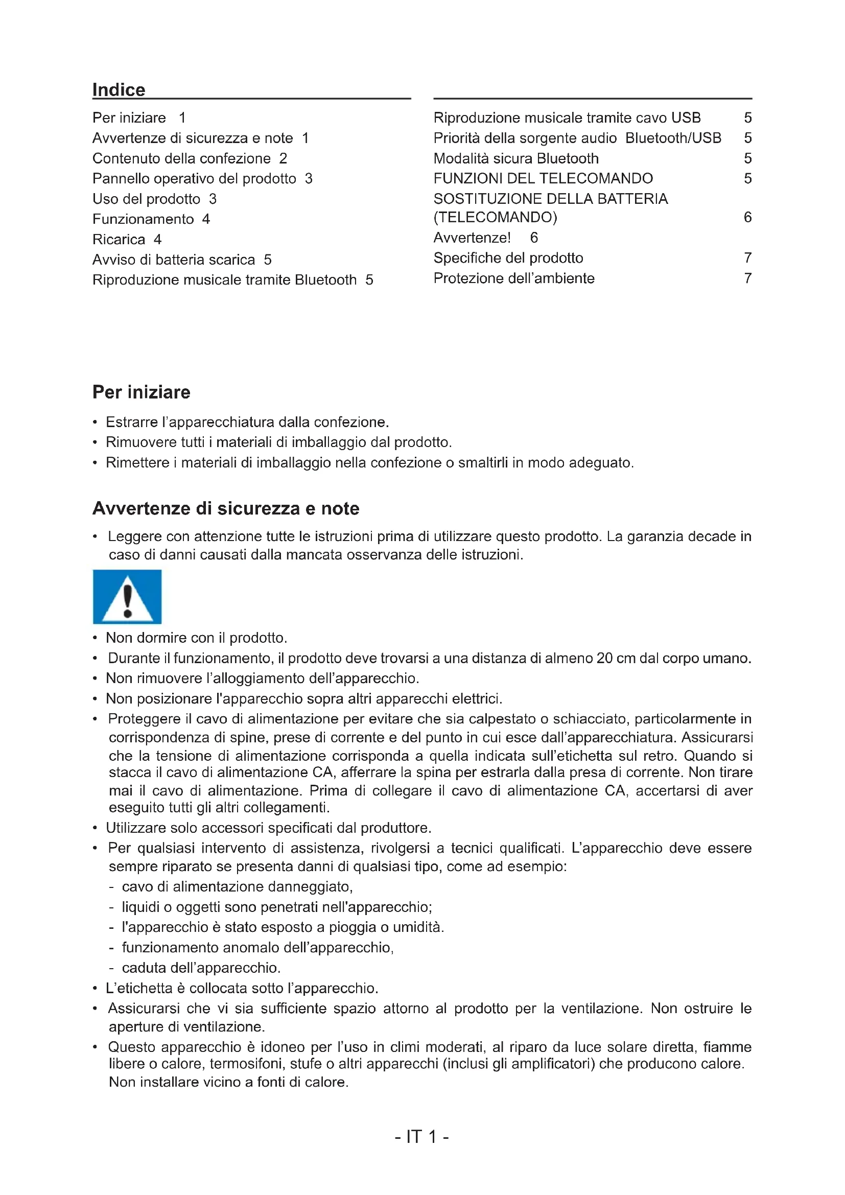 - 4XHVWRDSSDUHFFKLRqLGRQHRSHUO¶XVRLQFOLPLPRGHUDWLDOULSDURGDOXFHVRODUHGLUHWWD¿DPPH OLEHUHRFDORUHWHUPRVLIRQLVWXIHRDOWULDSSDUHFFKLLQFOXVLJOLDPSOL¿FDWRULFKHSURGXFRQRFDORUH Non installare vicino a fonti di calore. Per iniziare 1 Avvertenze di sicurezza e note 1 Contenuto della confezione 2 Pannello operativo del prodotto 3 Uso del prodotto 3 Funzionamento 4 Ricarica 4 Avviso di batteria scarica 5 Riproduzione musicale tramite Bluetooth 5 Riproduzione musicale tramite cavo USB 5 Priorità della sorgente audio: Bluetooth/USB 5 Modalità sicura Bluetooth 5