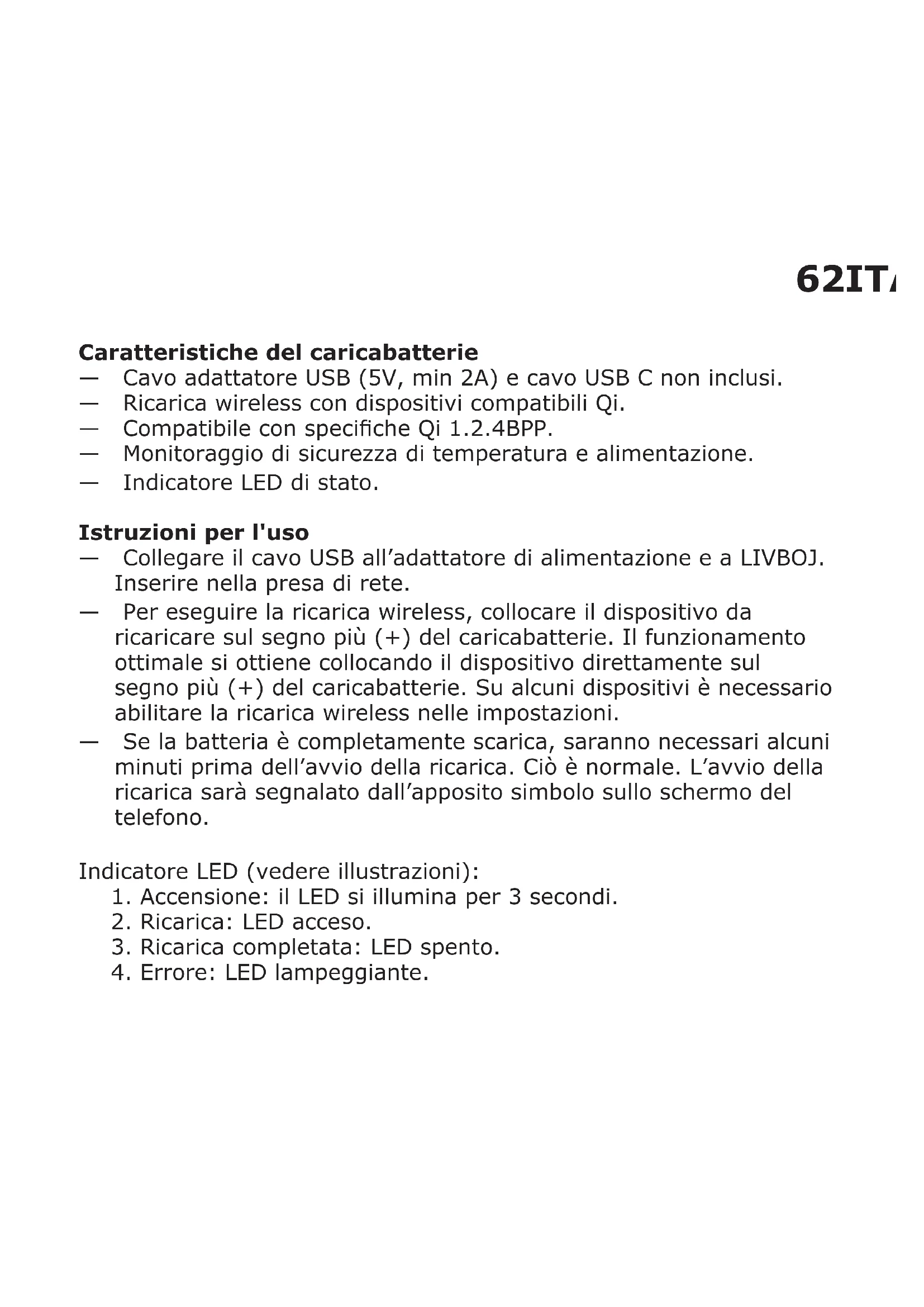 62ITALIANO Caratteristiche del caricabatterie — Cavo adattatore USB (5V, min 2A) e cavo USB C non inclusi. — Ricarica wireless con dispositivi compatibili Qi. — Compatibile con speciche Qi 1.2.4BPP. — Monitoraggio di sicurezza di temperatura e alimentazione. — Indicatore LED di stato. Istruzioni per l'uso — Collegare il cavo USB all’adattatore di alimentazione e a LIVBOJ. Inserire nella presa di rete. — Per eseguire la ricarica wireless, collocare il dispositivo da ricaricare sul segno più (+) del caricabatterie. Il funzionamento ottimale si ottiene collocando il dispositivo direttamente sul segno più (+) del caricabatterie. Su alcuni dispositivi è necessario abilitare la ricarica wireless nelle impostazioni. — Se la batteria è completamente scarica, saranno necessari alcuni minuti prima dell’avvio della ricarica. Ciò è normale. L’avvio della ricarica sarà segnalato dall’apposito simbolo sullo schermo del telefono. Indicatore LED (vedere illustrazioni):