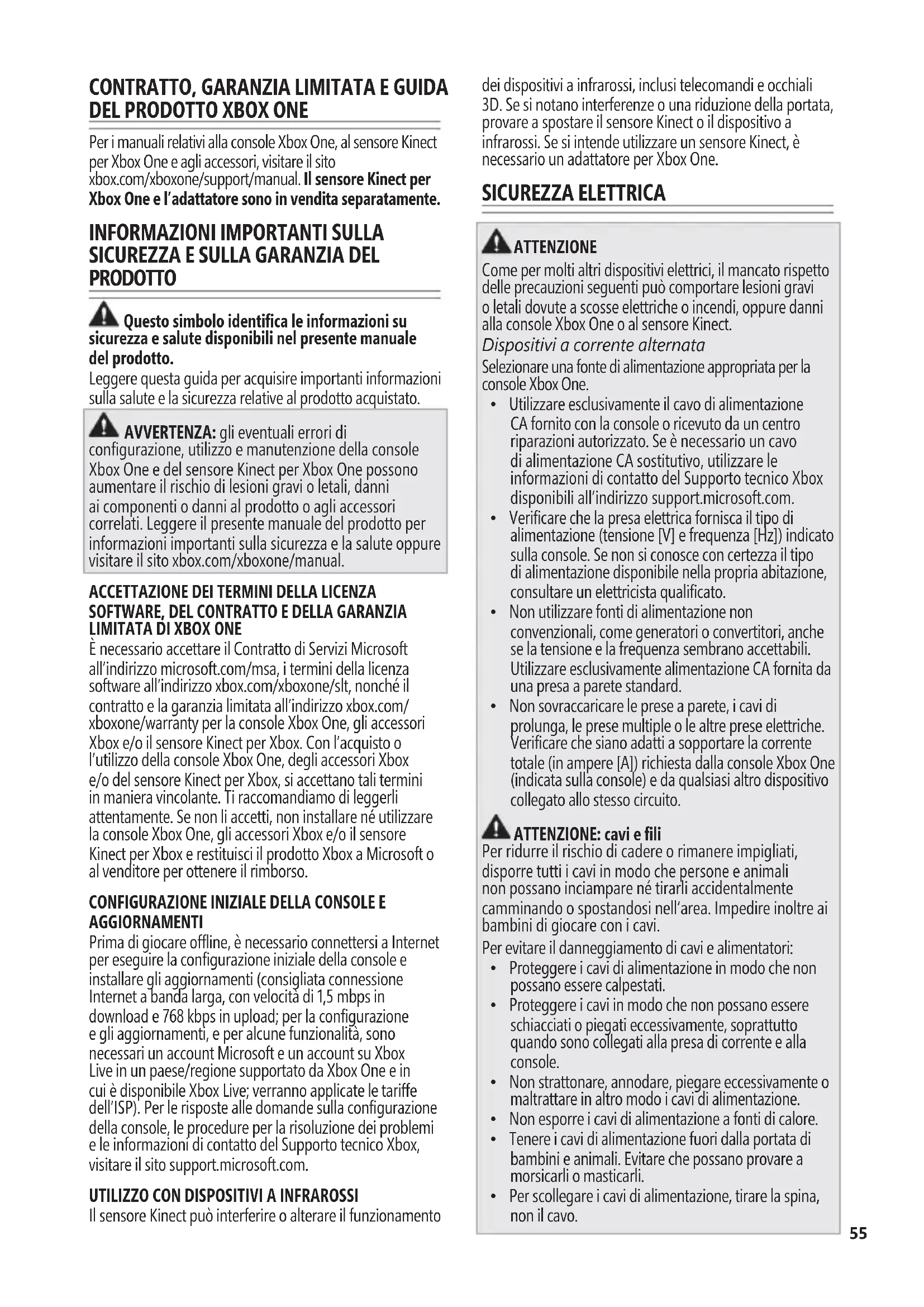 È necessario accettare il Contratto di Servizi Microsoft all’indirizzo microsoft.com/msa, i termini della licenza software all’indirizzo xbox.com/xboxone/slt, nonché il contratto e la garanzia limitata all’indirizzo xbox.com/ xboxone/warranty per la console Xbox One, gli accessori Xbox e/o il sensore Kinect per Xbox. Con l’acquisto o l’utilizzo della console Xbox One, degli accessori Xbox e/o del sensore Kinect per Xbox, si accettano tali termini in maniera vincolante. Ti raccomandiamo di leggerli attentamente. Se non li accetti, non installare né utilizzare la console Xbox One, gli accessori Xbox e/o il sensore Kinect per Xbox e restituisci il prodotto Xbox a Microsoft o al venditore per ottenere il rimborso.