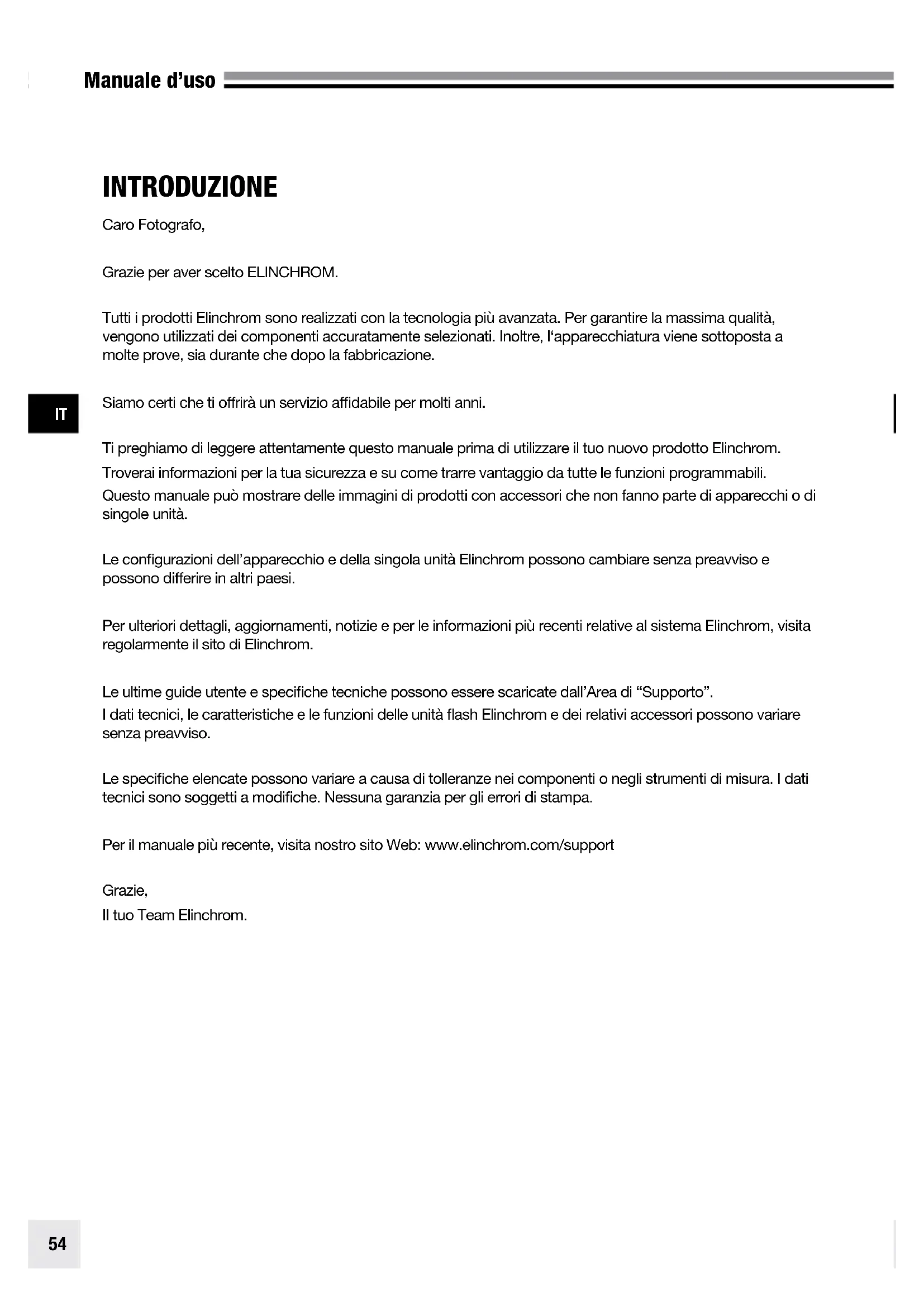INTRODUZIONE Caro Fotografo, Grazie per aver scelto ELINCHROM. Tutti i prodotti Elinchrom sono realizzati con la tecnologia più avanzata. Per garantire la massima qualità, vengono utilizzati dei componenti accuratamente selezionati. Inoltre, l‘apparecchiatura viene sottoposta a molte prove, sia durante che dopo la fabbricazione. Siamo certi che ti offrirà un servizio affidabile per molti anni. Ti preghiamo di leggere attentamente questo manuale prima di utilizzare il tuo nuovo prodotto Elinchrom. Troverai informazioni per la tua sicurezza e su come trarre vantaggio da tutte le funzioni programmabili. Questo manuale può mostrare delle immagini di prodotti con accessori che non fanno parte di apparecchi o di singole unità. Le configurazioni dell’apparecchio e della singola unità Elinchrom possono cambiare senza preavviso e possono differire in altri paesi. Per ulteriori dettagli, aggiornamenti, notizie e per le informazioni più recenti relative al sistema Elinchrom, visita regolarmente il sito di Elinchrom. Le ultime guide utente e specifiche tecniche possono essere scaricate dall’Area di “Supporto”. I dati tecnici, le caratteristiche e le funzioni delle unità flash Elinchrom e dei relativi accessori possono variare senza preavviso. Le specifiche elencate possono variare a causa di tolleranze nei componenti o negli strumenti di misura. I dati tecnici sono soggetti a modifiche. Nessuna garanzia per gli errori di stampa. Per il manuale più recente, visita nostro sito Web: www.elinchrom.com/support Grazie, Il tuo Team Elinchrom.55 Manuale d’uso