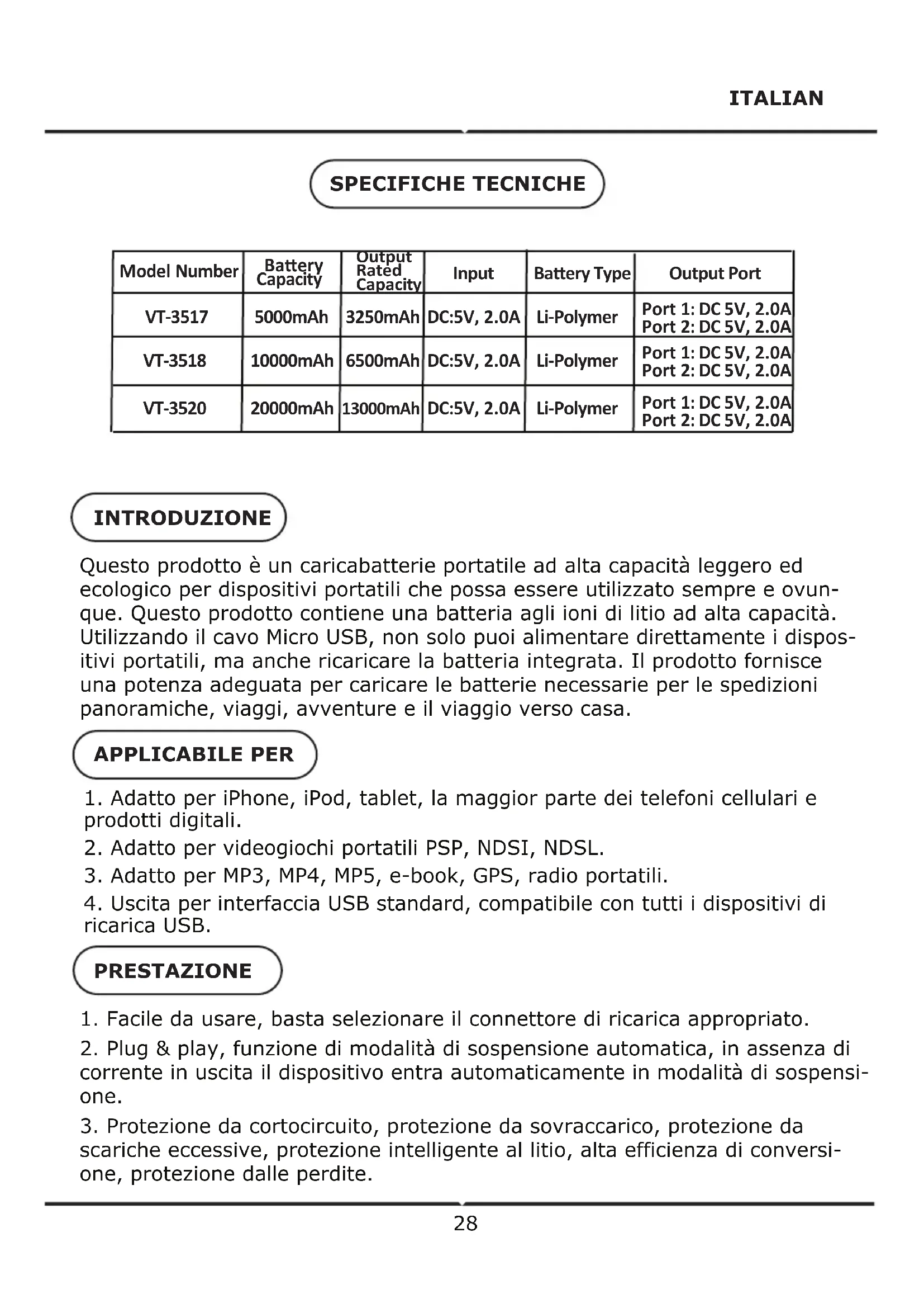 Output Rated Capacity Model Number Input Baery Type Output Port 5000mAh 10000mAh 20000mAh VT-3517 VT-3518 VT-3520 DC:5V, 2.0A DC:5V, 2.0A DC:5V, 2.0A Li-Polymer Li-Polymer Li-Polymer Port 1: DC 5V, 2.0A Port 2: DC 5V, 2.0A Port 1: DC 5V, 2.0A Port 2: DC 5V, 2.0A Port 1: DC 5V, 2.0A Port 2: DC 5V, 2.0A Baery Capacity 3250mAh 6500mAh 13000mAh1. Capacità di visualizzazione (Nota: applicabile ai modelli con indicatore LED): Premere il tasto di controllo, il LED di capacità si accende, dopo 10 secondi si spegne automaticamente. 4 LED accesi: rimangono 75%~100%. 3 LED accesi: rimangono 50%~75%. 2 LED accesi: rimangono 25%—50%. 1 LED accesi: rimangono meno del 25%.