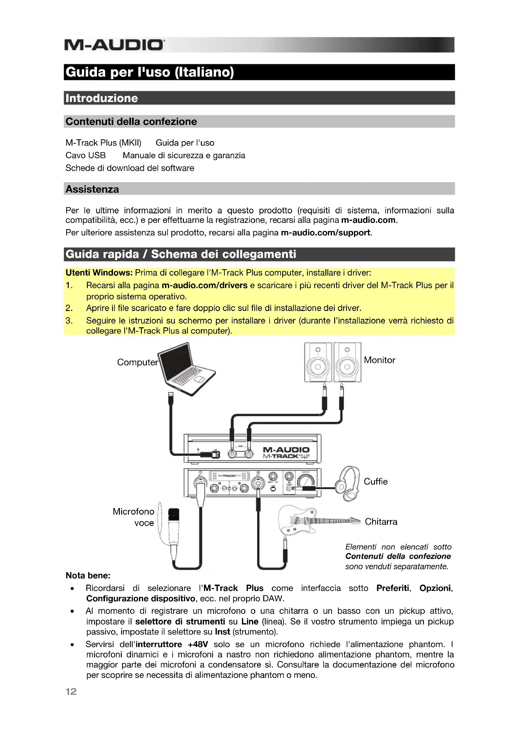 Guida per l'uso (Italiano) Introduzione Contenuti della confezione M-Track Plus (MKII) Guida per l'uso Cavo USB Manuale di sicurezza e garanzia Schede di download del software Assistenza Per le ultime informazioni in merito a questo prodotto (requisiti di sistema, informazioni sulla compatibilità, ecc.) e per effettuarne la registrazione, recarsi alla pagina m-audio.com. Per ulteriore assistenza sul prodotto, recarsi alla pagina m-audio.com/support. Guida rapida / Schema dei collegamenti Utenti Windows: Prima di collegare l'M-Track Plus computer, installare i driver: