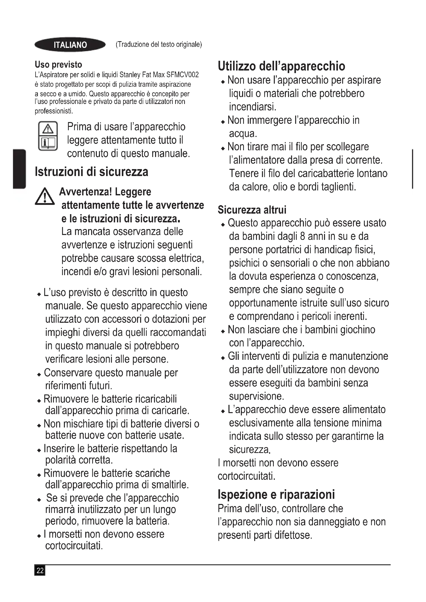 Il doppio isolamento di cui è provvisto il caricabatte- rie rende superuo il lo di terra. Vericare sempre che la tensione di rete corrisponda alla tensione indicata sulla targhetta dei valori nominali. Non tentare mai di sostituire il caricabatterie con una normale spina di rete. u Se il cavo di alimentazione è danneggiato, deve essere sostituito dal produttore o da un Centro di assistenza STANLEY FAT MAX autorizzato per evitare rischi. Avvertenza! Non tentare mai di sostituire il caricabatterie con una normale spina di rete. Etichette sull’elettroutensile Sull’elettroutensile sono presenti i seguenti simboli assieme al codice data: Avvertenza! Per ridurre il rischio di lesioni personali l'utilizzatore deve leggere il manuale di istruzioni. Caratteristiche Questo apparecchio elettrico include alcune delle seguenti caratteristiche. 1. Interruttore di accensione/spegnimento 2. Impugnatura principale 3. Corpo motore 4. Serbatoio 5. Fermo del serbatoio 6. Presa di aspirazione 7. Scomparto batteria 8. Tubo essibile 9. Fascetta stringitubo10. Porta di scarico laterale 11. Bocchetta per interstizi 12. Bocchetta per pavimenti25 (Traduzione del testo originale) ITALIANO Assemblaggio Ricarica della batteria (non fornita) (Fig. A) La batteria deve essere caricata prima dell’impiego iniziale e quando non eroga una potenza sufciente per svolgere lavori che prima era possibile eseguire facilmente. Durante la carica,la batteria potrebbe riscaldarsi. Si tratta di un fatto normale che non indica la presenza di un problema. Avvertenza! Non caricare la batteria a temperature ambientali inferiori a 10 °C o superiori a 40 °C. La temperatura di carica consigliata è di circa 24 °C. Nota: il caricabatterie non carica una batteria se la temperatura delle celle è inferiore a 10 °C o superiore a 40 °C. La batteria deve essere lasciata nel caricabatterie, che comincerà a caricarla automaticamente quando la temperatura delle celle aumenta o diminuisce. Nota: per garantire la massima prestazione e durata dei pacchi batteria agli ioni di litio, caricare completamente il pacco batteria prima di utilizzarlo per la prima volta. u Collegare il caricabatterie (14) a una presa di corrente adatta prima di inserire il pacco batteria (13). u La spia verde di carica in corso (14a) lampeggia continuamente, indicando che è iniziato il processo di carica. u Il completamento della carica sarà indicato dalla spia verde di carica in corso (14a) che rimane accesa ssa. Il pacco batteria (13) è completamente carico e può essere utilizzato subito o lasciato nel caricabatterie (14). u Caricare le batterie scariche entro 1 settimana. La durata delle batterie si riduce parecchio se sono conservate scariche. Modalità LED del caricabatterie Carica in corso: LED verde intermittente Carica completa: LED verde acceso sso Ritardo per pacco caldo/freddo: LED verde intermittente LED rosso acceso sso Nota: i caricabatterie compatibili non caricheranno un pacco batteria difettoso. Il caricabatterie non si illuminerà indicando che un pacco batteria è difettoso. Nota: questo motivo potrebbe anche indicare un problema del caricabatterie. Se il caricabatterie indica la presenza di un problema, portare il caricabatterie e il pacco batteria presso un centro di assistenza autorizzato per essere testati. Batteria lasciata nel caricabatterie Il caricabatterie e il pacco batteria possono essere lasciati collegati con il LED sempre acceso. Il caricabatterie manterrà il pacco batteria come nuovo e completamente carico. Ritardo per pacco caldo/freddo Quando il caricabatterie rileva una batteria troppo calda o troppo fredda, avvia automaticamente un Ritardo per pacco caldo/freddo, il LED verde (14a) lampeggia a intermittenza, mentre il LED rosso (14b) rimane acceso sso, sospendendo la carica nché la batteria avrà raggiunto la temperatura appropriata. Il caricabatterie quindi passa automaticamente alla modalità di carica. Questa funzione garantisce la massima durata della batteria. Indicatore dello stato di carica della batteria (Fig. B) La batteria include un indicatore dello stato di carica per determinare rapidamente la sua durata, come mostra la gura B. Premendo o il pulsante dello stato di carica (13a) è possibile visualizzare facilmente la carica residua nella batteria, come illustrato nella gura B. Inserimento e rimozione del pacco batteria (non fornito) dall’apparecchio Per installare il pacco batteria (non fornito) (Fig. C) u Inserire il pacco batteria saldamente nell’apparecchio no a quando si avverte uno scatto, come illustrato nella gura C. Assicurarsi che il pacco batteria sia completamente inserito e bloccato in posizione. Per rimuovere il pacco batteria (non fornito) (Fig. C) u Premere il pulsante di rilascio batteria (13b) come illustrato nella gura C ed estrarre la batteria dall’apparecchio. Montaggio del tubo essibile (Fig. D) Il tubo essibile (8) dovrà essere collegato all’aspiratore prima di utilizzare l’apparecchio. u Collocare l’aspiratore su una supercie piana e stabile. u Sganciare i fermi del serbatoio (5) e rimuovere il corpo motore dal serbatoio. Staccare il tubo essibile (8) dal serbatoio. u Allineare l’estremità del tubo essibile (15) con la presa di aspirazione (17) situata nella parte anteriore dell’apparecchio, assicurandosi che il blocco di allineamento del tubo (16) sia allineato con la freccia (17) sulla presa di aspirazione.26 (Traduzione del testo originale) ITALIANO u Inserire l’estremità del tubo essibile nella presa di aspirazione e ruotare il tubo in senso orario per bloccarlo in posizione. u Ricollocare il corpo motore sul serbatoio e bloccare i fermi. Nota: il corpo motore si inserisce sul serbatoio solo se la presa di aspirazione situata nella parte anteriore del corpo motore e lo scomparto per la bocchetta per pavimenti sul serbatoio sono allineati, come illustrato nella gura D. Posizione corretta delle mani Avvertenza! Per ridurre il rischio di gravi lesioni personali, ma