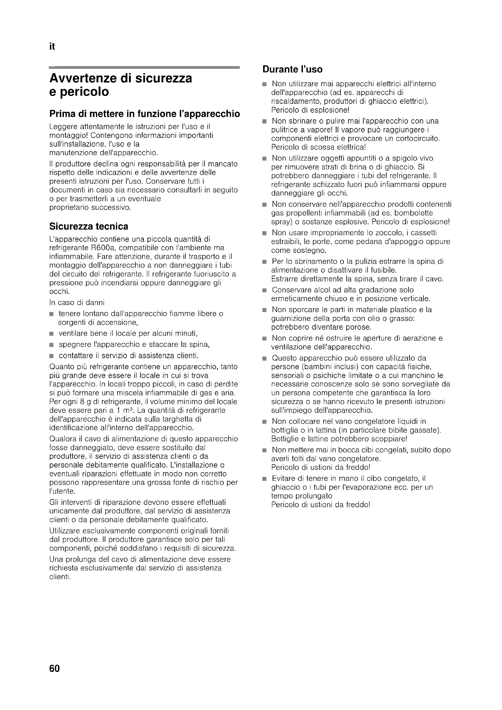 itIndice itIstruzioni per l'uso Avvertenze di sicurezza e pericolo Prima di mettere in funzione l'apparecchio Leggere attentamente le istruzioni per l'uso e il montaggio! Contengono informazioni importanti sull'installazione, l'uso e la manutenzione dell'apparecchio. Il produttore declina ogni responsabilità per il mancato rispetto delle indicazioni e delle avvertenze delle presenti istruzioni per l'uso. Conservare tutti i documenti in caso sia necessario consultarli in seguito o per trasmetterli a un eventuale proprietario successivo. Sicurezza tecnica L'apparecchio contiene una piccola quantità di refrigerante R600a, compatibile con l'ambiente ma infiammabile. Fare attenzione, durante il trasporto e il montaggio dell'apparecchio a non danneggiare i tubi del circuito del refrigerante. Il refrigerante fuoriuscito a pressione può incendiarsi oppure danneggiare gli occhi. In caso di danni ■ tenere lontano dall'apparecchio fiamme libere o sorgenti di accensione, ■ ventilare bene il locale per alcuni minuti, ■ spegnere l'apparecchio e staccare la spina, ■ contattare il servizio di assistenza clienti. Quanto più refrigerante contiene un apparecchio, tanto più grande deve essere il locale in cui si trova l'apparecchio. In locali troppo piccoli, in caso di perdite si può formare una miscela infiammabile di gas e aria. Per ogni 8 g di refrigerante, il volume minimo del locale deve essere pari a 1 m³. La quantità di refrigerante dell'apparecchio è indicata sulla targhetta di identificazione all'interno dell'apparecchio. Qualora il cavo di alimentazione di questo apparecchio fosse danneggiato, deve essere sostituito dal produttore, il servizio di assistenza clienti o da personale debitamente qualificato. L'installazione o eventuali riparazioni effettuate in modo non corretto possono rappresentare una grossa fonte di rischio per l'utente. Gli interventi di riparazione devono essere effettuati unicamente dal produttore, dal servizio di assistenza clienti o da personale debitamente qualificato. Utilizzare esclusivamente componenti originali forniti dal produttore. Il produttore garantisce solo per tali componenti, poiché soddisfano i requisiti di sicurezza. Una prolunga del cavo di alimentazione deve essere richiesta esclusivamente dal servizio di assistenza clienti. Durante l'uso ■ Non utilizzare mai apparecchi elettrici all'interno dell'apparecchio (ad es. apparecchi di riscaldamento, produttori di ghiaccio elettrici). Pericolo di esplosione! ■ Non sbrinare o pulire mai l'apparecchio con una pulitrice a vapore! Il vapore può raggiungere i componenti elettrici e provocare un cortocircuito. Pericolo di scossa elettrica! ■ Non utilizzare oggetti appuntiti o a spigolo vivo per rimuovere strati di brina o di ghiaccio. Si potrebbero danneggiare i tubi del refrigerante. Il refrigerante schizzato fuori può infiammarsi oppure danneggiare gli occhi. ■ Non conservare nell'apparecchio prodotti contenenti gas propellenti infiammabili (ad es. bombolette spray) o sostanze esplosive. Pericolo di esplosione! ■ Non usare impropriamente lo zoccolo, i cassetti estraibili, le porte, come pedana d'appoggio oppure come sostegno. ■ Per lo sbrinamento o la pulizia estrarre la spina di alimentazione o disattivare il fusibile. Estrarre direttamente la spina, senza tirare il cavo. ■ Conservare alcol ad alta gradazione solo ermeticamente chiuso e in posizione verticale. ■ Non sporcare le parti in materiale plastico e la guarnizione della porta con olio o grasso: potrebbero diventare porose. ■ Non coprire né ostruire le aperture di aerazione e ventilazione dell'apparecchio. ■ Questo apparecchio può essere utilizzato da persone (bambini inclusi) con capacità fisiche, sensoriali o psichiche limitate o a cui manchino le necessarie conoscenze solo se sono sorvegliate da un persona competente che garantisca la loro sicurezza o se hanno ricevuto le presenti istruzioni sull'impiego dell'apparecchio. ■ Non collocare nel vano congelatore liquidi in bottiglia o in lattina (in particolare bibite gassate). Bottiglie e lattine potrebbero scoppiare! ■ Non mettere mai in bocca cibi congelati, subito dopo averli tolti dal vano congelatore. Pericolo di ustioni da freddo! ■ Evitare di tenere in mano il cibo congelato, il ghiaccio o i tubi per l'evaporazione ecc. per un tempo prolungato Pericolo di ustioni da freddo!it
