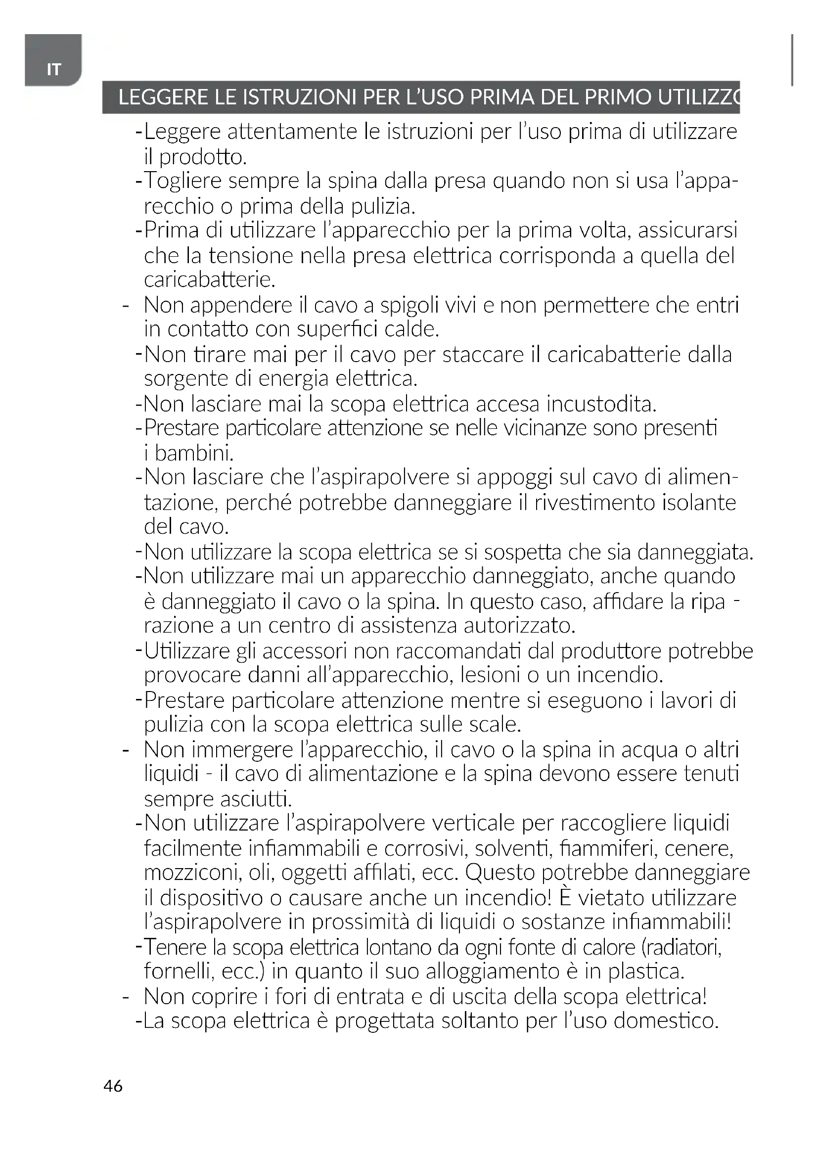 Non rare mai per il cavo per staccare il caricabaerie dalla sorgente di energia elerica. - Non lasciare mai la scopa elerica accesa incustodita.