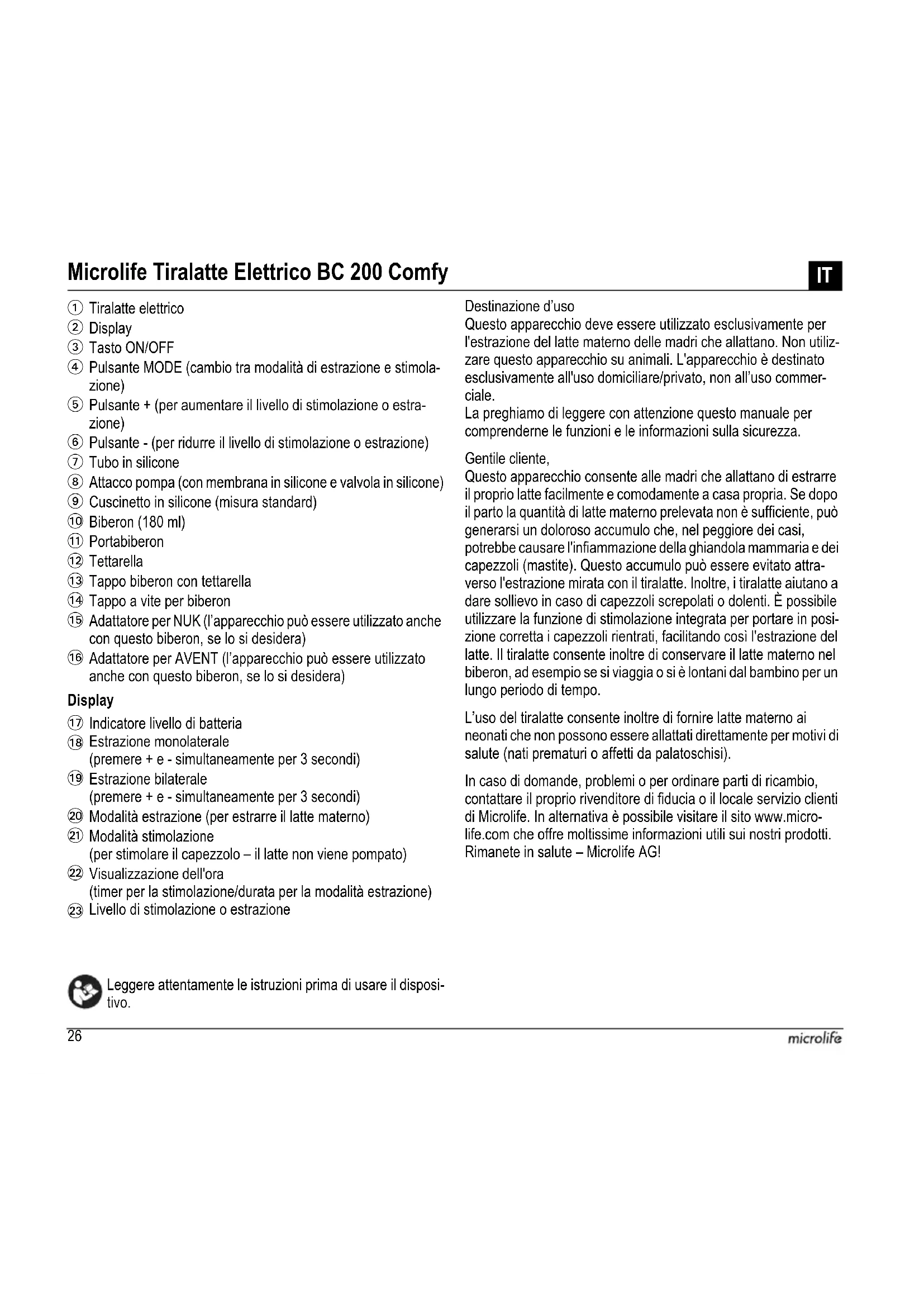 Humidité relative 30 - 85 % max. (sans condensation) Pression ambiante 700 - 1060 hPa Conditions de stockage: -20 - +60 °C Humidité relative 10 - 95 % max. (sans condensation) Pression ambiante 700 - 1060 hPa Branchement: 4 x piles alcalines de 1,5 V; format AA Adaptateur secteur: Entrée: 100-240V AC 50/60Hz 0.5A Sortie: 6V DC 1.0 A Durée de vie des piles: 500 heures Classe IP: IP21 Espérance de fonctionne- ment: 500 heures Limites de fonctionne- ment: 30 min. Marche / 30 min. Arrêt Équipement de type BF (unité avec degré de protection spécifique contre les dangers électriques). Utilisation en l’absence de gaz oxydants, explosifs ou d’oxyde d’azote.26 Display Leggere attentamente le istruzioni prima di usare il disposi- tivo. Destinazione d’uso Questo apparecchio deve essere utilizzato esclusivamente per l'estrazione del latte materno delle madri che allattano. Non utiliz- zare questo apparecchio su animali. L'apparecchio è destinato esclusivamente all'uso domiciliare/privato, non all’uso commer- ciale. La preghiamo di leggere con attenzione questo manuale per comprenderne le funzioni e le informazioni sulla sicurezza. Gentile cliente, Questo apparecchio consente alle madri che allattano di estrarre il proprio latte facilmente e comodamente a casa propria. Se dopo il parto la quantità di latte materno prelevata non è sufficiente, può generarsi un doloroso accumulo che, nel peggiore dei casi, potrebbe causare l'infiammazione della ghiandola mammaria e dei capezzoli (mastite). Questo accumulo può essere evitato attra- verso l'estrazione mirata con il tiralatte. Inoltre, i tiralatte aiutano a dare sollievo in caso di capezzoli screpolati o dolenti. È possibile utilizzare la funzione di stimolazione integrata per portare in posi- zione corretta i capezzoli rientrati, facilitando così l'estrazione del latte. Il tiralatte consente inoltre di conservare il latte materno nel biberon, ad esempio se si viaggia o si è lontani dal bambino per un lungo periodo di tempo. L’uso del tiralatte consente inoltre di fornire latte materno ai neonati che non possono essere allattati direttamente per motivi di salute (nati prematuri o affetti da palatoschisi). In caso di domande, problemi o per ordinare parti di ricambio, contattare il proprio rivenditore di fiducia o il locale servizio clienti di Microlife. In alternativa è possibile visitare il sito www.micro- life.com che offre moltissime informazioni utili sui nostri prodotti. Rimanete in salute – Microlife AG! Microlife Tiralatte Elettrico BC 200 Comfy