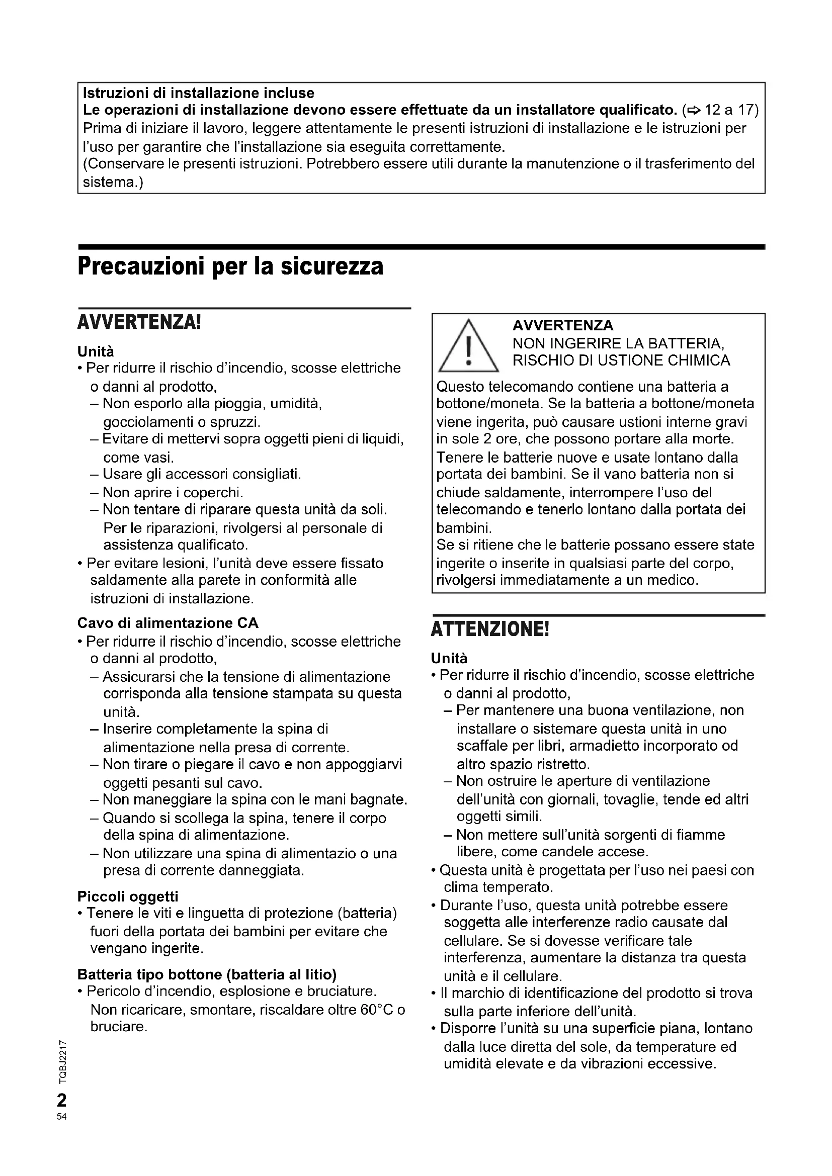 TQBJ2217_IT.fm Precauzioni per la sicurezza AVVERTENZA! Unità