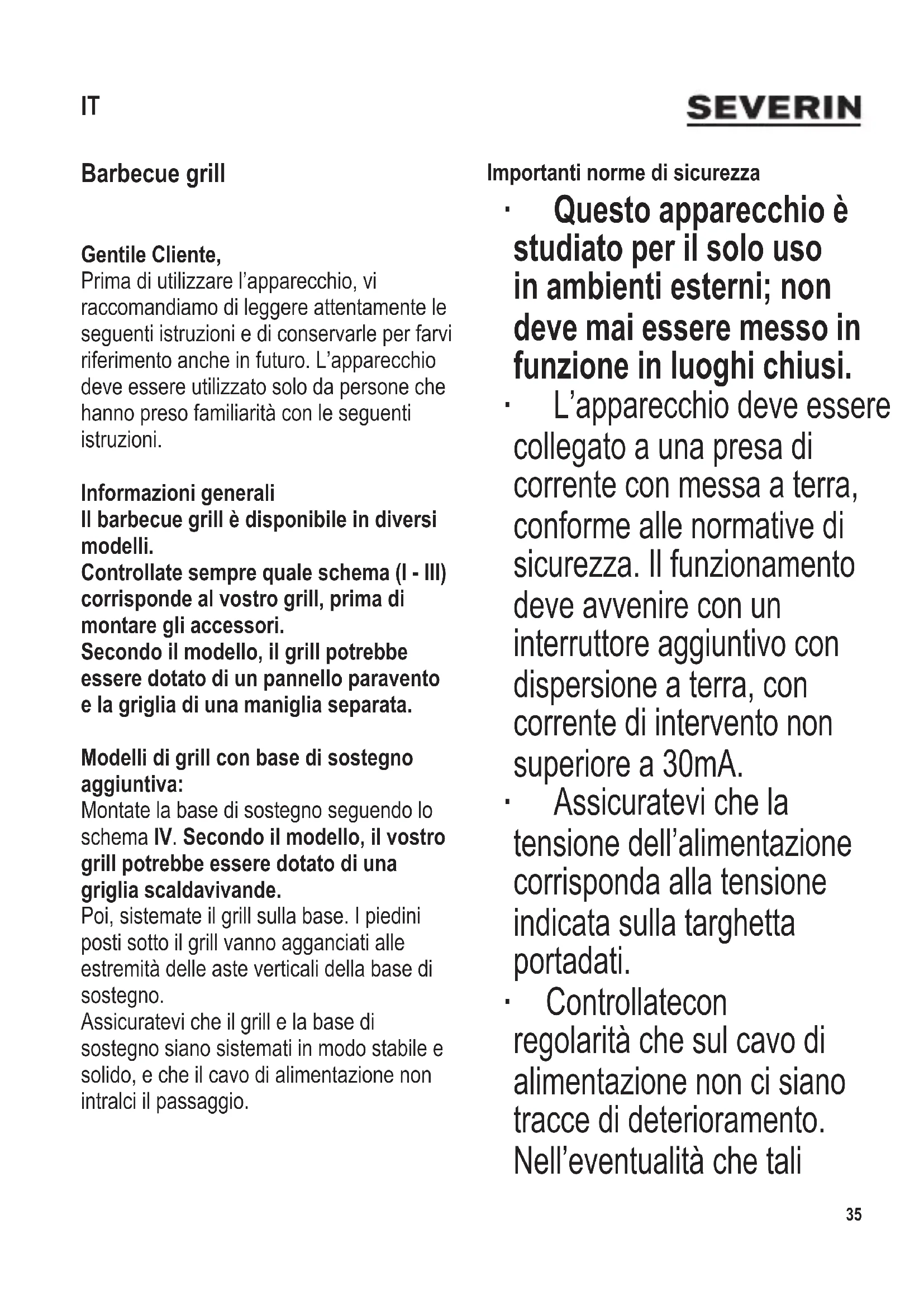 Barbecue grill Gentile Cliente, Prima di utilizzare l’apparecchio, vi raccomandiamo di leggere attentamente le seguenti istruzioni e di conservarle per farvi riferimento anche in futuro. L’apparecchio deve essere utilizzato solo da persone che hanno preso familiarità con le seguenti istruzioni. Informazioni generali Il barbecue grill è disponibile in diversi modelli. Controllate sempre quale schema (I - III) corrisponde al vostro grill, prima di montare gli accessori. Secondo il modello, il grill potrebbe essere dotato di un pannello paravento e la griglia di una maniglia separata. Modelli di grill con base di sostegno aggiuntiva: Montate la base di sostegno seguendo lo schema IV. Secondo il modello, il vostro grill potrebbe essere dotato di una griglia scaldavivande. Poi, sistemate il grill sulla base. I piedini posti sotto il grill vanno agganciati alle estremità delle aste verticali della base di sostegno. Assicuratevi che il grill e la base di sostegno siano sistemati in modo stabile e solido, e che il cavo di alimentazione non intralci il passaggio. Importanti norme di sicurezza ∙ Questo apparecchio è studiato per il solo uso in ambienti esterni; non deve mai essere messo in funzione in luoghi chiusi. ∙ L’apparecchio deve essere collegato a una presa di corrente con messa a terra, conforme alle normative di sicurezza. Il funzionamento deve avvenire con un interruttore aggiuntivo con dispersione a terra, con corrente di intervento non superiore a 30mA. ∙ Assicuratevi che la tensione dell’alimentazione corrisponda alla tensione indicata sulla targhetta portadati. ∙ Controllate con regolarità che sul cavo di alimentazione non ci siano tracce di deterioramento. Nell’eventualità che tali IT36 104 x 142 mm tracce siano rinvenute, l’apparecchio non va più usato. ∙ Prima di procedere alla pulizia del grill, vericate che la spina sia disinserita dalla rete elettrica e che l’apparecchio si sia raffreddato completamente. ∙ Per evitare rischi di scosse elettriche, non immergete mai l’elemento riscaldante o il cavo di alimentazione in liquidi ed evitatene sin’anche il contatto. ∙ Lavate la griglia con dell’acqua calda e sapone, o anche in lavastoviglie. Per informazioni più dettagliate su come pulire l’apparecchio, consultate la sezione Manutenzione e pulizia. ∙ L’apparecchio non è previsto per l’utilizzo con un timer esterno o con un sistema separato di comando a distanza. ∙ Per il funzionamento del grill, non usate mai, in nessuna circostanza, carbonella o altro combustibile solido o liquido. ∙ Avvertenza: Non coprite la griglia con fogli d’alluminio, piatti di portata o altri oggetti, l’accumulo di calore che ne risulterebbe potrebbe danneggiare seriamente il barbecue grill. ∙ Nell’immagine è indicata la quantità di acqua che va inserita nel recipiente del grill. ∙ Il presente apparecchio può essere usato da bambini (di almeno 8 anni di età) e da persone con ridotte capacità siche, sensoriali o mentali, o persone senza particolari esperienze o104 x 142 mm