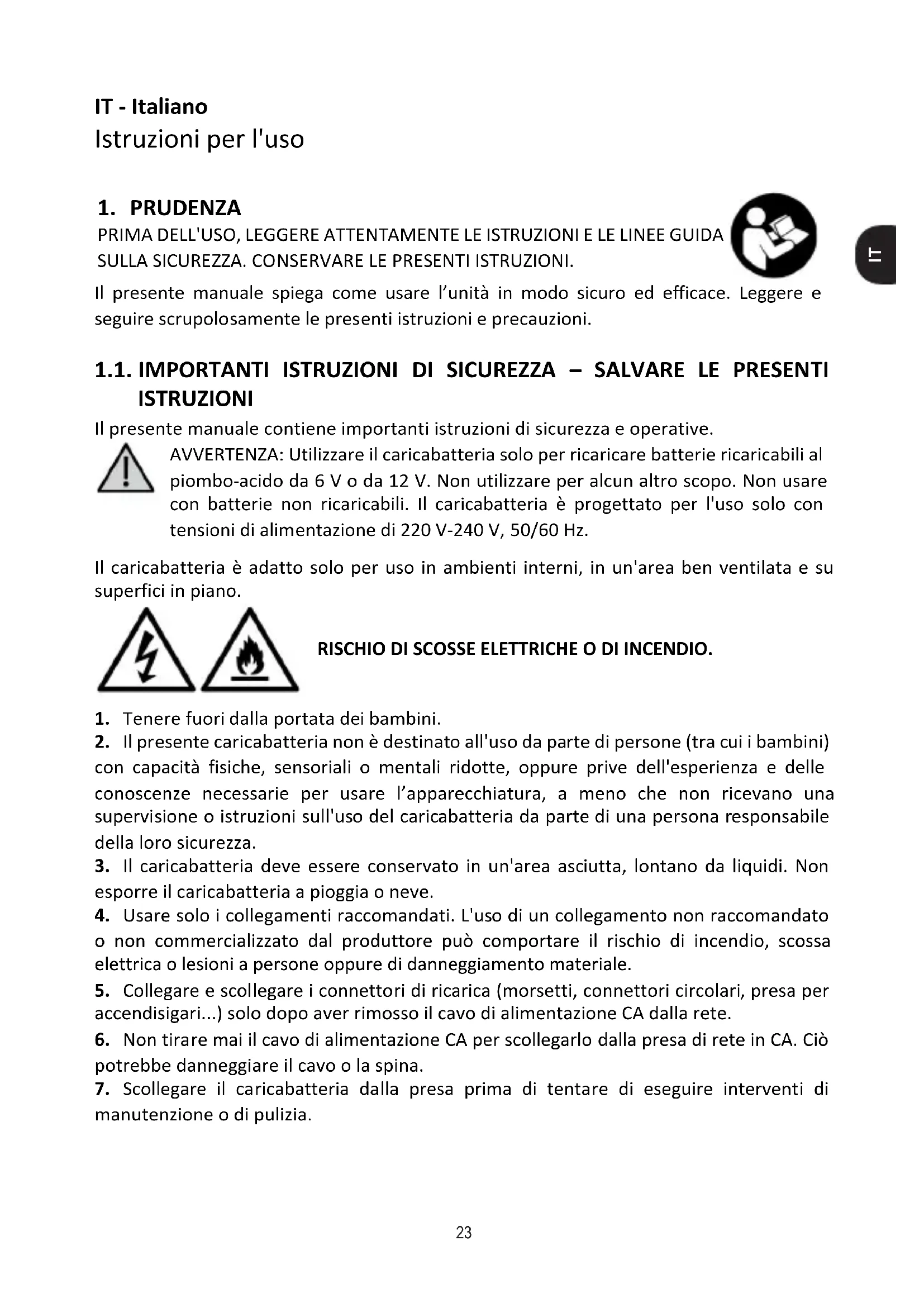 Il presente manuale spiega come usare l’unità in modo sicuro ed efficace. Leggere e seguire scrupolosamente le presenti istruzioni e precauzioni. 1.1. IMPORTANTI ISTRUZIONI DI SICUREZZA – SALVARE LE PRESENTI ISTRUZIONI Il presente manuale contiene importanti istruzioni di sicurezza e operative. AVVERTENZA: Utilizzare il caricabatteria solo per ricaricare batterie ricaricabili al piombo- acido da 6 V o da 12 V. Non utilizzare per alcun altro scopo. Non usare con batterie non ricaricabili. Il caricabatteria è progettato per l'uso solo con tensioni di alimentazione di 220 V-240 V, 50/60 Hz.