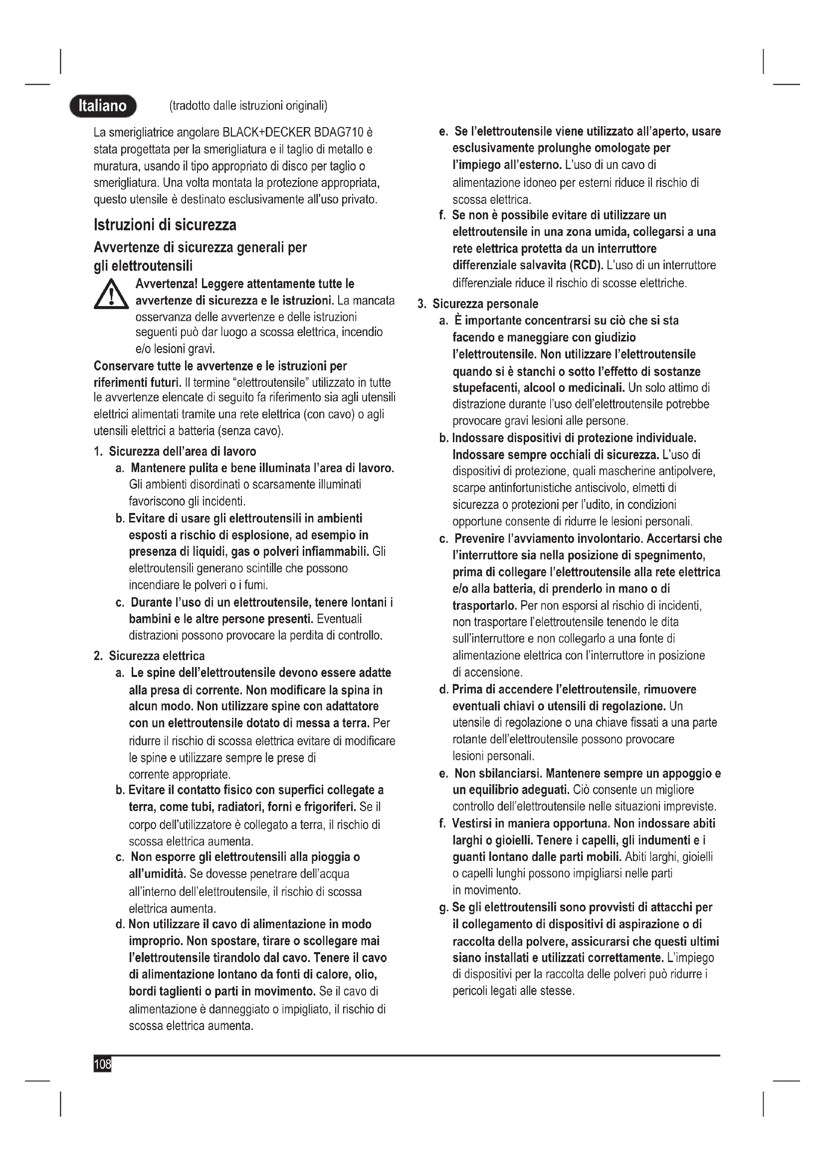 (tradotto dalle istruzioni originali) Italiano (tradotto dalle istruzioni originali) La smerigliatrice angolare BLACK+DECKER BDAG710 è stata progettata per la smerigliatura e il taglio di metallo e muratura, usando il tipo appropriato di disco per taglio o smerigliatura. Una volta montata la protezione appropriata, questo utensile è destinato esclusivamente all’uso privato. Istruzioni di sicurezza Avvertenze di sicurezza generali per gli elettroutensili