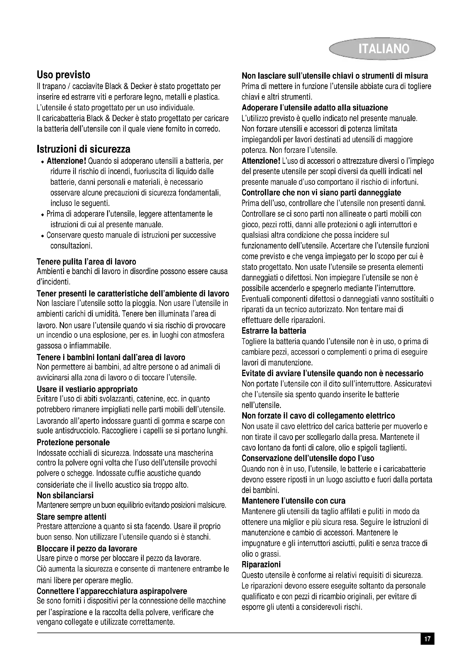 Colin Wills Director of Engineering BDCI, 4/F, 2 Dai Wang Street Tai Po Industrial Estate Tai Po NT, Hong Kong Garantie Black & Decker est confiant dans la qualité de ses produits et vous offre une garantie très étendue. Ce certificat de garantie est un document supplémentaire et ne peut en aucun cas se substituer à vos droits légaux. La garantie est valable sur tout le territoire des Etats Membres de l’Union Européenne et de la Zone de Libre Echange Européenne. Si un produit Black & Decker s’avère défectueux en raison de matériaux en mauvaises conditions, d’une erreur humaine, ou d’un manque de conformité dans les 24 mois suivant la date d’achat, Black & Decker garantit le remplacement des pièces défectueuses, la réparation des produits usés ou cassés ou remplace ces produits à la convenance du client, sauf dans les circonstances suivantes : ◆ Le produit a été utilisé dans un but commercial, professionnel, ou a été loué. ◆ Le produit a été mal utilisé ou avec négligence.◆ Le produit a subi des dommages à cause d’objets étrangers, de substances ou à cause d’accidents. ◆ Des réparations ont été tentées par des techniciens ne faisant pas partie du service technique de Black & Decker. Pour avoir recours à la garantie, il est nécessaire de fournir une preuve d’achat au vendeur ou à un réparateur agréé. Pour connaître l’adresse du réparateur agréé le plus proche de chez vous, contactez le bureau Black & Decker à l’adresse indiquée dans ce manuel. Vous pourrez aussi trouver une liste des réparateurs agréés de Black & Decker et de plus amples détails sur notre service après-vente sur le site Internet à l’adresse suivante : www.2helpU.com.17 ITALIANO Uso previsto Il trapano / cacciavite Black & Decker è stato progettato per inserire ed estrarre viti e perforare legno, metalli e plastica. L’utensile é stato progettato per un uso individuale. Il caricabatteria Black & Decker è stato progettato per caricare la batteria dell’utensile con il quale viene fornito in corredo. Istruzioni di sicurezza ◆ Attenzione! Quando si adoperano utensili a batteria, per ridurre il rischio di incendi, fuoriuscita di liquido dalle batterie, danni personali e materiali, è necessario osservare alcune precauzioni di sicurezza fondamentali, incluso le seguenti. ◆ Prima di adoperare l’utensile, leggere attentamente le istruzioni di cui al presente manuale. ◆ Conservare questo manuale di istruzioni per successive consultazioni. Tenere pulita l’area di lavoro Ambienti e banchi di lavoro in disordine possono essere causa d’incidenti. Tener presenti le caratteristiche dell’ambiente di lavoro Non lasciare l’utensile sotto la pioggia. Non usare l’utensile in ambienti carichi di umidità. Tenere ben illuminata l’area di lavoro. Non usare l’utensile quando vi sia rischio di provocare un incendio o una esplosione, per es. in luoghi con atmosfera gassosa o infiammabile. Tenere i bambini lontani dall’area di lavoro Non permettere ai bambini, ad altre persone o ad animali di avvicinarsi alla zona di lavoro o di toccare l’utensile. Usare il vestiario appropriato Evitare l’uso di abiti svolazzanti, catenine, ecc. in quanto potrebbero rimanere impigliati nelle parti mobili dell’utensile. Lavorando all’aperto indossare guanti di gomma e scarpe con suole antisdrucciolo. Raccogliere i capelli se si portano lunghi. Protezione personale Indossate occhiali di sicurezza. Indossate una mascherina contro la polvere ogni volta che l’uso dell’utensile provochi polvere o schegge. Indossate cuffie acustiche quando consideriate che il livello acustico sia troppo alto. Non sbilanciarsi Mantenere sempre un buon equilibrio evitando posizioni malsicure. Stare sempre attenti Prestare attenzione a quanto si sta facendo. Usare il proprio buon senso. Non utilizzare l’utensile quando si è stanchi. Bloccare il pezzo da lavorare Usare pinze o morse per bloccare il pezzo da lavorare. Ciò aumenta la sicurezza e consente di mantenere entrambe le mani libere per operare meglio. Connettere l’apparecchiatura aspirapolvere Se sono forniti i dispositivi per la connessione delle macchine per l’aspirazione e la raccolta della polvere, verificare che vengano collegate e utilizzate correttamente. Non lasciare sull’utensile chiavi o strumenti di misura Prima di mettere in funzione l’utensile abbiate cura di togliere chiavi e altri strumenti. Adoperare l’utensile adatto alla situazione L’utilizzo previsto è quello indicato nel presente manuale. Non forzare utensili e accessori di potenza limitata impiegandoli per lavori destinati ad utensili di maggiore potenza. Non forzare l’utensile. Attenzione! L’uso di accessori o attrezzature diversi o l’impiego del presente utensile per scopi diversi da quelli indicati nel presente manuale d’uso comportano il rischio di infortuni. Controllare che non vi siano parti danneggiate Prima dell’uso, controllare che l’utensile non presenti danni. Controllare se ci sono parti non allineate o parti mobili con gioco, pezzi rotti, danni alle protezioni o agli interruttori e qualsiasi altra condizione che possa incidere sul funzionamento dell’utensile. Accertare che l’utensile funzioni come previsto e che venga impiegato per lo scopo per cui è stato progettato. Non usate l’utensile se presenta elementi danneggiati o difettosi. Non impiegare l’utensile se non è possibile accenderlo e spegnerlo mediante l’interruttore. Eventuali componenti difettosi o danneggiati vanno sostituiti o riparati da un tecnico autorizzato. Non tentare mai di effettuare delle riparazioni. Estrarre la batteria Togliere la batteria quando l’utensile non è in uso, o prima di cambiare pezzi, accessori o complementi o prima di eseguire lavori di manutenzione. Evitate di avviare l’utensile quando non è necessario Non portate l’utensile con il dito sull’interruttore. Assicuratevi che l’utensile sia spento