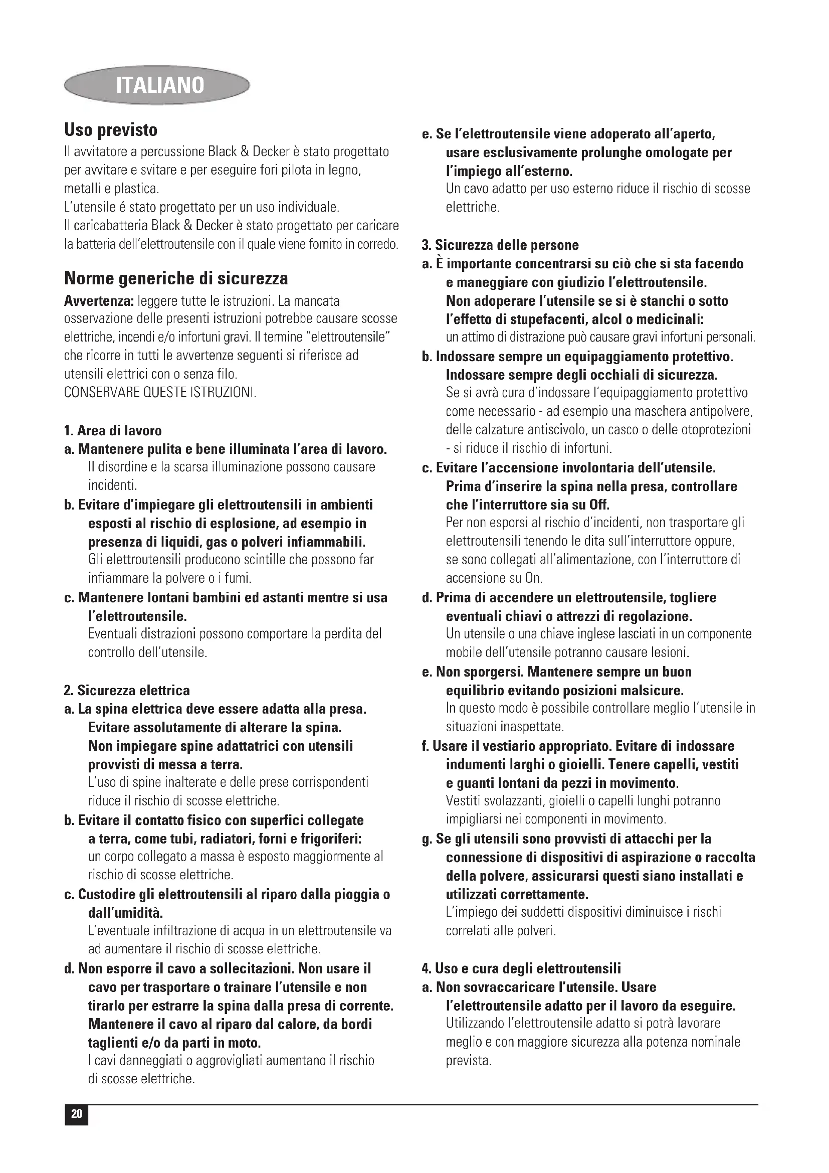 a. Fare riparare l’utensile esclusivamente da personale qualificato e solo impiegando pezzi di ricambio originali, onde non alterare la sicurezza dell’utensile. Ulteriori istruzioni di sicurezza per trapani a percussione ◆ Indossare protezioni acustiche per utilizzare i trapani a percussione. L’esposizione al rumore può causare la perdita dell’udito. ◆ Utilizzare le impugnature ausiliarie fornite con l’elettroutensile. La perdita di controllo può causare lesioni. Istruzioni addizionali di sicurezza per trapani/avvitatori ◆ Eseguendo lavori in cui l’elettroutensile da taglio può entrare in contatto con linee elettriche nascoste o con il cavo di alimentazione, afferrare l’elettroutensile tramite le apposite impugnature isolanti. In caso di contatto con una linea sotto tensione, le parti metalliche dell’elettroutensile vengono sottoposte a tensione provocando una scossa elettrica. ◆ Utilizzare morsetti o un altro metodo sicuro per fissare e supportare il pezzo in lavorazione su una piattaforma stabile. Sostenere il pezzo in lavorazione a mano o appoggiato al proprio corpo, lo lascia in posizione instabile e può causare perdite di controllo. ◆ Prima di forare pareti, pavimenti o soffitti, verificare l’ubicazione di cavi elettrici e tubazioni. ◆ Evitate di toccare la punta del trapano appena dopo aver forato, può essere molto calda. Istruzioni supplementari sulla sicurezza per batterie e caricatori Batterie ◆ Non tentare mai di aprirle, per nessuna ragione. ◆ Non esporre la batteria all’acqua. ◆ Non conservarle in ambienti in cui la temperatura può superare i 40 ºC. ◆ Caricarle solo ad una temperatura ambientale compresa tra 10 ºC e 40 ºC. ◆ Caricare la batteria solo usando il caricabatteria fornito con l’elettroutensile.22 ITALIANO ◆ Prima di smaltire le batterie, consultare le istruzioni riportate nella sezione “Protezione dell’ambiente”. Caricabatterie ◆ Usare il caricabatteria Black & Decker soltanto per caricare le batterie fornite con l’elettroutensile. Batterie di altro tipo possono esplodere, provocando danni a persone e cose. ◆ Non tentare mai di ricaricare una batteria non ricaricabile. ◆ Sostituire immediatamente i cavi difettosi. ◆ Non esporre il caricabatteria all’acqua. ◆ Non aprire il caricabatteria. ◆ Non applicare i puntali di un multimetro sul caricabatteria. Il caricabatteria è destinato ad essere usato esclusivamente in ambienti interni. Leggere il manuale di istruzioni prima dell’uso. Trasformatore isolante a prova di guasto. L’alimentazione di rete è separata elettricamente dall’uscita del trasformatore. Il caricabatteria si spegne automaticamente se la temperatura ambiente sale eccessivamente. Come conseguenza, il caricabatteria diventerà inutilizzabile. L’unità dovrà essere scollegata dalla rete elettrica e portata presso un centro assistenza autorizzato per la riparazione. Sicurezza elettrica Il caricatore è fornito di doppio isolamento, per la quale non è richiesta la messa a terra. Assicurarsi che la tensione del caricatore corrisponda a quella erogata dalla rete. Non cercate di rimpiazzare il carica batteria inserendo l’utensile in una presa di corrente. ◆ L’elettroutensile non deve essere utilizzato da ragazzi o persone inabili senza la supervisione di un adulto. Controllare i bambini per evitare che giochino con l’elettroutensile. ◆ Se il cavo elettrico in dotazione risulta danneggiato, deve essere sostituito dal produttore o da un Centro di assistenza autorizzato Black & Decker, onde evitare rischi. Informazioni generali