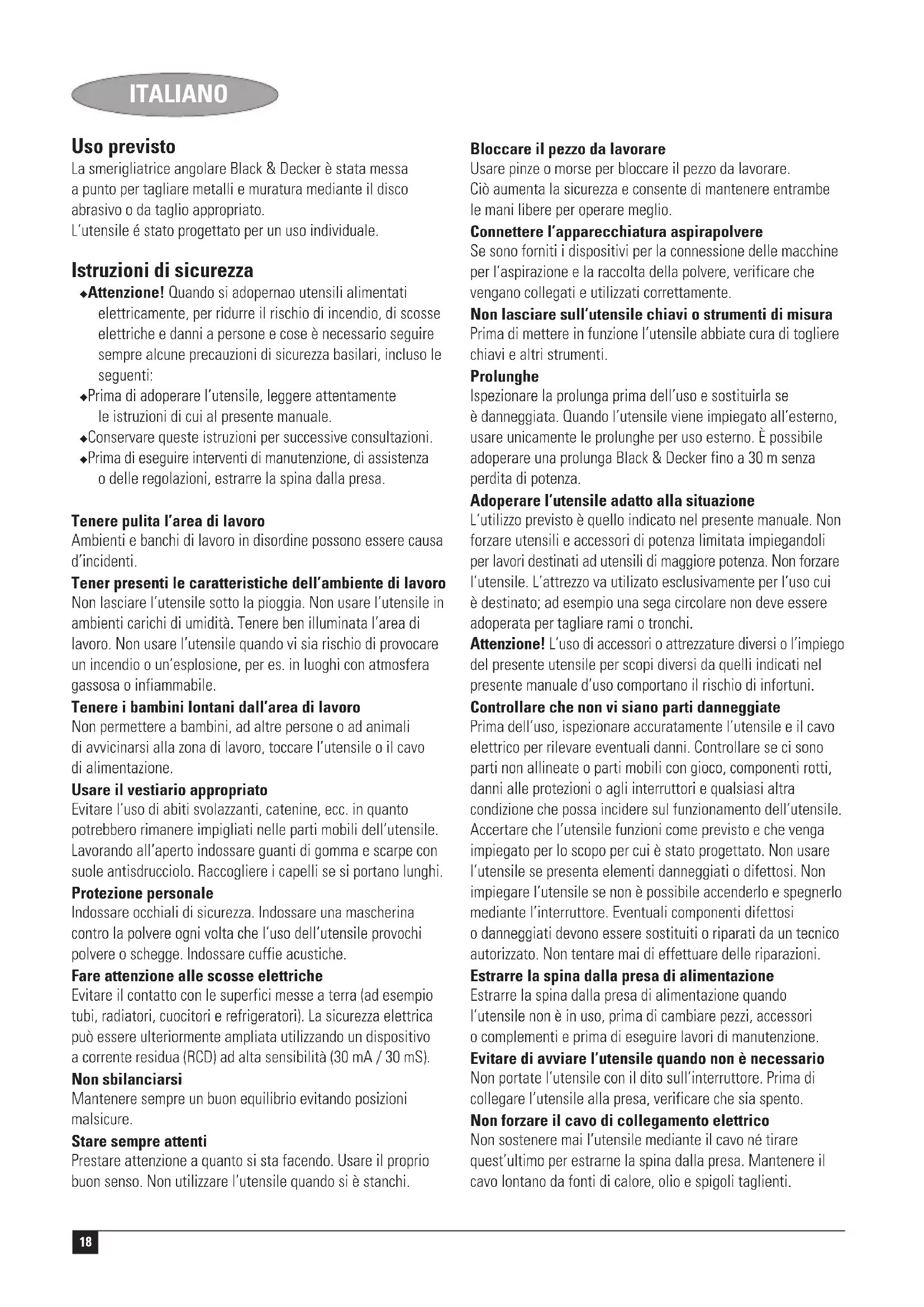 Kevin Hewitt Directeur Ingénierie Client Spennymoor, County Durham DL16 6JG, Royaume Uni 1-5-2005 Garantie Black & Decker est confiant dans la qualité de ses produits et vous offre une garantie très étendue. Ce certificat de garantie est un document supplémentaire et ne peut en aucun cas se substituer à vos droits légaux. La garantie est valable sur tout le territoire des Etats Membres de l’Union Européenne et de la Zone de Libre Echange Européenne.17 FRANÇAIS Si un produit Black & Decker s’avère défectueux en raison de matériaux en mauvaises conditions, d’une erreur humaine, ou d’un manque de conformité dans les 24 mois suivant la date d’achat, Black & Decker garantit le remplacement des pièces défectueuses, la réparation des produits usés ou cassés ou remplace ces produits à la convenance du client, sauf dans les circonstances suivantes : ◆ Le produit a été utilisé dans un but commercial, professionnel, ou a été loué. ◆ Le produit a été mal utilisé ou avec négligence. ◆ Le produit a subi des dommages à cause d’objets étrangers, de substances ou à cause d’accidents. ◆ Des réparations ont été tentées par des techniciens ne faisant pas partie du service technique de Black & Decker. Pour avoir recours à la garantie, il est nécessaire de fournir une preuve d’achat au vendeur ou à un réparateur agréé. Pour connaître l’adresse du réparateur agréé le plus proche de chez vous, contactez le bureau Black & Decker à l’adresse indiquée dans ce manuel. Vous pourrez aussi trouver une liste des réparateurs agréés de Black & Decker et de plus amples détails sur notre service après-vente sur le site Internet à l’adresse suivante : www.2helpU.com Visitez notre site Web www.blackanddecker.fr pour enregistrer votre nouveau produit Black & Decker et être informé des nouveaux produits et des offres spéciales. Pour plus d’informations concernant la marque Black & Decker et notre gamme de produits, consultez notre site www.blackanddecker.fr18 ITALIANO Uso previsto La smerigliatrice angolare Black & Decker è stata messa a punto per tagliare metalli e muratura mediante il disco abrasivo o da taglio appropriato. L’utensile é stato progettato per un uso individuale. Istruzioni di sicurezza ◆ Attenzione! Quando si adopernao utensili alimentati elettricamente, per ridurre il rischio di incendio, di scosse elettriche e danni a persone e cose è necessario seguire sempre alcune precauzioni di sicurezza basilari, incluso le seguenti: ◆ Prima di adoperare l’utensile, leggere attentamente le istruzioni di cui al presente manuale. ◆ Conservare queste istruzioni per successive consultazioni. ◆ Prima di eseguire interventi di manutenzione, di assistenza o delle regolazioni, estrarre la spina dalla presa. Tenere pulita l’area di lavoro Ambienti e banchi di lavoro in disordine possono essere causa d’incidenti. Tener presenti le caratteristiche dell’ambiente di lavoro Non lasciare l’utensile sotto la pioggia. Non usare l’utensile in ambienti carichi di umidità. Tenere ben illuminata l’area di lavoro. Non usare l’utensile quando vi sia rischio di provocare un incendio o un’esplosione, per es. in luoghi con atmosfera gassosa o infiammabile. Tenere i bambini lontani dall’area di lavoro Non permettere a bambini, ad altre persone o ad animali di avvicinarsi alla zona di lavoro, toccare l’utensile o il cavo di alimentazione. Usare il vestiario appropriato Evitare l’uso di abiti svolazzanti, catenine, ecc. in quanto potrebbero rimanere impigliati nelle parti mobili dell’utensile. Lavorando all’aperto indossare guanti di gomma e scarpe con suole antisdrucciolo. Raccogliere i capelli se si portano lunghi. Protezione personale Indossare occhiali di sicurezza. Indossare una mascherina contro la polvere ogni volta che l’uso dell’utensile provochi polvere o schegge. Indossare cuffie acustiche. Fare attenzione alle scosse elettriche Evitare il contatto con le superfici messe a terra (ad esempio tubi, radiatori, cuocitori e refrigeratori). La sicurezza elettrica può essere ulteriormente ampliata utilizzando un dispositivo a corrente residua (RCD) ad alta sensibilità (30 mA / 30 mS). Non sbilanciarsi Mantenere sempre un buon equilibrio evitando posizioni malsicure. Stare sempre attenti Prestare attenzione a quanto si sta facendo. Usare il proprio buon senso. Non utilizzare l’utensile quando si è stanchi. Bloccare il pezzo da lavorare Usare pinze o morse per bloccare il pezzo da lavorare. Ciò aumenta la sicurezza e consente di mantenere entrambe le mani libere per operare meglio. Connettere l’apparecchiatura aspirapolvere Se sono forniti i dispositivi per la connessione delle macchine per l’aspirazione e la raccolta della polvere, verificare che vengano collegati e utilizzati correttamente. Non lasciare sull’utensile chiavi o strumenti di misura Prima di mettere in funzione l’utensile abbiate cura di togliere chiavi e altri strumenti. Prolunghe Ispezionare la prolunga prima dell’uso e sostituirla se è danneggiata. Quando l’utensile viene impiegato all’esterno, usare unicamente le prolunghe per uso esterno. È possibile adoperare una prolunga Black & Decker fino a 30 m senza perdita di potenza. Adoperare l’utensile adatto alla situazione L’utilizzo previsto è quello indicato nel presente manuale. Non forzare utensili e accessori di potenza limitata impiegandoli per lavori destinati ad utensili di maggiore potenza. Non forzare l’utensile. L’attrezzo va utilizato esclusivamente per l’uso cui è destinato; ad esempio una sega circolare non deve essere adoperata per tagliare rami o tronchi. Attenzione! L’uso di accessori o attrezzature diversi o l’impiego del presente utensile per scopi diversi da quelli indicati nel presente manuale d’uso comportano il rischio di infortuni. Controllare che non vi siano parti danneggiate Prima dell’uso, ispezionare accuratamente l’utensile e