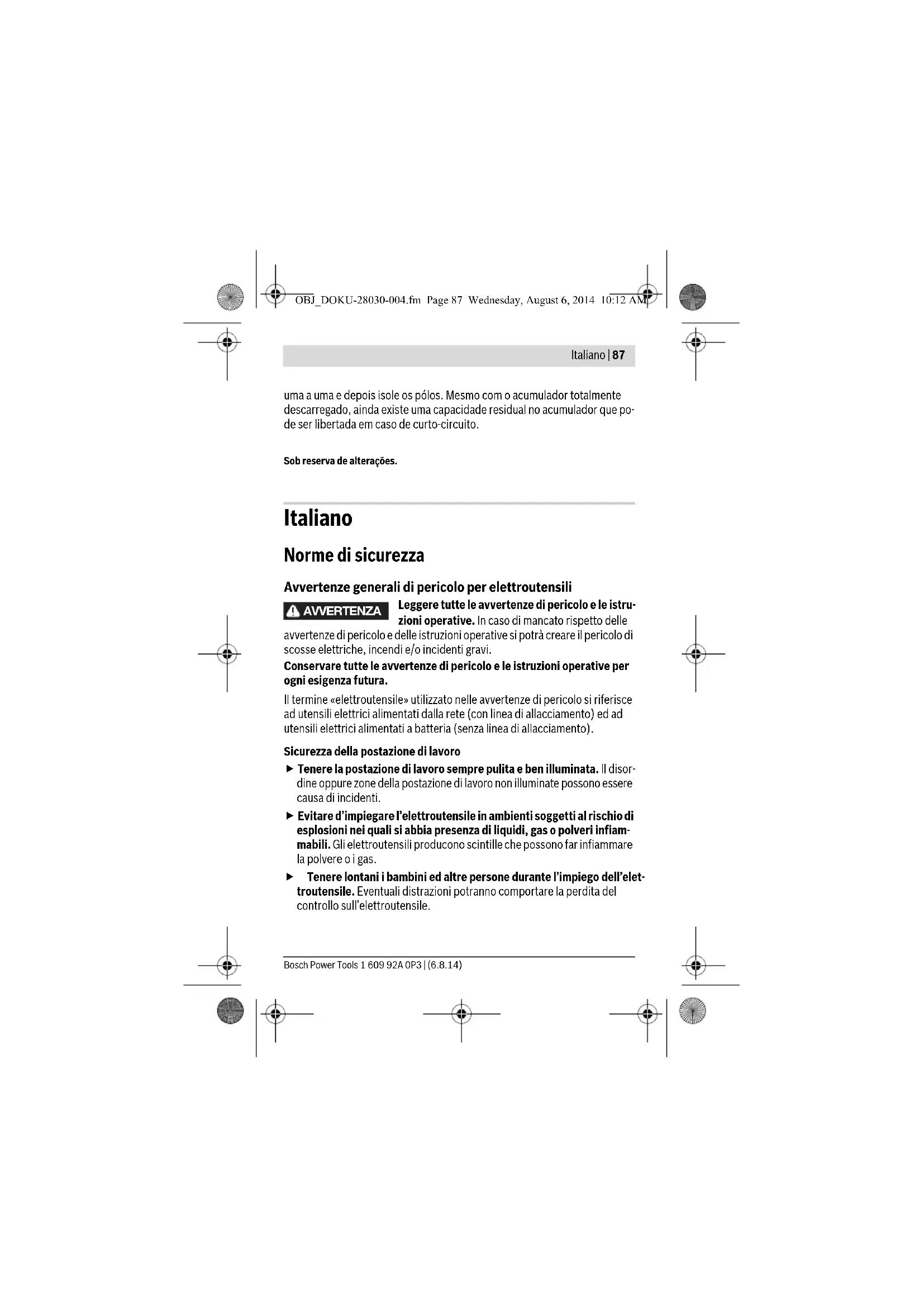 Caricare la batteria ricaricabile solo ed esclusivamente nei dispositivi di carica consigliati dal produttore. Per un dispositivo di carica previsto per un determinato tipo di batteria sussiste pericolo di incendio se viene utilizzato con un tipo diverso di batteria ricaricabile. Avere cura d’impiegare negli elettroutensili solo ed esclusivamente batterie ricaricabili esplicitamente previste. L’uso di batterie ricarica- bili di tipo diverso potrà dare insorgenza a lesioni e comportare il rischio d’incendi. Non avvicinare batterie non utilizzate a fermagli, monete, chiavi, chiodi, viti e neppure ad altri piccoli oggetti metallici che potrebbero provocare un cavallottamento dei contatti. Un eventuale corto circuito tra i contatti dell’accumulatore potrà dare origine a bruciature o ad incendi. OBJ_DOKU-28030-004.fm Page 90 Wednesday, August 6, 2014 10:12 AMBosch Power Tools 1 609 92A 0P3 | (6.8.14) Italiano | 91 In caso d’impiego errato si provoca il pericolo di fuoriuscita di liquido dalla batteria ricaricabile. Evitarne assolutamente il contatto. In caso di contatto accidentale, sciacquare accuratamente con acqua. Rivol- gersi immediatamente al medico, qualora il liquido dovesse entrare in contatto con gli occhi. Il liquido fuoriuscito dalla batteria ricaricabile potrà causare irritazioni cutanee o ustioni. Assistenza Fare riparare l’elettroutensile solo ed esclusivamente da personale specializzato e solo impiegando pezzi di ricambio originali. In tale ma- niera potrà essere salvaguardata la sicurezza dell’elettroutensile. Norme di sicurezza per avvitatore Tenere l’apparecchio per le superfici isolate dell’impugnatura qualo- ra venissero effettuati lavori durante i quali la vite potrebbe venire a contatto con cavi elettrici nascosti. Il contatto della vite con un cavo sotto tensione può mettere sotto tensione anche parti metalliche dell’ap- parecchio, causando una scossa elettrica. Tenere sempre ben saldo l’elettroutensile. Serrando a fondo ed allen- tando le viti è possibile che si verifichino temporaneamente alti momenti di reazione. Assicurare il pezzo in lavorazione. Un pezzo in lavorazione può essere bloccato con sicurezza in posizione solo utilizzando un apposito dispositi- vo di serraggio oppure una morsa a vite e non tenendolo con la semplice mano. Prima di posare l’elettroutensile, attendere sempre fino a quando si sarà fermato completamente. L’accessorio può incepparsi e comporta- re la perdita di controllo dell’elettroutensile. Prima di effettuare lavori all’elettroutensile (ad es. lavori di manu- tenzione, cambio d’utensile, ecc.), nonché in caso di trasporto e di conservazione dello stesso, avere sempre cura di portare in posizio- ne media il commutatore per la reversibilità. In difetto, sussisterà il pe- ricolo di lesioni in caso di azionamento accidentale dell’interruttore di av- vio/di arresto. OBJ_DOKU-28030-004.fm Page 91 Wednesday, August 6, 2014 10:12 AM1 609 92A 0P3 | (6.8.14) Bosch Power Tools 92 | Italiano Proteggere l’elettroutensile dal calore, p. es. anche dall’irra- diamento solare continuo, dal fuoco, dall’acqua e dall’umidità. Esiste pericolo di esplosione. In caso di difetto e di uso improprio della batteria ricaricabile vi è il pericolo di una fuoriuscita di vapori. Far entrare aria fresca e farsi vi- sitare da un medico in caso di disturbi. I vapori possono irritare le vie re- spiratorie. Indicazioni di sicurezza per caricabatteria Il presente caricabatteria non è previsto per l’utilizzo da parte di bambini, persone con li- mitate capacità fisiche, sensoriali o mentali o persone con scarsa conoscenza ed espe- rienza. Il presente caricabatteria può essere utilizzato da bambini a partire dagli 8 anni di età, da persone con limitate capacità fisi- che, sensoriali o mentali e da persone con scarsa conoscenza ed esperienza, purché si- ano sorvegliati da una persona responsabile della loro sicurezza o siano stati istruiti in merito all’impiego sicuro del caricabatteria e ai relativi pericoli. In caso contrario sussiste il rischio di utilizzo errato e di lesioni. Sorvegliare i bambini. In questo modo viene assicurato che i bambini non giocano con la sta- zione di ricarica. OBJ_DOKU-28030-004.fm Page 92 Wednesday, August 6, 2014 10:12 AMBosch Power Tools 1 609 92A 0P3 | (6.8.14) Italiano | 93 La pulizia e la manutenzione della stazione di ricarica da parte di bambini non deve av- venire senza sorveglianza. Custodire il caricabatteria al riparo dalla pioggia o dall’umidità. L’eventuale infiltrazione di acqua in un caricabatteria va ad au- mentare il rischio d’insorgenza di scosse elettriche. Caricare esclusivamente batterie al litio integrate in prodotti Bosch. La tensione della batteria deve essere adatta alla tensione di ricarica batteria del caricabatteria. Sussiste pericolo di incendio ed esplosione. Avere cura di mantenere il caricabatteria sempre pulito. Attraverso accumuli di sporcizia si crea il pericolo di una scossa elettrica. Prima di ogni impiego controllare il caricabatteria, il cavo e la spina. Non utilizzare il caricabatteria in caso doveste riscontrare dei danni. Non aprire mai personalmente il caricabatteria e farlo riparare sol- tanto da personale qualificato e soltanto con pezzi di ricambio origi- nali. In caso di caricabatterie per batterie, cavi e spine danneggiate si au- menta il pericolo di una scossa elettrica. Non utilizzare il caricabatteria su basi facilmente infiammabili (p. es. carta, tessuti ecc.) oppure in ambienti infiammabili. Per via del riscal- damento del caricabatteria che si ha durante la fase di ricarica si viene a creare il pericolo di incendio. Descrizione del prodotto e caratteristiche Leggere tutte le avvertenze di pericolo e le istruzioni operative. In caso di mancato ri- spetto delle avvertenze di pericolo e delle istruzioni operative si potrà creare il pericolo di scosse elettriche, incendi e/o incidenti gravi. Uso conforme alle norme La macchina 