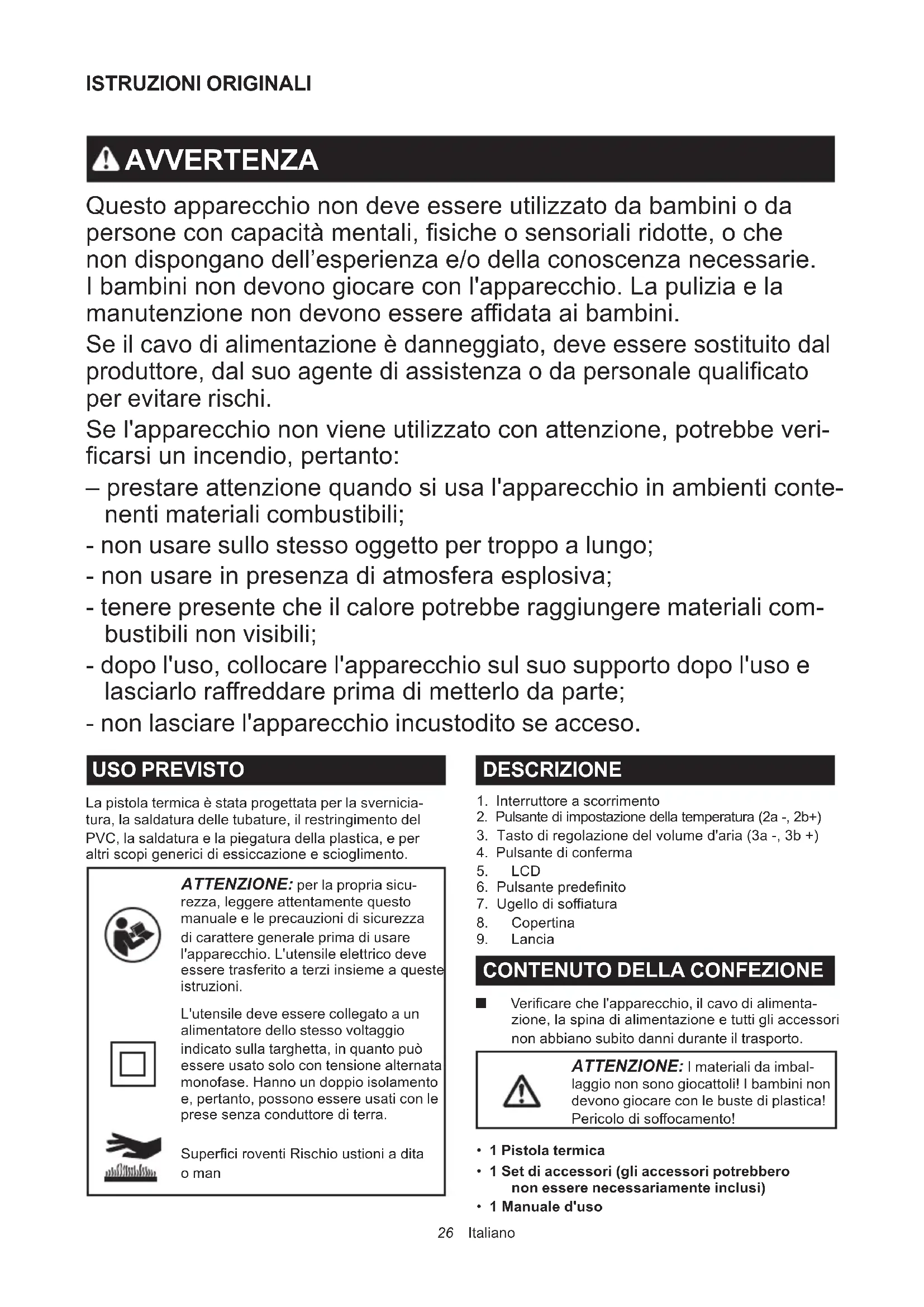 UMWELT Nur für EU-Länder Aufgrund des Vorhandenseins gefährlicher Komponenten in der Ausrüstung können Elektro- und Elektronik-Altgeräte sich negativ auf die Umwelt und die menschliche Gesundheit auswirken. Entsorgen Sie Elektro- und Elektronikgeräte nicht mit dem Hausmüll! In Übereinstimmung mit der Europäischen Richtlinie über Elektro- und Elektronik-Altgeräte und ihrer Anpassung an nationales Recht sollten Elektro- und Elektronik-Altgeräte gemäß den Umweltschutzbestimmungen getrennt gesammelt und zu einer getrennten Sammelstelle für Siedlungsabfälle geliefert werden. Dies wird durch das am Gerät angebrachte Symbol der durchgestrichenen Abfalltonne auf Rädern angezeigt.26 Italiano ISTRUZIONI ORIGINALI AVVERTENZA Questo apparecchio non deve essere utilizzato da bambini o da persone con capacità mentali, siche o sensoriali ridotte, o che non dispongano dell’esperienza e/o della conoscenza necessarie. I bambini non devono giocare con l'apparecchio. La pulizia e la manutenzione non devono essere adata ai bambini. Se il cavo di alimentazione è danneggiato, deve essere sostituito dal produttore, dal suo agente di assistenza o da personale qualicato per evitare rischi. Se l'apparecchio non viene utilizzato con attenzione, potrebbe veri- carsi un incendio, pertanto: – prestare attenzione quando si usa l'apparecchio in ambienti conte- nenti materiali combustibili; - non usare sullo stesso oggetto per troppo a lungo; - non usare in presenza di atmosfera esplosiva; - tenere presente che il calore potrebbe raggiungere materiali com- bustibili non visibili; - dopo l'uso, collocare l'apparecchio sul suo supporto dopo l'uso e lasciarlo rareddare prima di metterlo da parte; - non lasciare l'apparecchio incustodito se acceso. USO PREVISTO La pistola termica è stata progettata per la svernicia- tura, la saldatura delle tubature, il restringimento del PVC, la saldatura e la piegatura della plastica, e per altri scopi generici di essiccazione e scioglimento. ATTENZIONE: per la propria sicu- rezza, leggere attentamente questo manuale e le precauzioni di sicurezza di carattere generale prima di usare l'apparecchio. L'utensile elettrico deve essere trasferito a terzi insieme a queste istruzioni. L'utensile deve essere collegato a un alimentatore dello stesso voltaggio indicato sulla targhetta, in quanto può essere usato solo con tensione alternata monofase. Hanno un doppio isolamento e, pertanto, possono essere usati con le prese senza conduttore di terra. Superci roventi Rischio ustioni a dita o man DESCRIZIONE