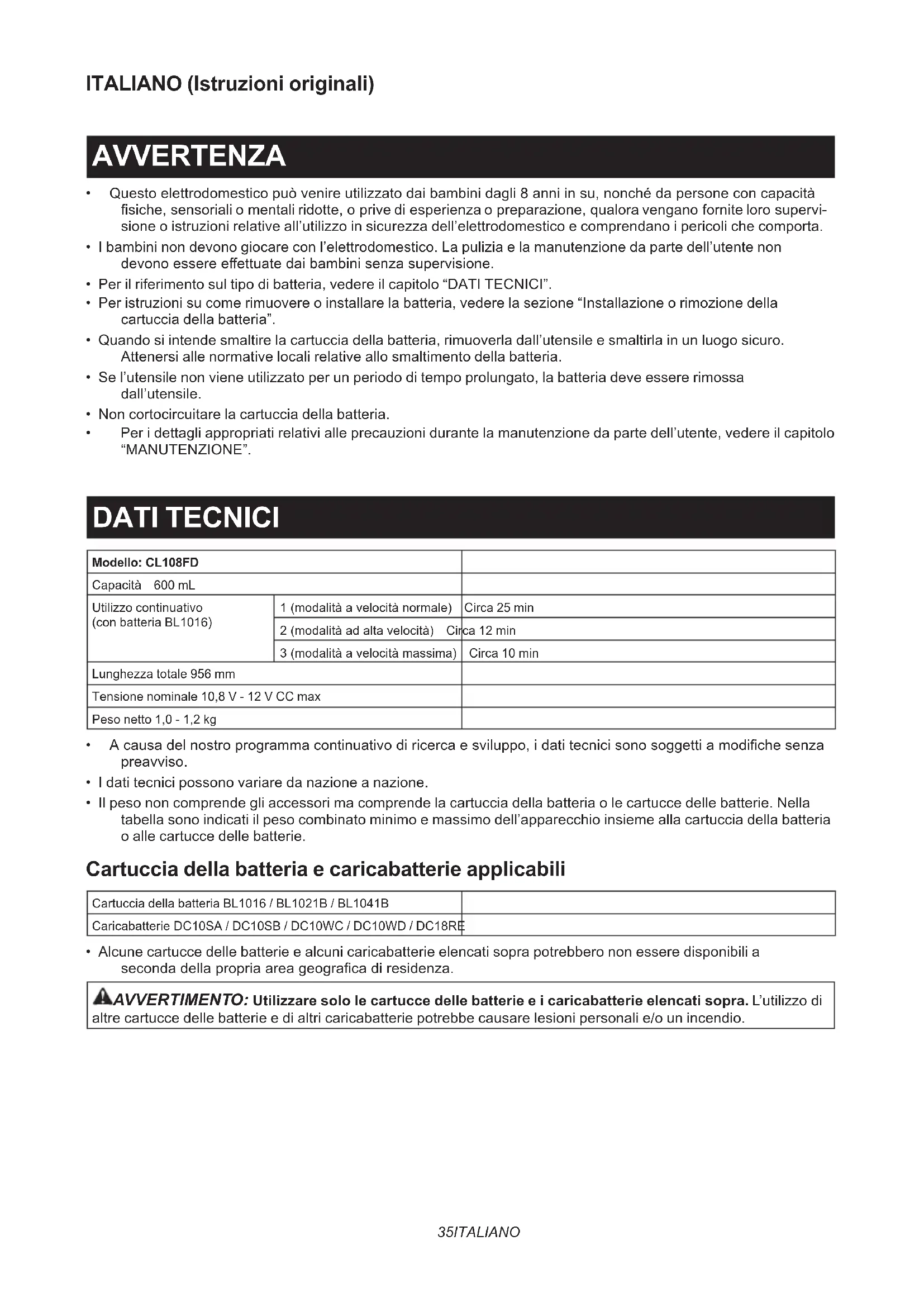 - Per i dettagli appropriati relativi alle precauzioni durante la manutenzione da parte dell’utente, vedere il capitolo “MANUTENZIONE”. DATI TECNICI Modello: CL108FD Capacità 600 mL Utilizzo continuativo (con batteria BL1016) 1(modalitàavelocitànormale) Circa 25 min 2(modalitàadaltavelocità) Circa 12 min 3(modalitàavelocitàmassima) Circa 10 min Lunghezza totale 956 mm Tensione nominale 10,8 V - 12 V CC max Peso netto 1,0 - 1,2 kg
