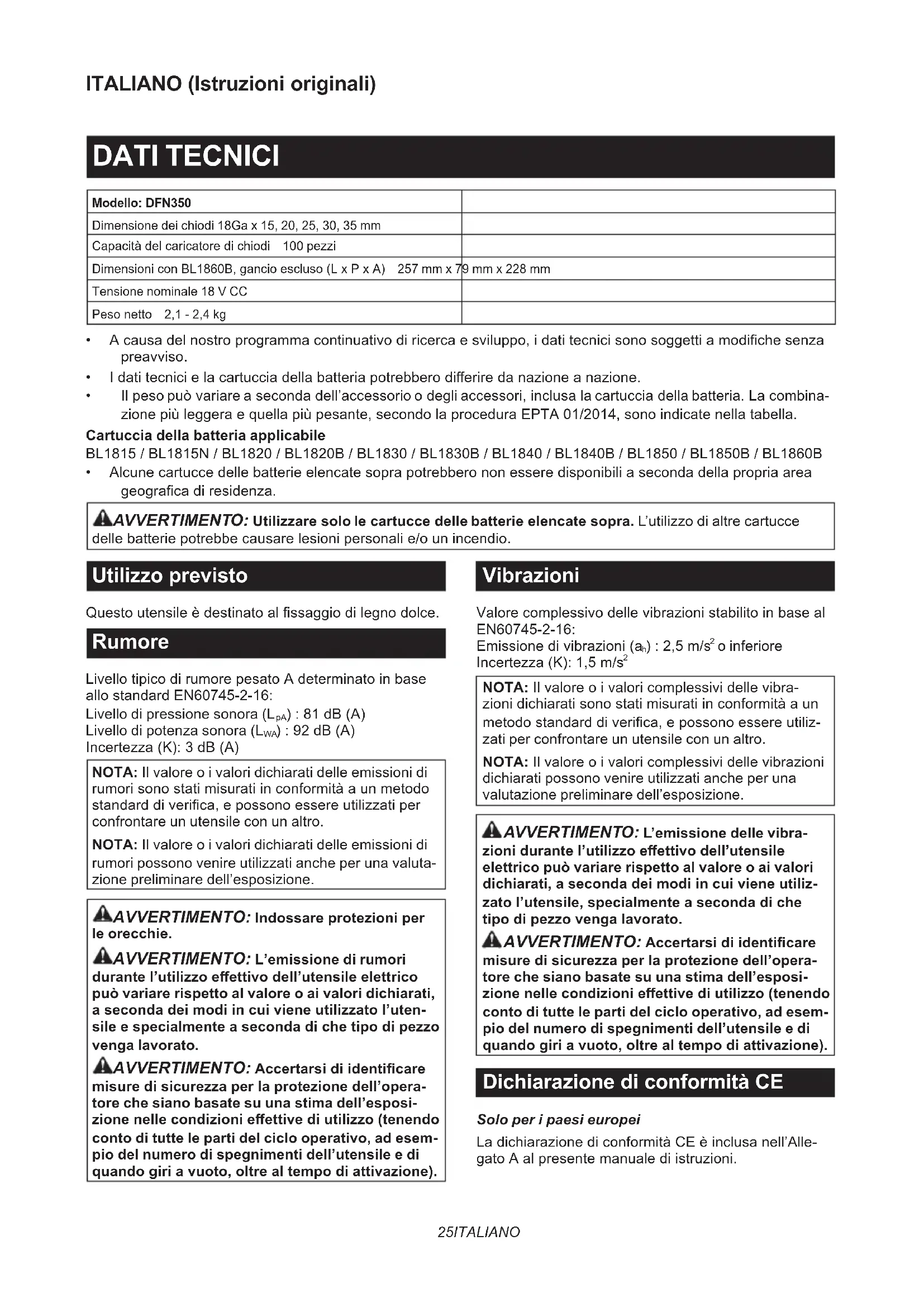 NOTA:Ilvaloreoivaloricomplessividellevibra- zionidichiaratisonostatimisuratiinconformitàaun metodostandarddiverica,epossonoessereutiliz- zati per confrontare un utensile con un altro. NOTA:Ilvaloreoivaloricomplessividellevibrazioni dichiarati possono venire utilizzati anche per una valutazione preliminare dell’esposizione. AVVERTIMENTO: L’emissione delle vibra- zioni durante l’utilizzo eettivo dell’utensile elettrico può variare rispetto al valore o ai valori dichiarati, a seconda dei modi in cui viene utiliz- zato l’utensile, specialmente a seconda di che tipo di pezzo venga lavorato. AVVERTIMENTO: Accertarsi di identicare misure di sicurezza per la protezione dell’opera- tore che siano basate su una stima dell’esposi- zione nelle condizioni eettive di utilizzo (tenendo conto di tutte le parti del ciclo operativo, ad esem- pio del numero di spegnimenti dell’utensile e di quando giri a vuoto, oltre al tempo di attivazione). Dichiarazione di conformità CE Solo per i paesi europei LadichiarazionediconformitàCEèinclusanell’Alle- gatoAalpresentemanualediistruzioni.26 ITALIANO AVVERTENZE DI SICUREZZA Avvertenze generali relative alla sicurezza dell’utensile elettrico AVVERTIMENTO: Leggere tutte le avvertenze di sicurezza, le istruzioni, le illustrazioni e i dati tecnici forniti con il presente utensile elettrico. La mancata osservanza di tutte le istruzioni elencate di seguitopotrebberisultareinscosseelettriche,incendi e/ogravilesionipersonali. Conservare tutte le avvertenze e le istruzioni come riferimento futuro. Iltermine“utensileelettrico”nelleavvertenzesiriferisce siaall’utensileelettrico(cablato)nelfunzionamento alimentato da rete elettrica che all’utensile elettrico (a batteria)nelfunzionamentoalimentatoabatteria. Avvertenze di sicurezza relative alla chiodatrice a batteria