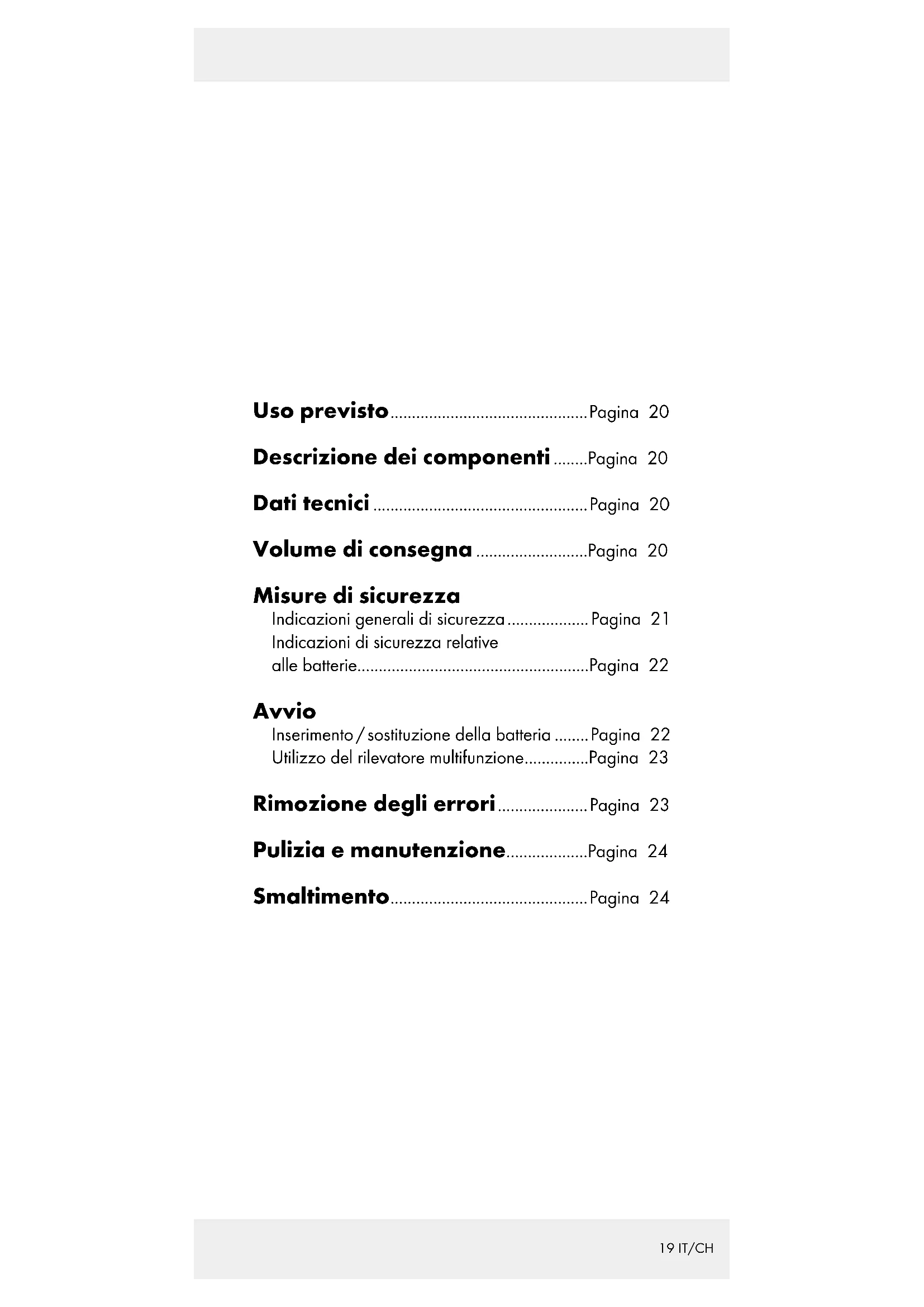 Uso previsto .............................................. Pagina 20 Descrizione dei componenti ........Pagina 20 Dati tecnici ..................................................Pagina 20 Volume di consegna ..........................Pagina 20 Misure di sicurezza Indicazioni generali di sicurezza ................... Pagina 21 Indicazioni di sicurezza relative alle batterie......................................................Pagina 22 Avvio Inserimento / sostituzione della batteria ........Pagina 22 Utilizzo del rilevatore multifunzione ...............Pagina 23 Rimozione degli errori ..................... Pagina 23 Pulizia e manutenzione ...................Pagina 24 Smaltimento ..............................................Pagina 2420 IT/CH Rilevatore multifunzione