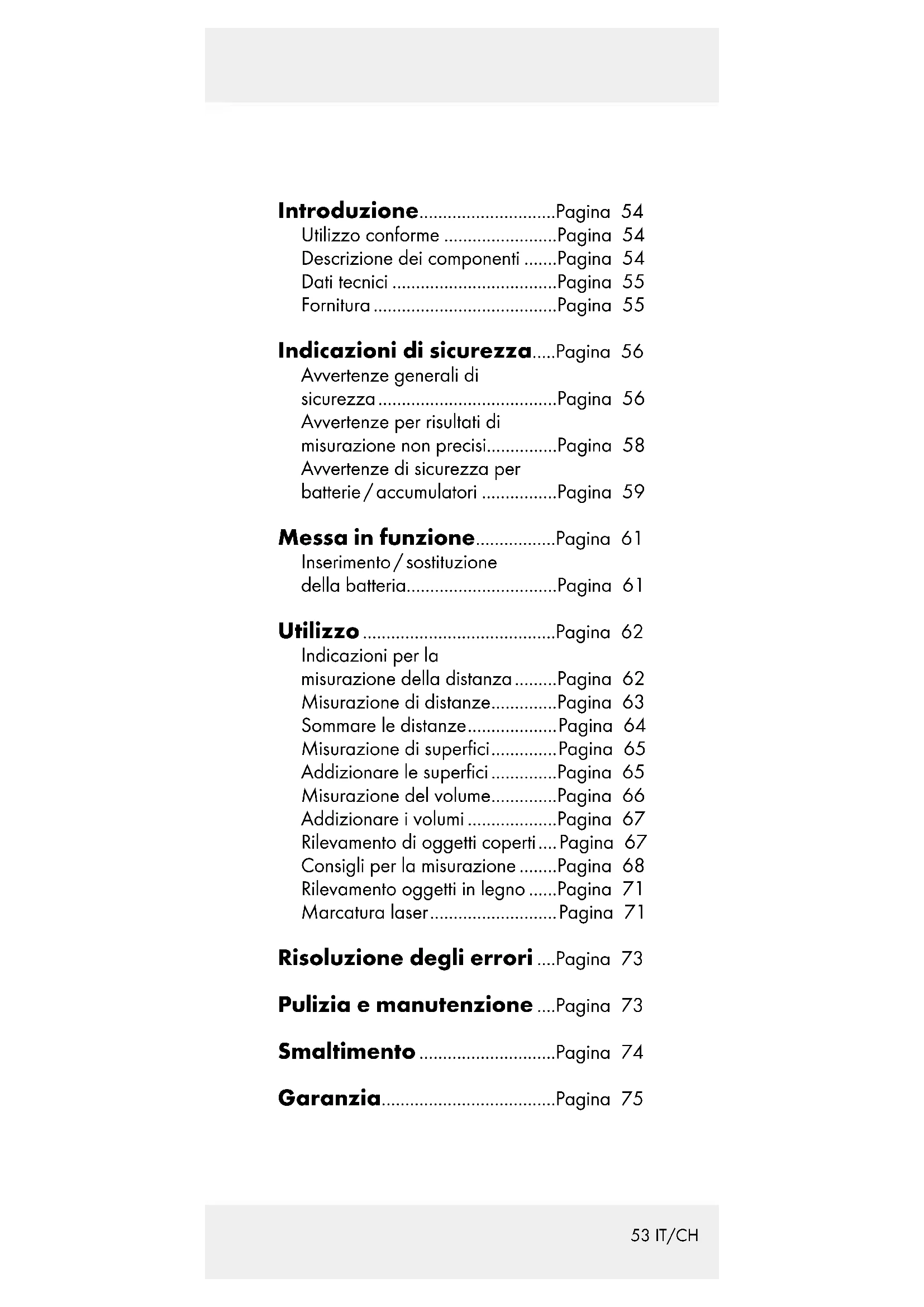 compare un‘avviso sul display. Non tra- panare in nessun caso su questo punto! Pericolo di scossa elettrica! Consigli per la misurazione - È necessario tenere premuto il tasto di calibratura per l‘intero processo di ricerca (calibratura e ricerca). - Non è possibile eseguire la calibratura se essa si effettua troppo vicino all‘og- getto o direttamente su di esso. Qualora non fosse possibile eseguire la calibratura, sul display LCD appare „full intensity“ e viene emesso un lungo segnale acustico. Spostare il prodotto a destra o sinistra di qualche centimetro dal punto dell‘ul- tima calibratura e riprovare. - Ripetere il processo alcune volte per as- sicurarsi che la misurazione sia corretta. - In base alla natura della parete da esa- minare, si possono verificare errori di misurazione. Prima di ogni misurazione è pertanto necessario testare il rilevatore su un montante di legno o metallo, una cavità o una conduttura elettrica di cui sia nota la posizione. Se l‘apparecchio non ne rileva la presenza, il substrato69 IT/CH non è adatto per essere analizzato con questo apparecchio. - Evitare di toccare il display LCD durante la misurazione. Questo potrebbe com- promettere la precisione del prodotto. - Prestare attenzione poiché anche le condutture elettriche possono essere rile- vate come metallo o montanti. Utilizzare sempre la funzione di ricerca della ten- sione per escludere errori. - Si noti anche che nella funzione di ricerca montanti „STUD“, il rilevatore localizza anche i montanti di metallo. Per essere sicuri che il montante individuato non sia in metallo (o ad esempio un tubo dell‘acqua), utilizzare anche la funzione di ricerca metalli „METAL“. - A seconda dello spessore della parete e del materiale, è possibile che il rilevatore segnali la presenza di un oggetto ancora prima di trovarsi direttamente su di esso. In questo caso, contrassegnare l‘inizio e la fine dell‘area segnalata nell‘intaglio della testina di misurazione. Il centro dell‘oggetto ricercato si trova quindi a metà tra le due tacche di riferimento contrassegnate. - Il rilevamento di oggetti metallici è mi- gliore quanto più essi sono magnetizza- bili. Per questo motivo, il ferro può essere localizzato a distanze maggiori rispetto, ad esempio, al rame. - Le condutture elettriche possono essere individuate solo se conducono tensione. È pertanto necessario che gli interruttori della luce siano sempre accesi in modo che il cavo che parte da essi conduca70 IT/CH tensione. Allo stesso modo, tutti i fusibili devono essere avvitati e attivati. Tenere presente che è possibile rilevare sola- mente le tensioni di 230 V