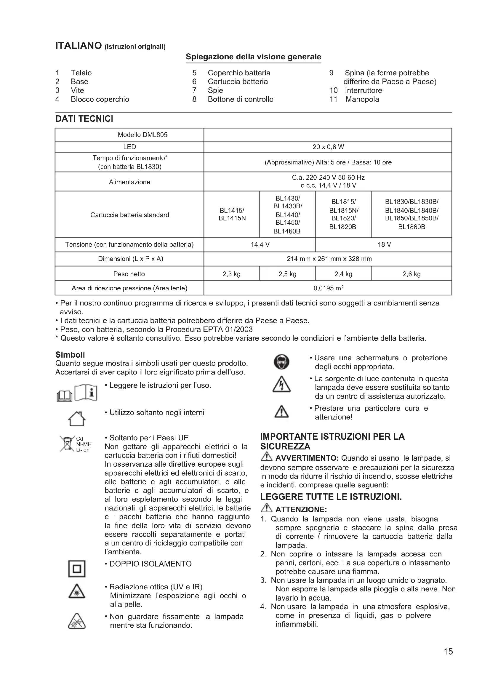 come in presenza di liquidi, gas o polvere inammabili. Modello DML805 LED 20 x 0,6 W Tempo di funzionamento* (con batteria BL1830) (Approssimativo) Alta: 5 ore / Bassa: 10 ore Alimentazione C.a. 220-240 V 50-60 Hz o c.c. 14,4 V / 18 V Cartuccia batteria standard BL1415/ BL1415N BL1430/ BL1430B/ BL1440/ BL1450/ BL1460B BL1815/ BL1815N/ BL1820/ BL1820B BL1830/BL1830B/ BL1840/BL1840B/ BL1850/BL1850B/ BL1860B Tensione (con funzionamento della batteria) 14,4 V 18 V Dimensioni (L x P x A) 214 mm x 261 mm x 328 mm Peso netto 2,3 kg 2,5 kg 2,4 kg 2,6 kg Area di ricezione pressione (Area lente) 0,0195 m