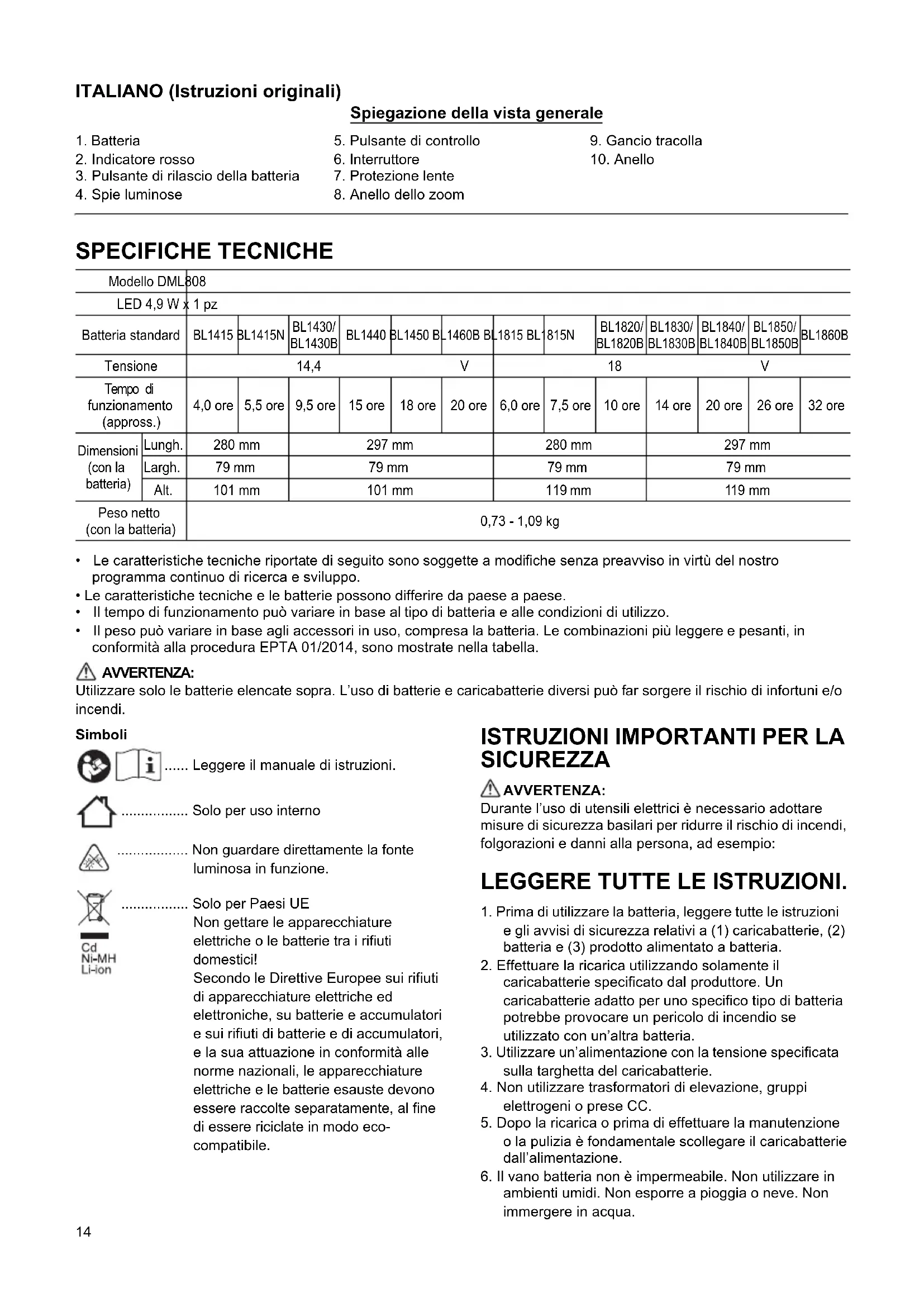 - Il peso può variare in base agli accessori in uso, compresa la batteria. Le combinazioni più leggere e pesanti, in conformità alla procedura EPTA 01/2014, sono mostrate nella tabella. AVVERTENZA: Utilizzare solo le batterie elencate sopra. L’uso di batterie e caricabatterie diversi può far sorgere il rischio di infortuni e/o incendi. Simboli ...... Leggere il manuale di istruzioni. ................. Solo per uso interno .................. Non guardare direttamente la fonte luminosa in funzione. ................. Solo per Paesi UE Non gettare le apparecchiature elettriche o le batterie tra i rifiuti domestici! Secondo le Direttive Europee sui rifiuti di apparecchiature elettriche ed elettroniche, su batterie e accumulatori e sui rifiuti di batterie e di accumulatori, e la sua attuazione in conformità alle norme nazionali, le apparecchiature elettriche e le batterie esauste devono essere raccolte separatamente, al fine di essere riciclate in modo eco- compatibile.