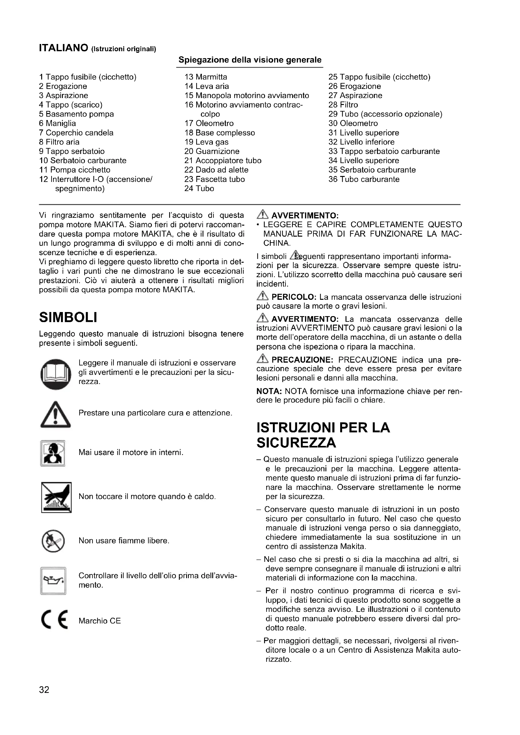 SICUREZZA – Questo manuale di istruzioni spiega l’utilizzo generale e le precauzioni per la macchina. Leggere attenta- mente questo manuale di istruzioni prima di far funzio- nare la macchina. Osservare strettamente le norme per la sicurezza. – Conservare questo manuale di istruzioni in un posto sicuro per consultarlo in futuro. Nel caso che questo manuale di istruzioni venga perso o sia danneggiato, chiedere immediatamente la sua sostituzione in un centro di assistenza Makita. – Nel caso che si presti o si dia la macchina ad altri, si deve sempre consegnare il manuale di istruzioni e altri materiali di informazione con la macchina. – Per il nostro continuo programma di ricerca e svi- luppo, i dati tecnici di questo prodotto sono soggette a modifiche senza avviso. Le illustrazioni o il contenuto di questo manuale potrebbero essere diversi dal pro- dotto reale. – Per maggiori dettagli, se necessari, rivolgersi al riven- ditore locale o a un Centro di Assistenza Makita auto- rizzato. Leggere il manuale di istruzioni e osservare gli avvertimenti e le precauzioni per la sicu- rezza. Prestare una particolare cura e attenzione. Mai usare il motore in interni. Non toccare il motore quando è caldo. Non usare fiamme libere. Controllare il livello dell’olio prima dell’avvia- mento. Marchio CE33 Scopo prefissato della macchina Questa macchina è progettata soltanto per l’innaffia- mento o per l’irrigazione dell’acqua. Questa macchina deve essere usata soltanto per pom- pare acqua pulita. PERICOLO:
