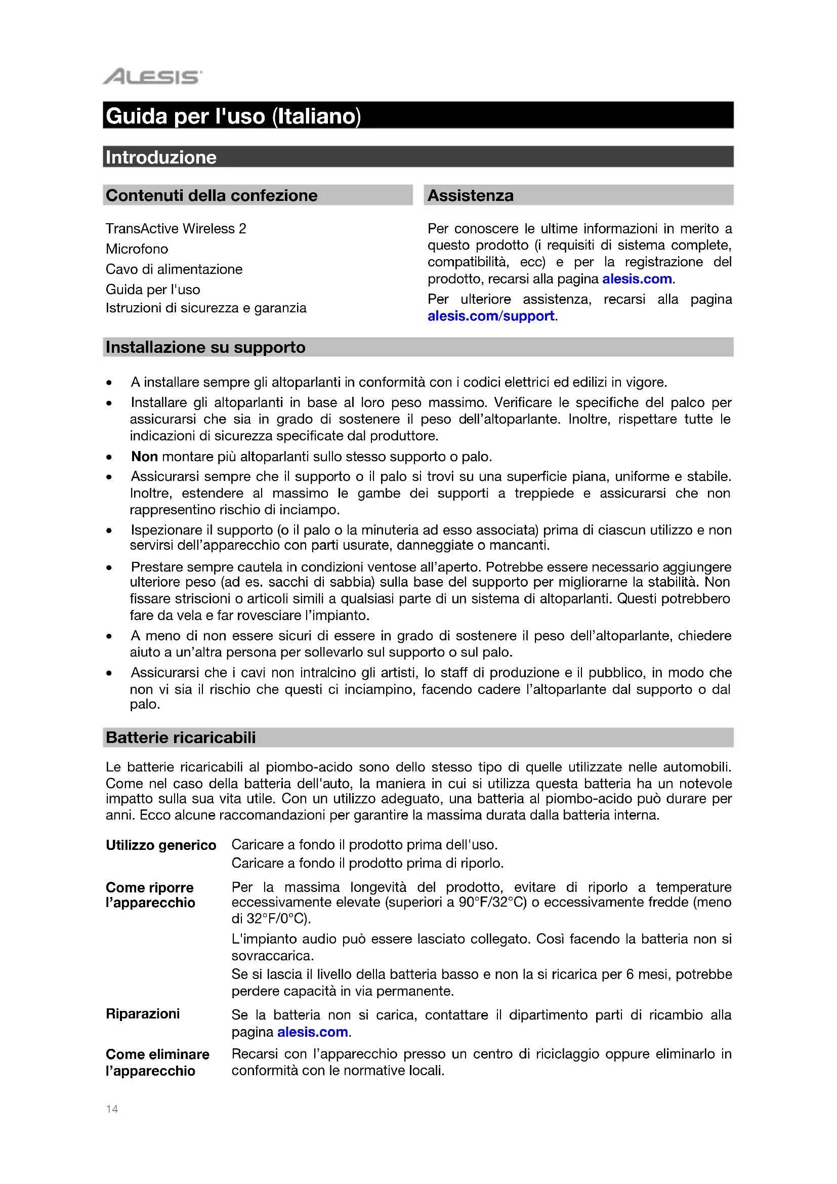 Scarica le istruzioni per il tuo Altoparlante in formato PDF gratuitamente! Trova il tuo manuale TransActive Wireless 2 - ALESIS e riprendi in mano il tuo dispositivo elettronico. In questa pagina sono pubblicati tutti i documenti necessari per l'utilizzo del tuo dispositivo. TransActive Wireless 2 del marchio ALESIS.