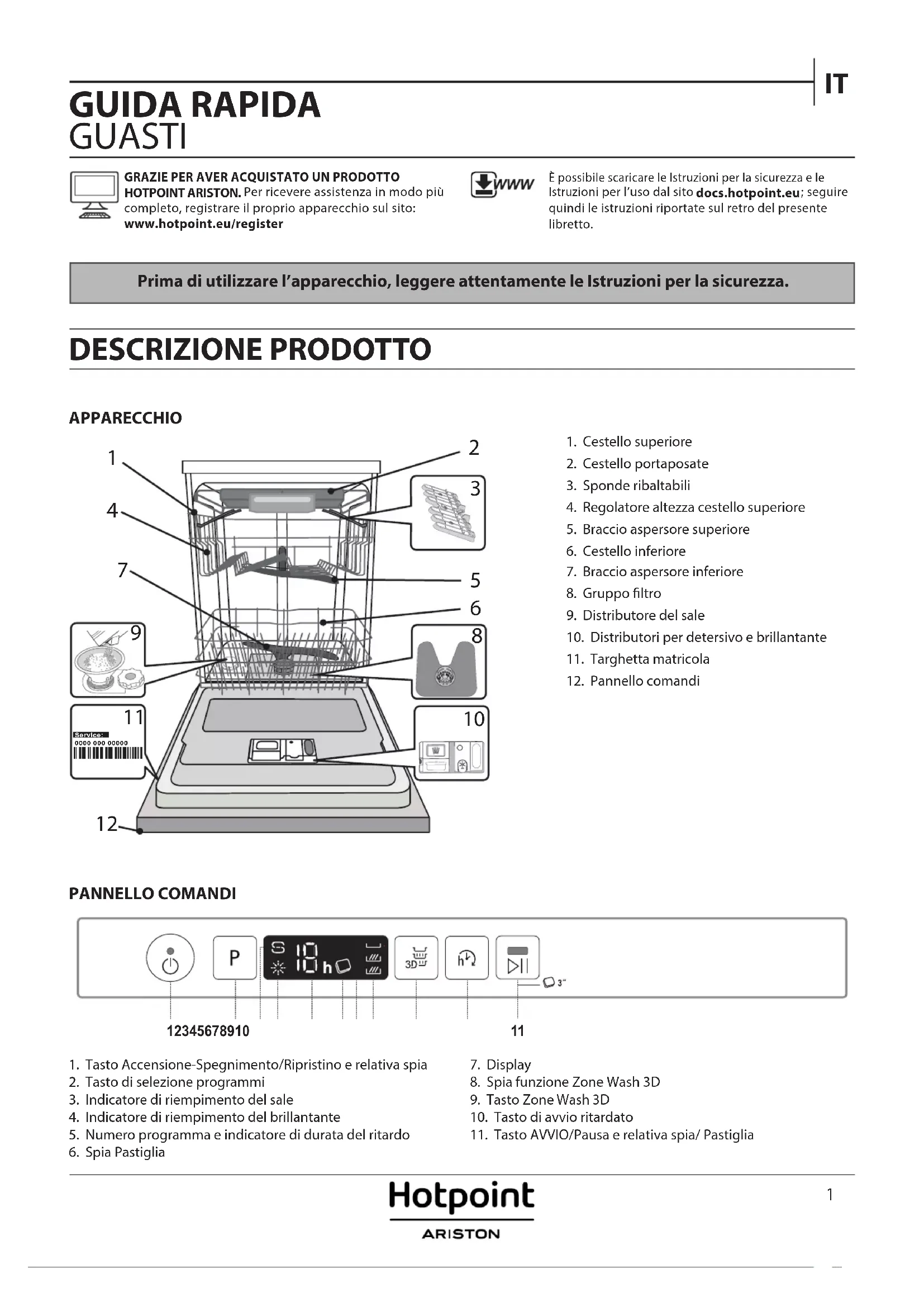 APPARECCHIO GUIDA RAPIDA GUASTI PANNELLO COMANDI GRAZIE PER AVER ACQUISTATO UN PRODOTTO HOTPOINT ARISTON Per ricevere assistenza in modo più completo, registrare il proprio apparecchio sul sito: www.hotpoint.eu/registerÈ possibile scaricare le Istruzioni per la sicurezza e le Istruzioni per l’uso dal sito docs.hotpoint.eu; seguire quindi le istruzioni riportate sul retro del presente libretto.1. Tasto Accensione-Spegnimento/Ripristino e relativa spia2. Tasto di selezione programmi3. Indicatore di riempimento del sale4. Indicatore di riempimento del brillantante5. Numero programma e indicatore di durata del ritardo6. Spia Pastiglia7. Display8. Spia funzione Zone Wash 3D9. Tasto Zone Wash 3D10. Tasto di avvio ritardato11. Tasto AVVIO/Pausa e relativa spia/ Pastiglia Prima di utilizzare l’apparecchio, leggere attentamente le Istruzioni per la sicurezza. 1. Cestello superiore2. Cestello portaposate3. Sponde ribaltabili4. Regolatore altezza cestello superiore5. Braccio aspersore superiore6. Cestello inferiore7. Braccio aspersore inferiore8. Gruppo ltro9. Distributore del sale10. Distributori per detersivo e brillantante11. Targhetta matricola12. Pannello comandi0000 000 00000 Service: